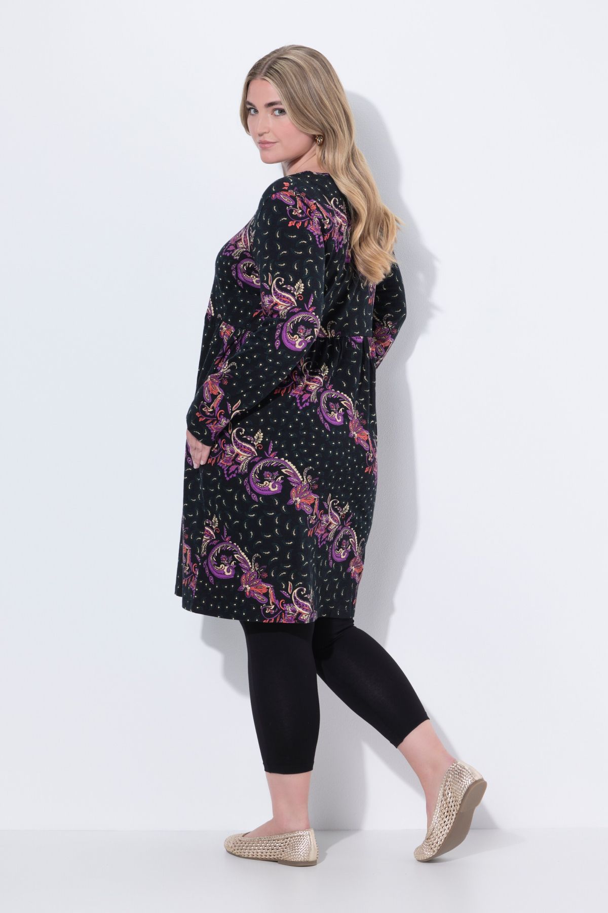 Рокля със завъртян пейзли принт в свежи цветове. С А - линия на силуета и странични шевови джобове. С кръгло деколте с цепка. От мека, памучна материя.