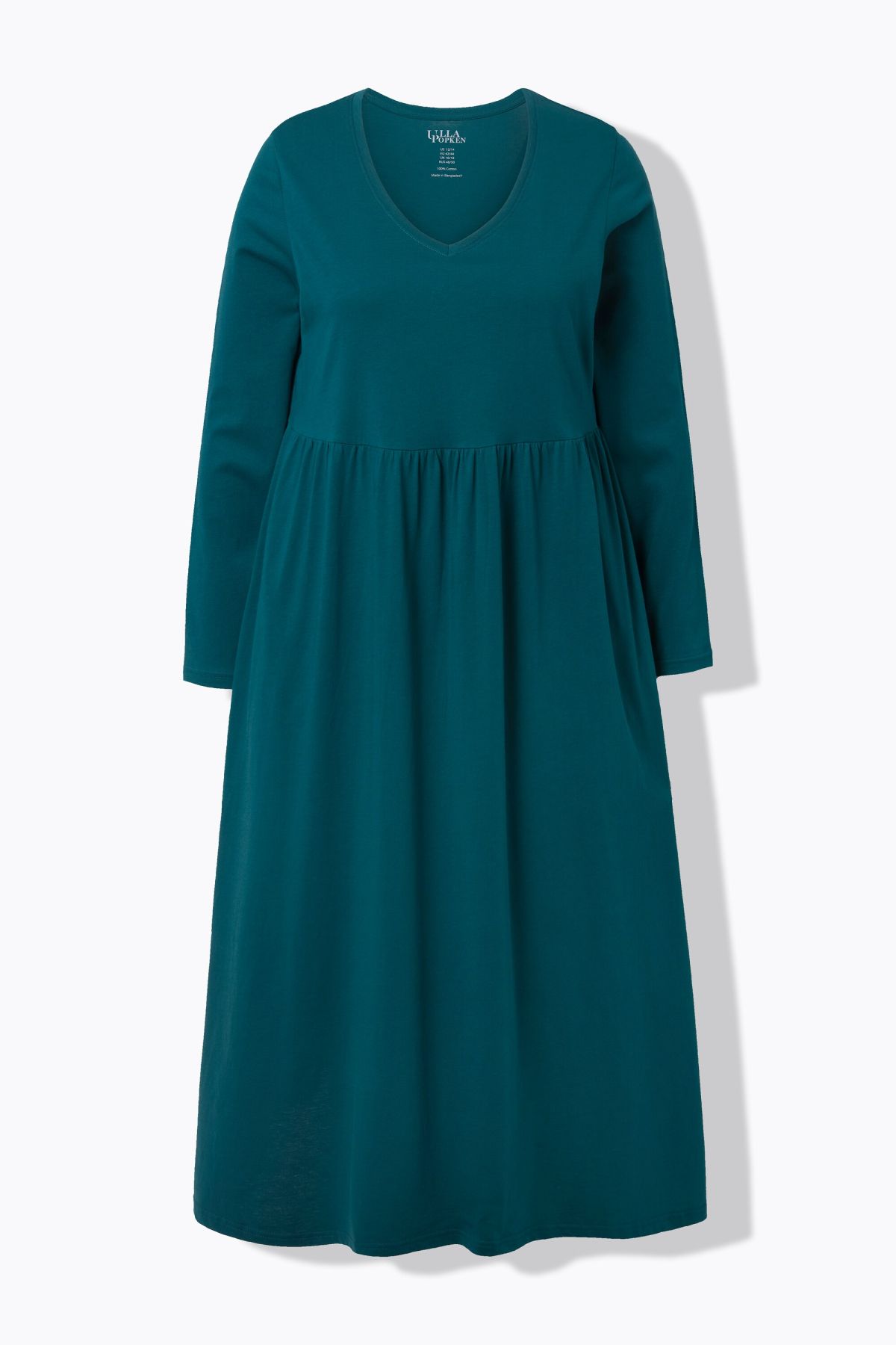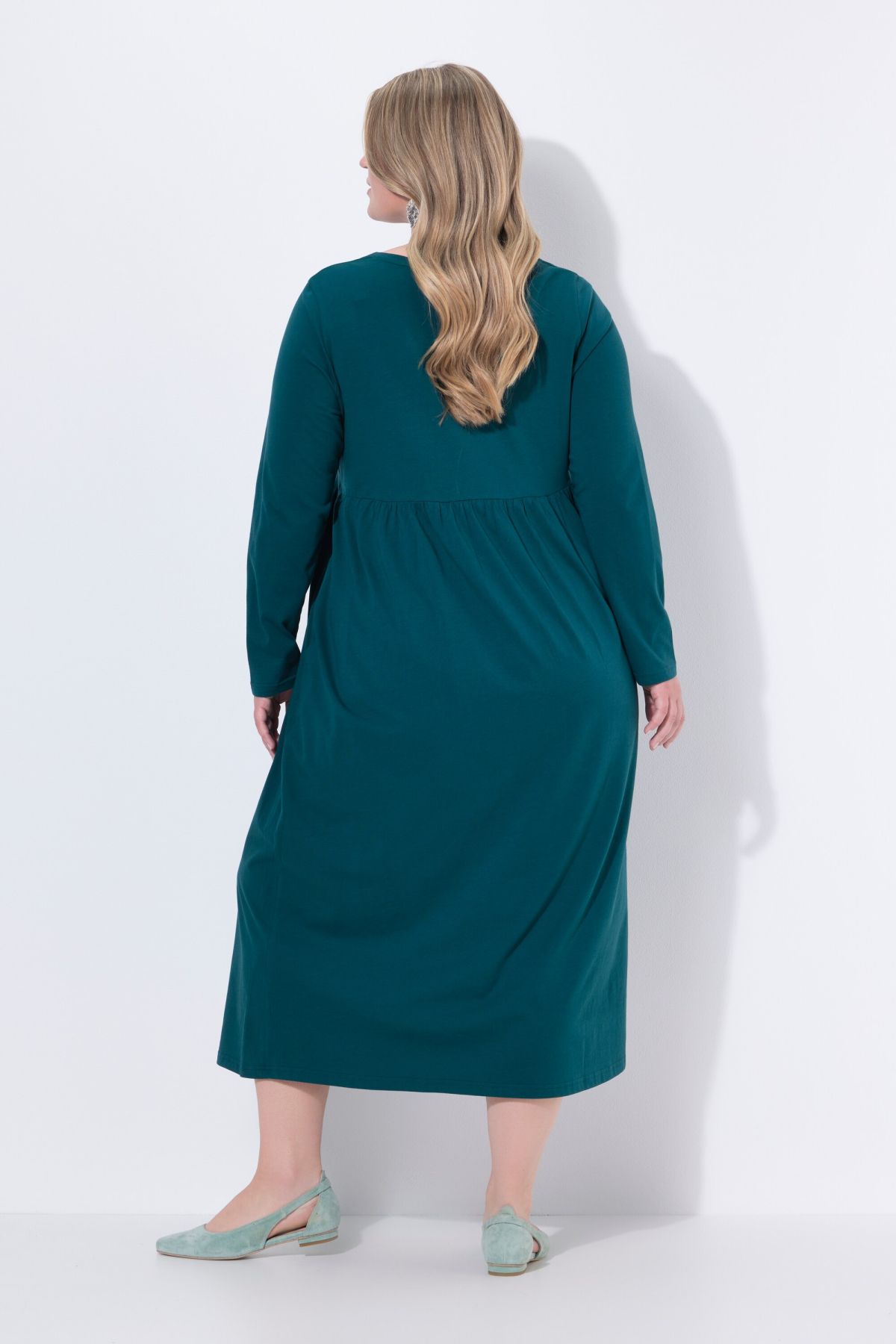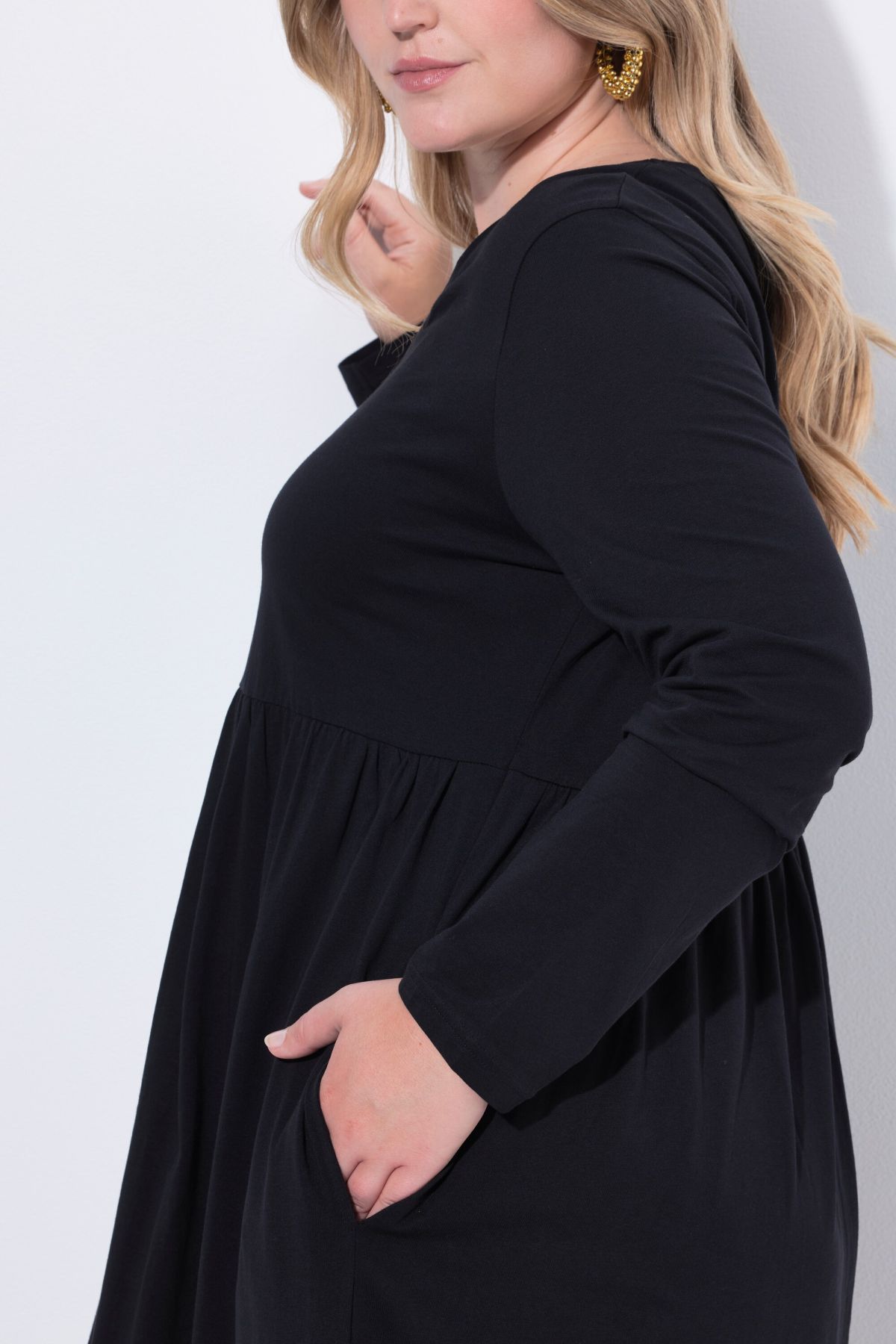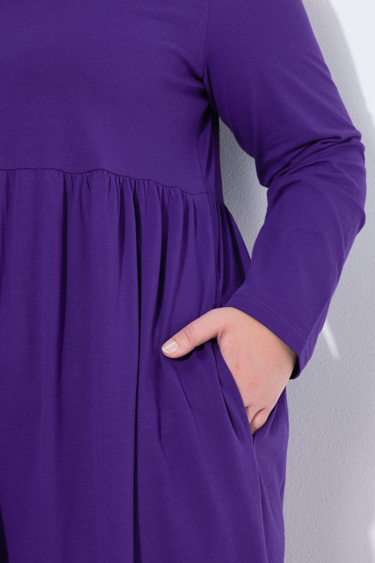 Рокля от мека, памучна материя с кръгло деколте. С шевов акцент на талията и набрани детайли. С дълги ръкави и странични джобове.