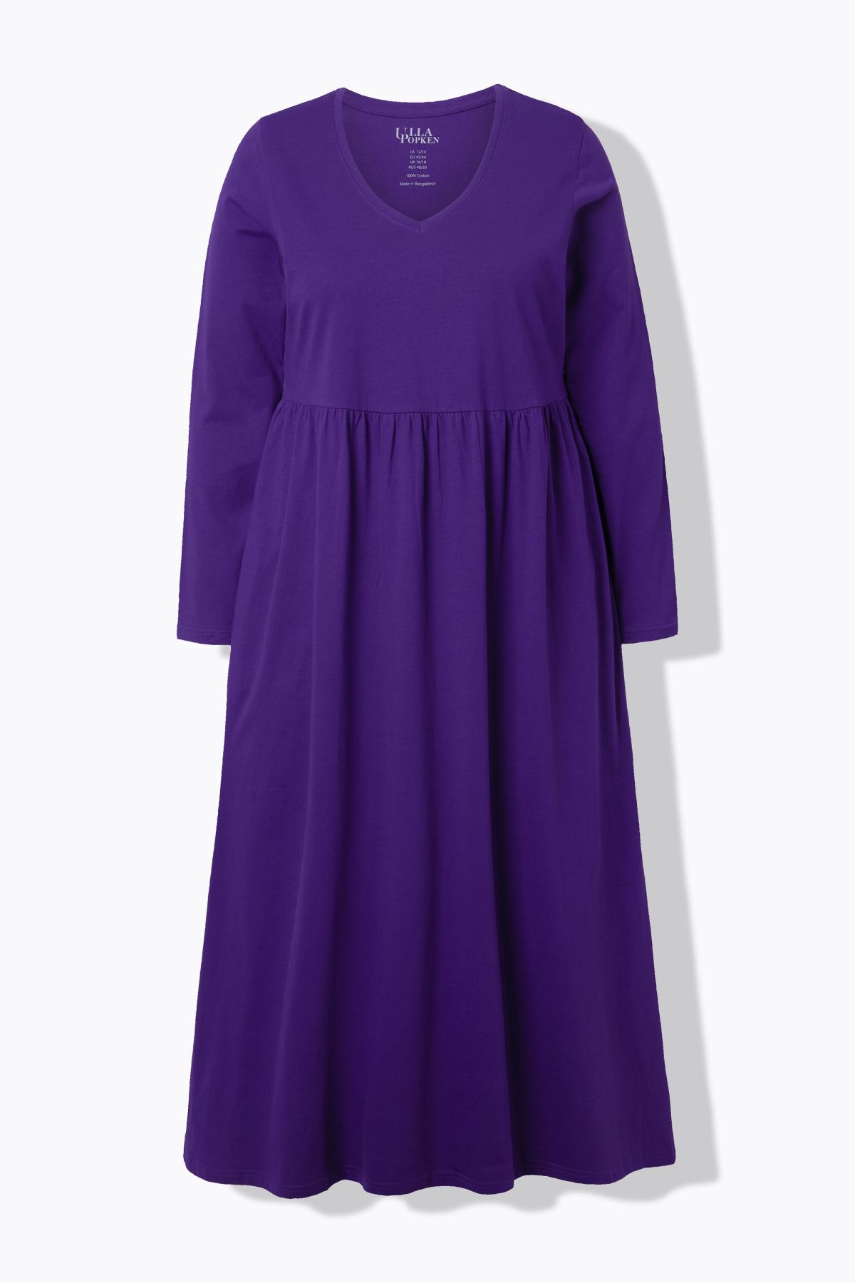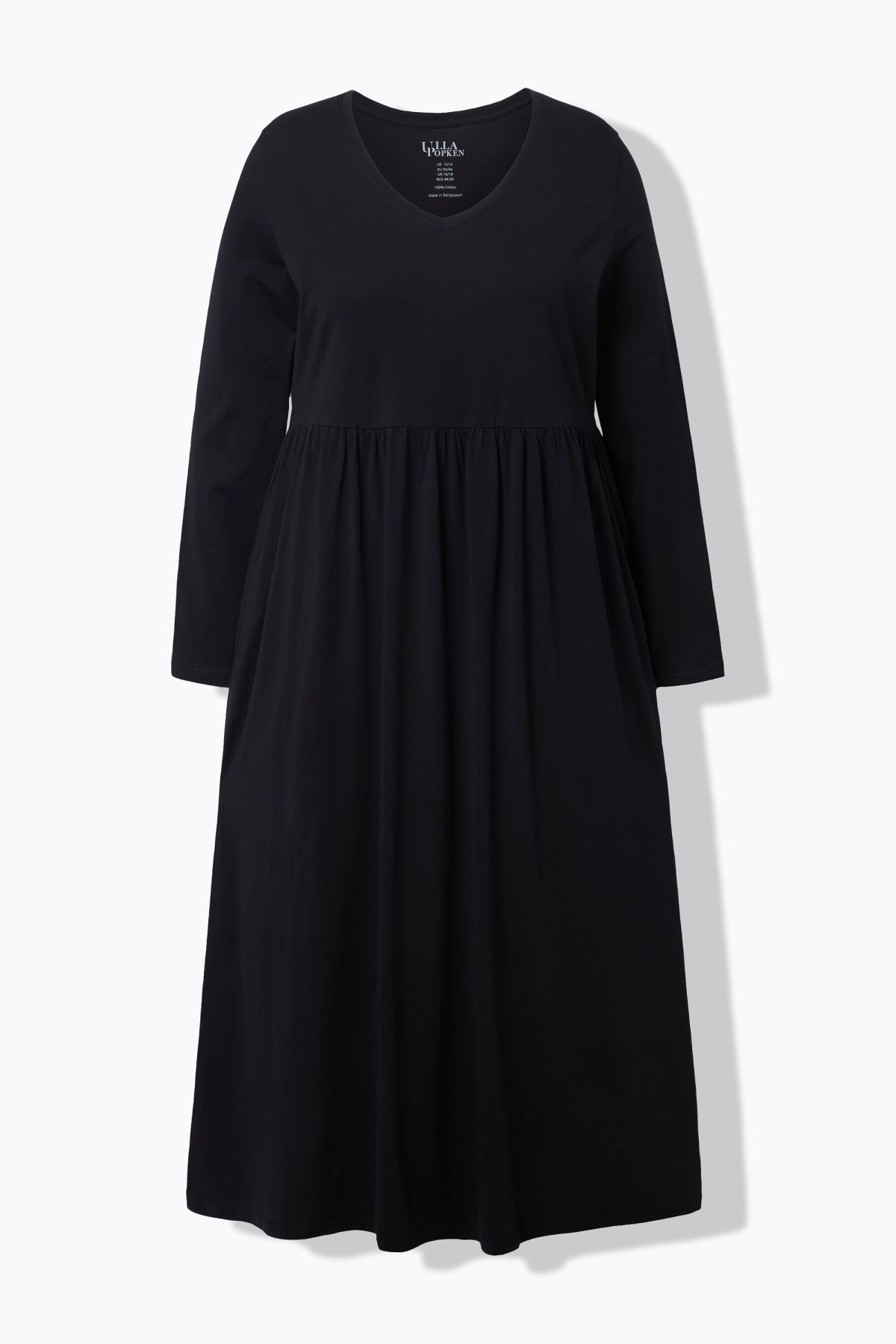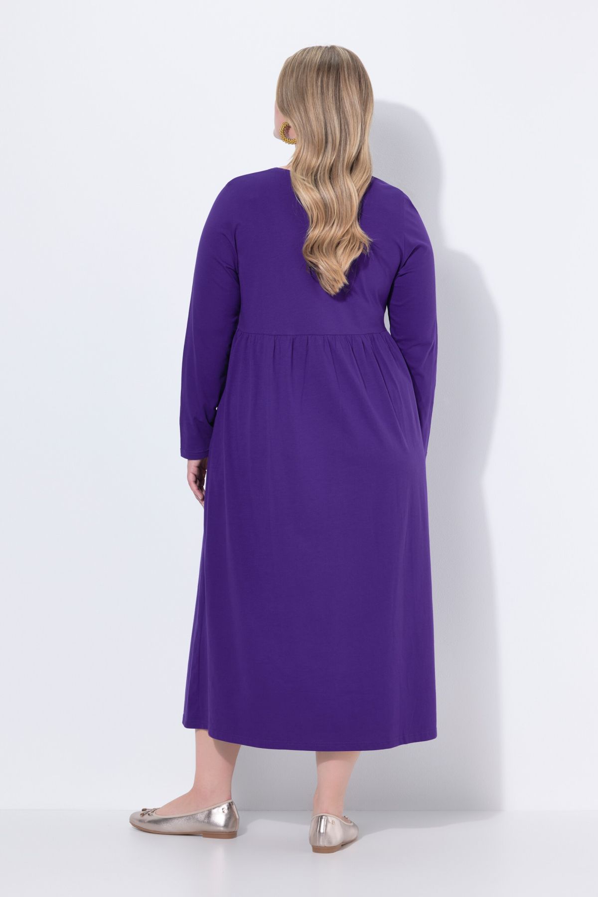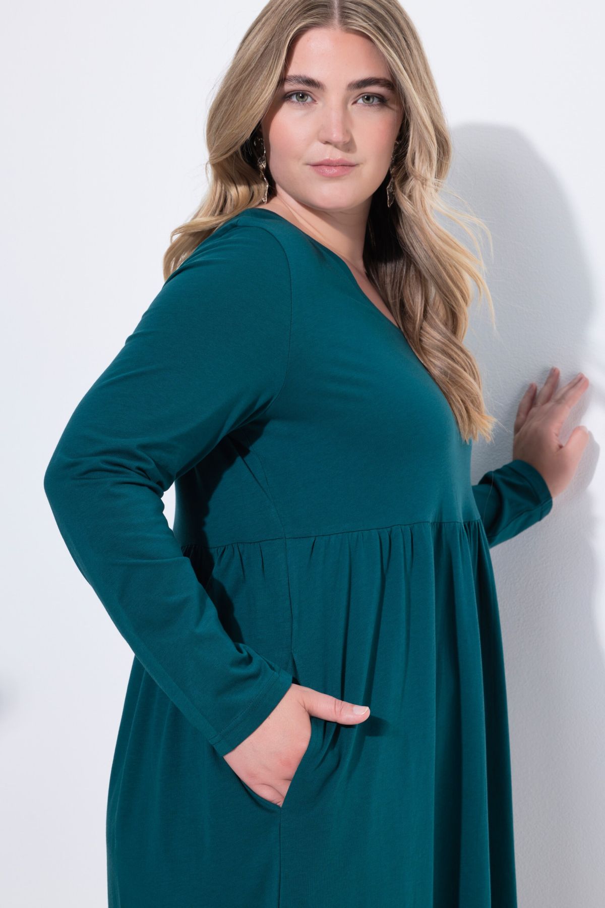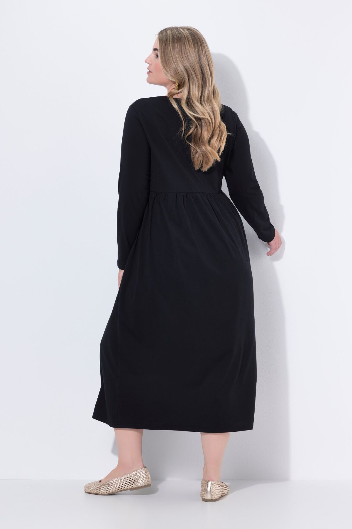 Рокля от мека, памучна материя с кръгло деколте. С шевов акцент на талията и набрани детайли. С дълги ръкави и странични джобове.