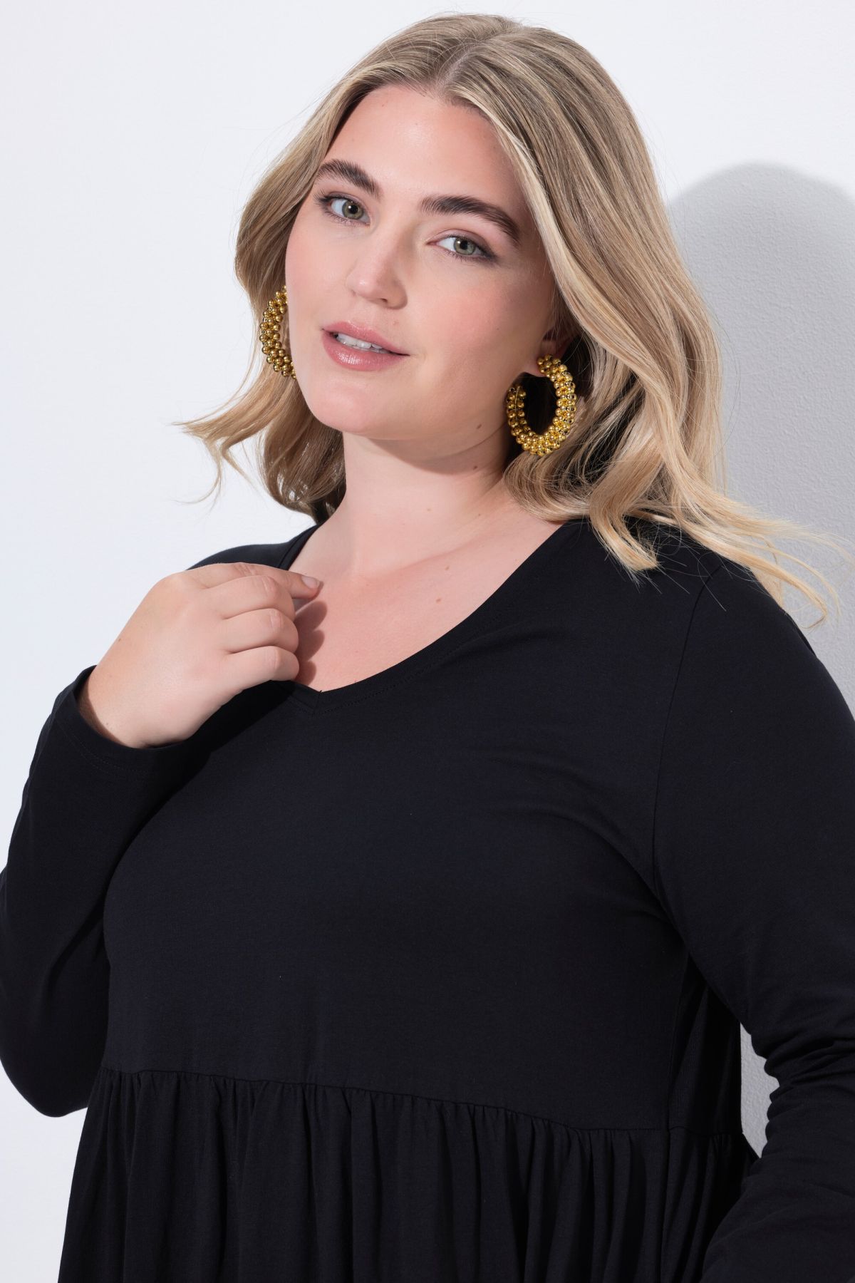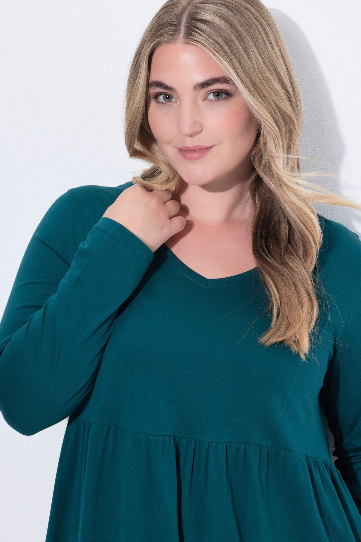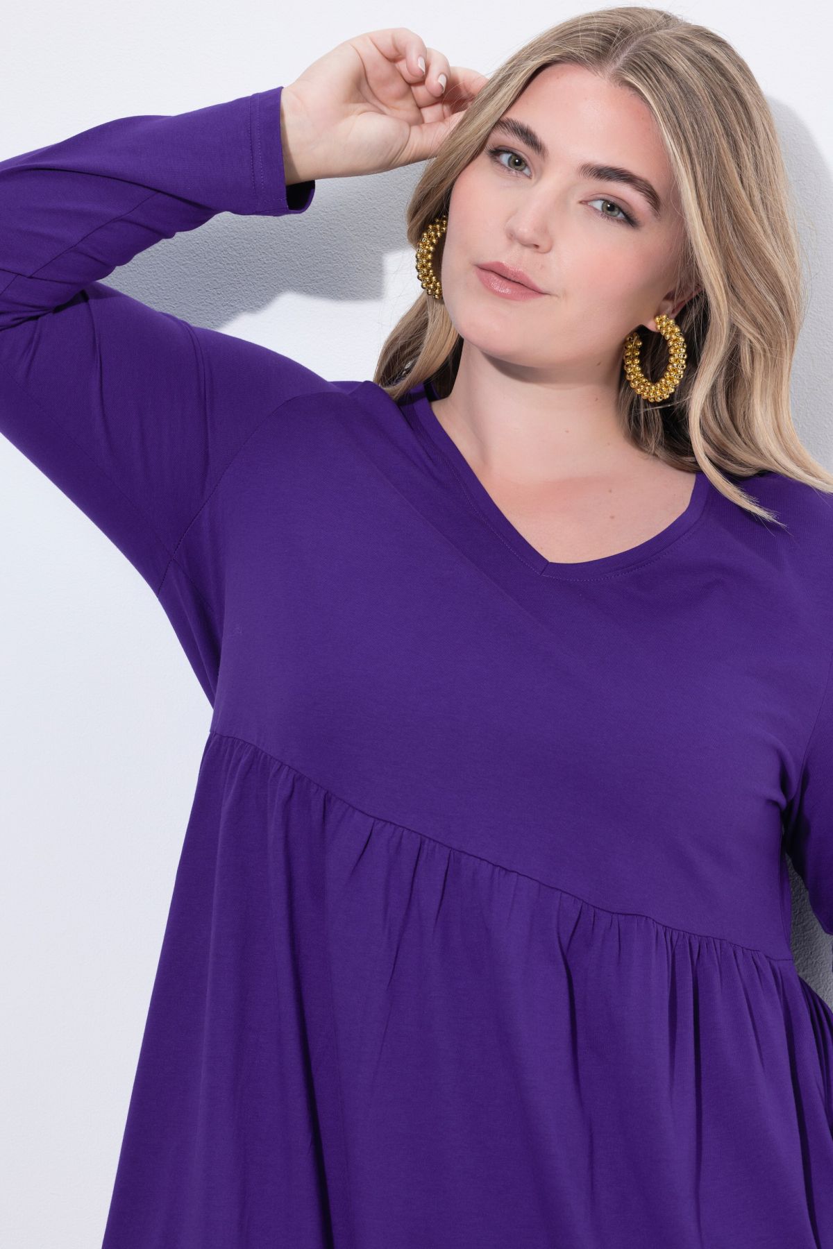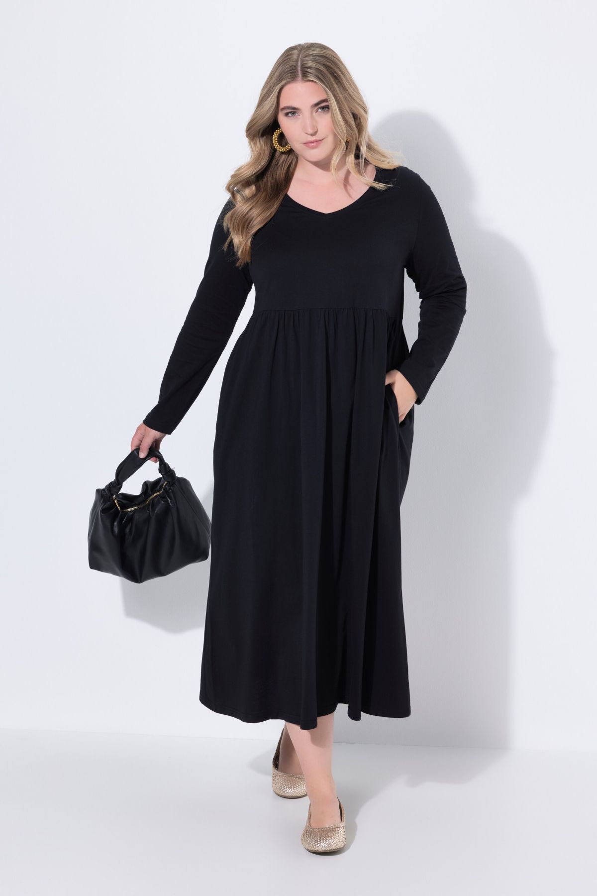 Рокля от мека, памучна материя с кръгло деколте. С шевов акцент на талията и набрани детайли. С дълги ръкави и странични джобове.