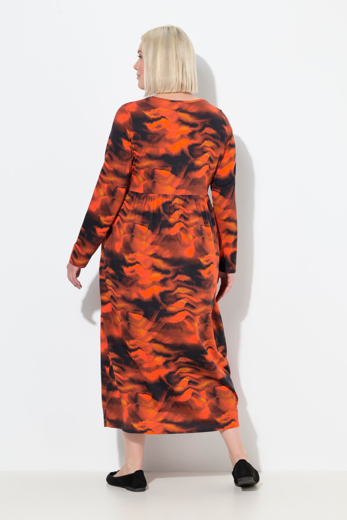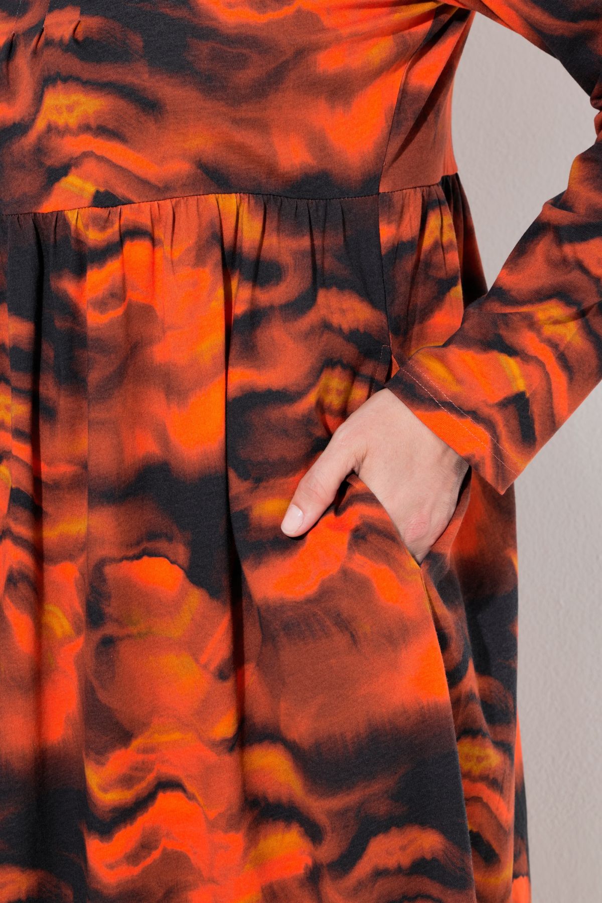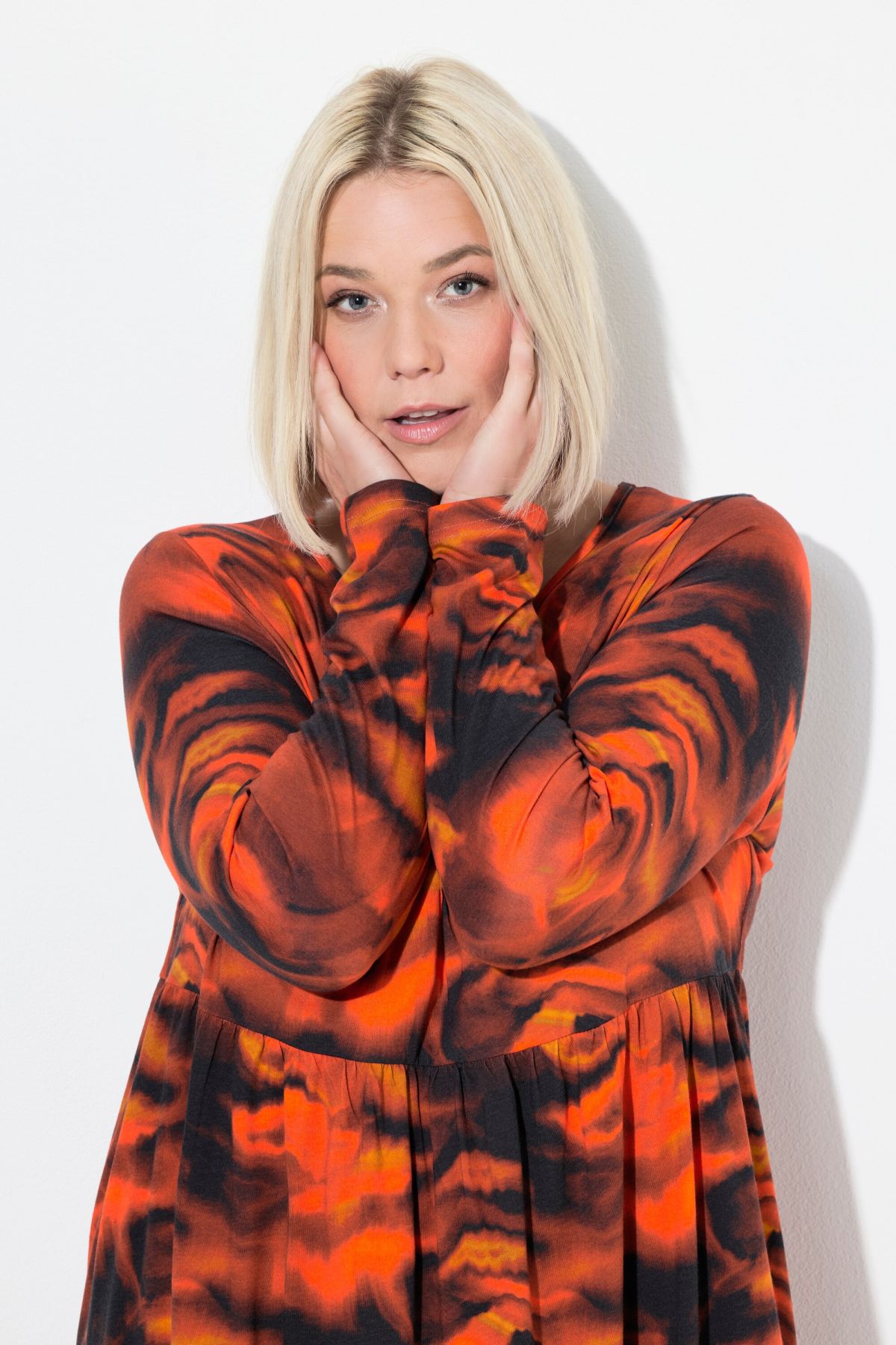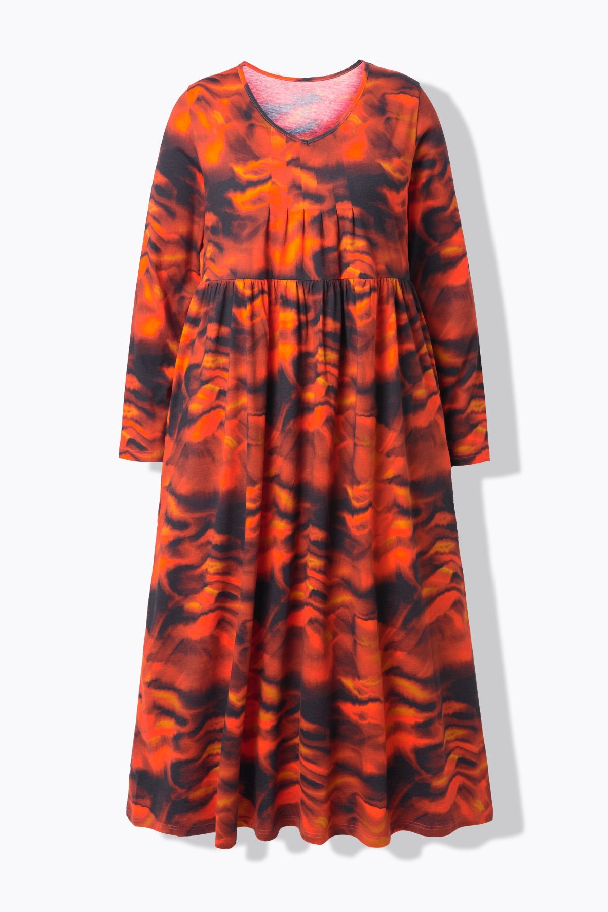 Рокля с принт на вълни от мека, памучна материя. С А - линия на силуета, странични джобове и кръгло деколте. С дълги ръкави.