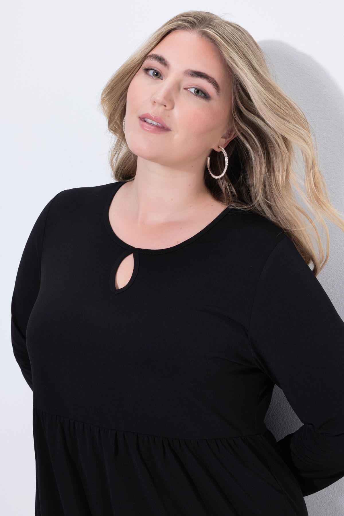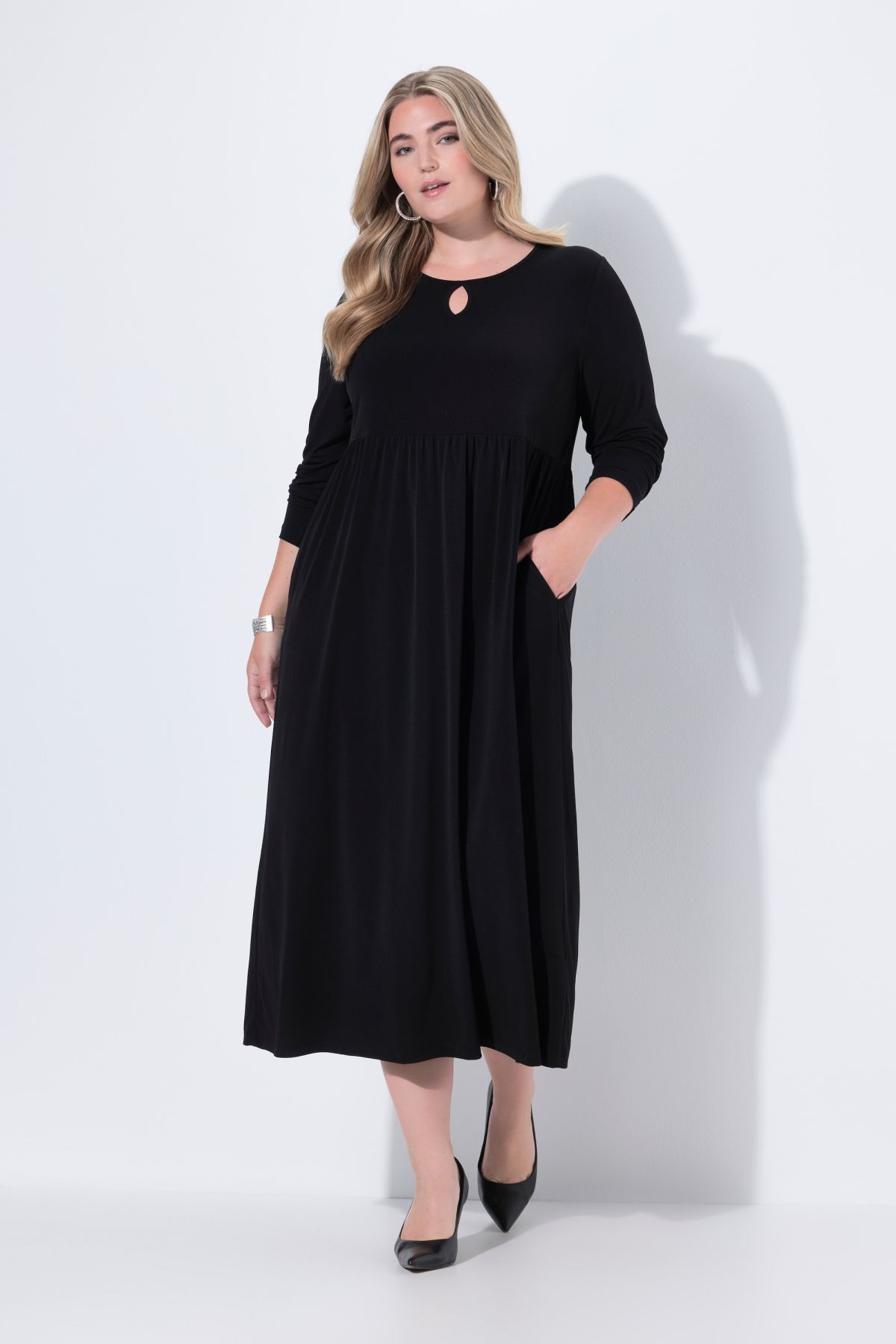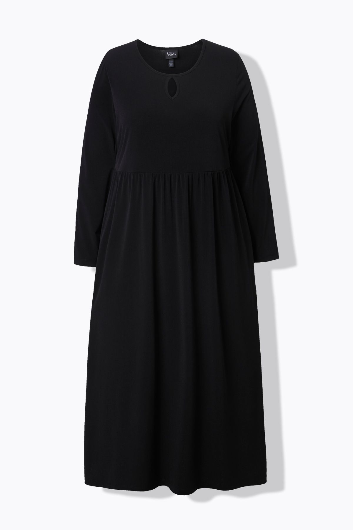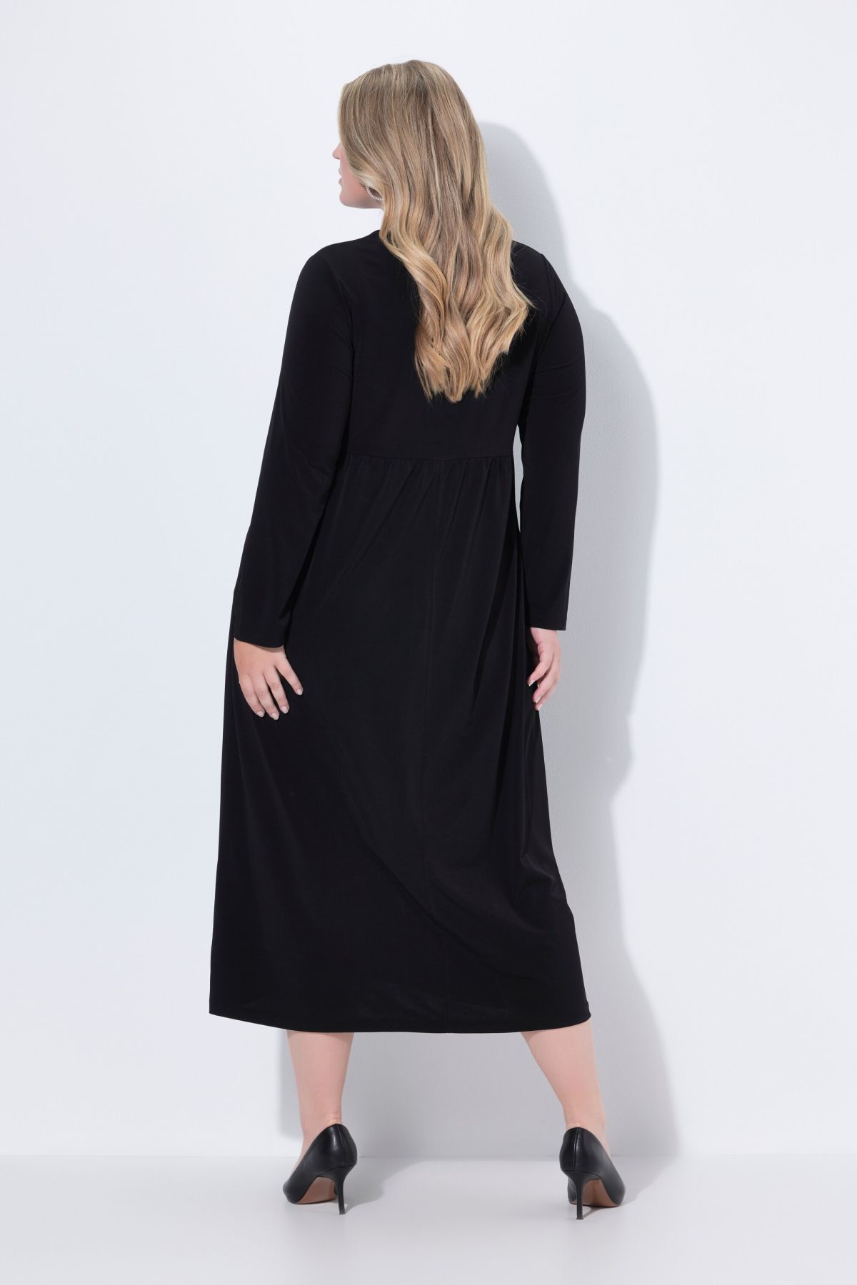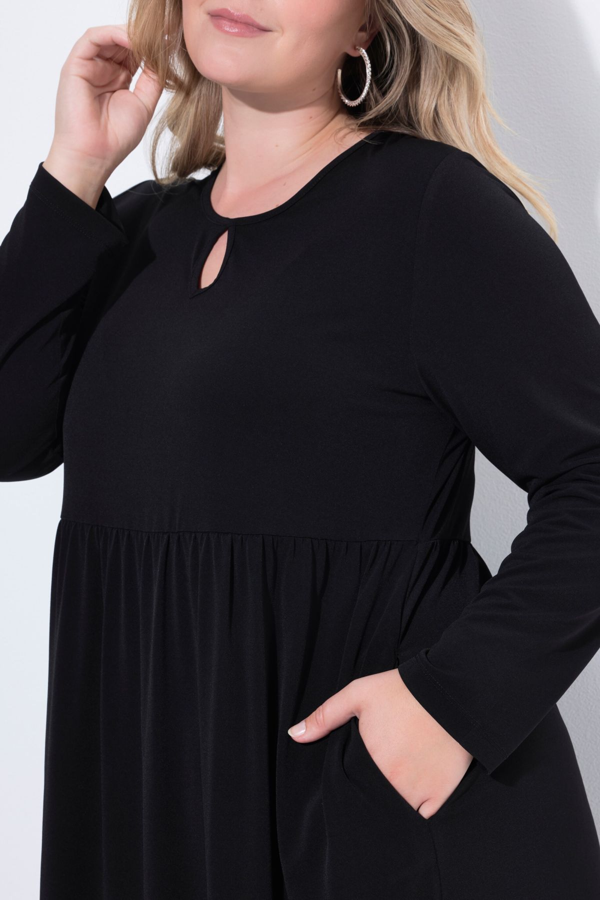 Едноцветна рокля от мека, трикотажна материя. С кръгло деколте с цепка, шевов акцент с разкроение на талията, странични шевови джобове и дълги ръкави. С А -линия на силуета