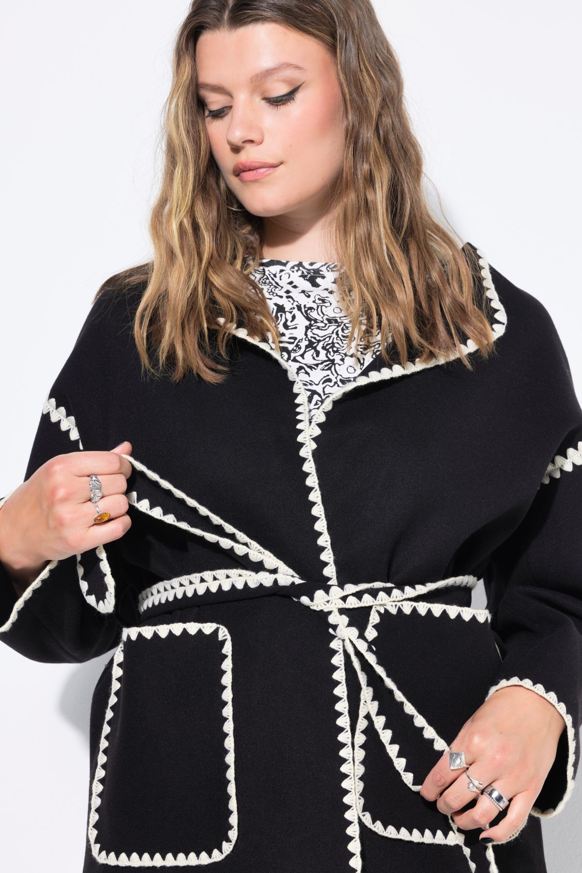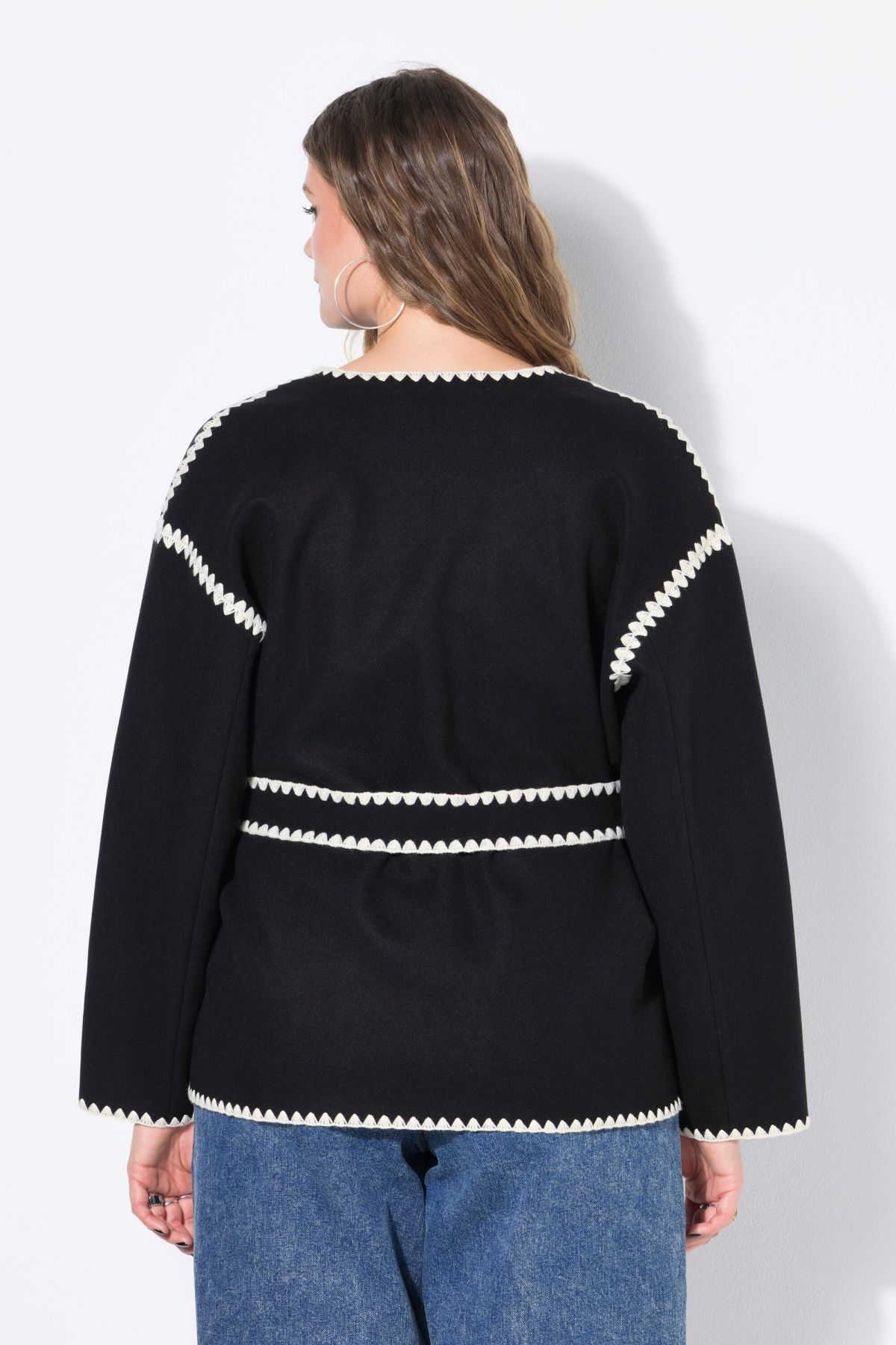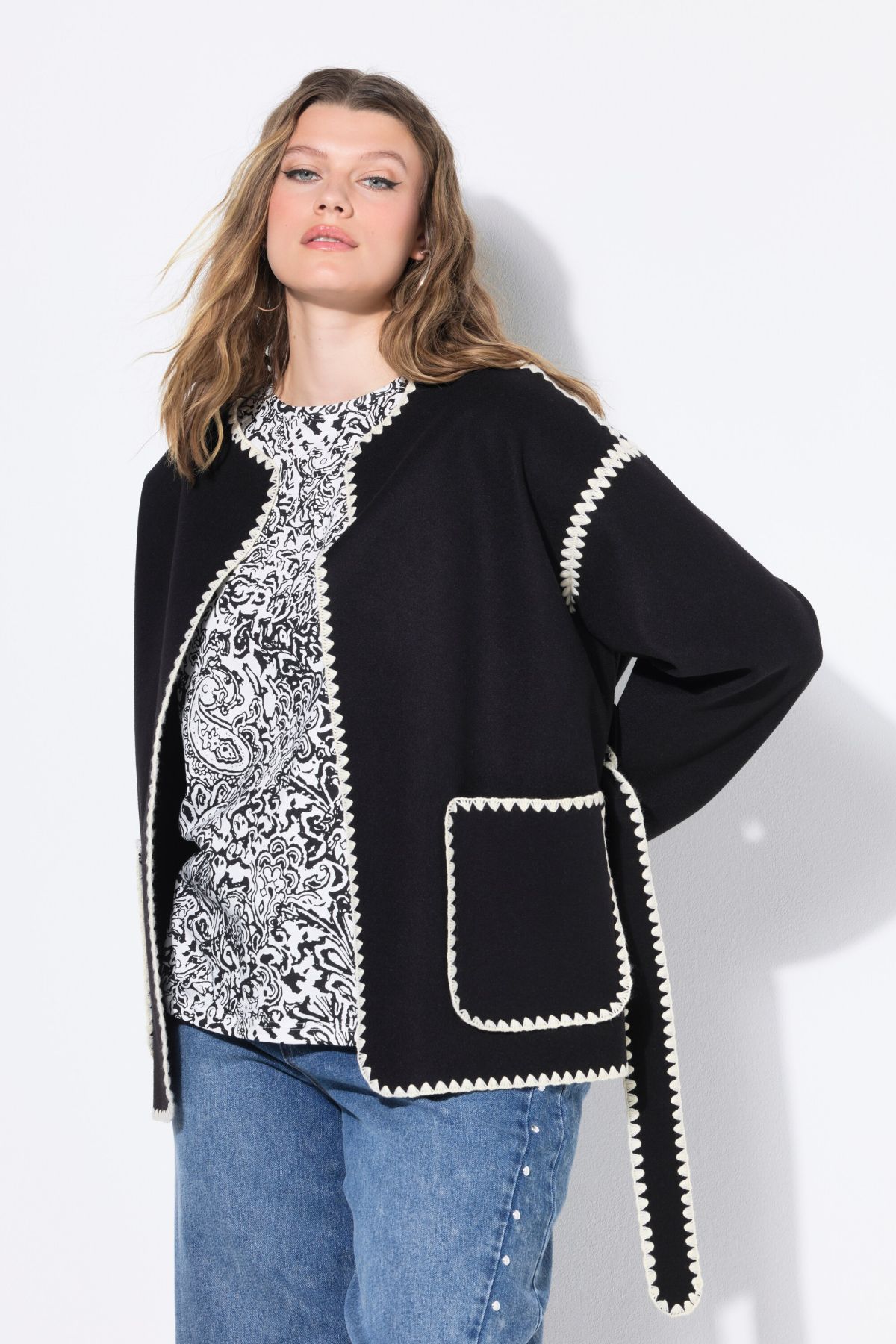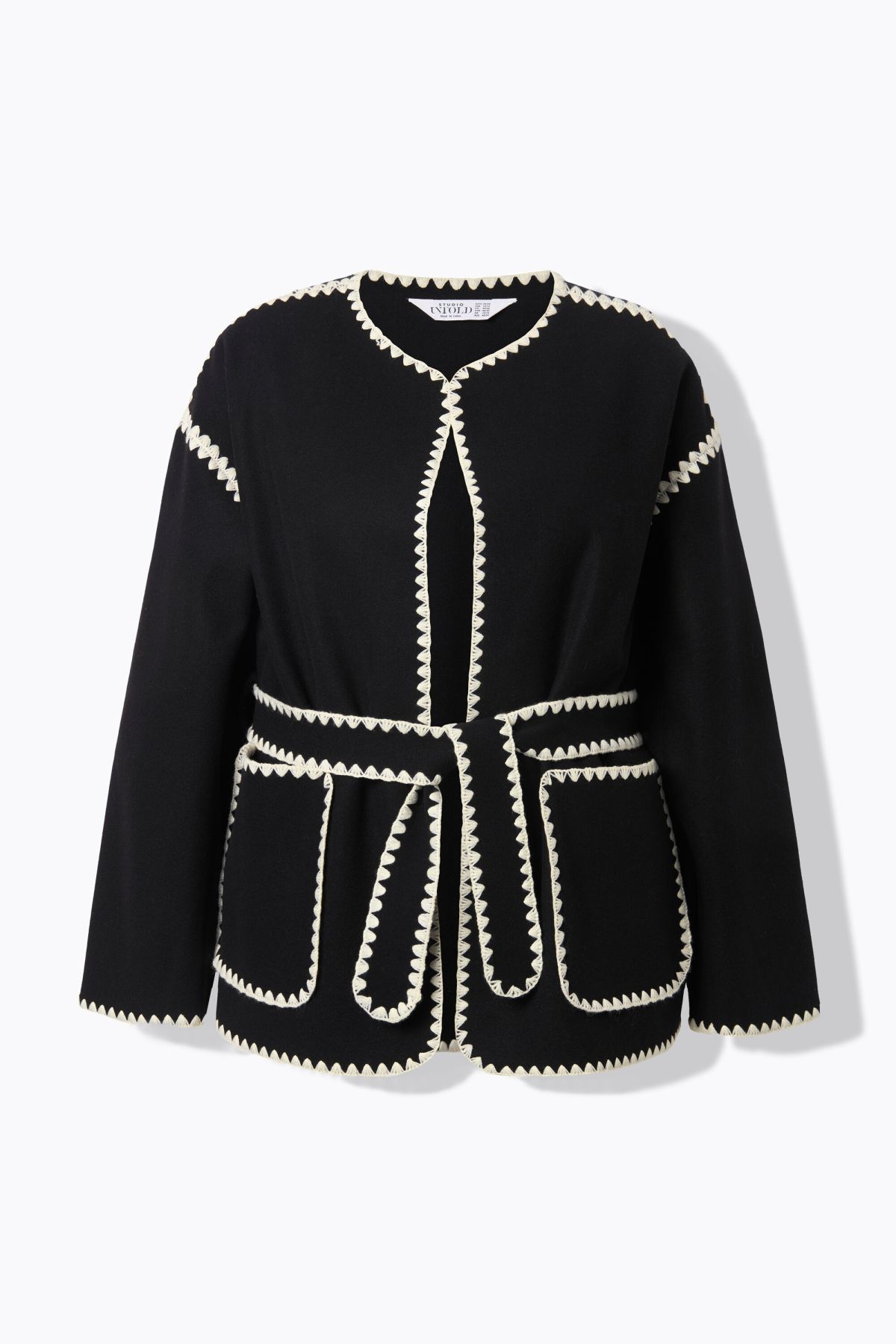 Яке с бродерия в контрастни цветове. С елегантна вълнена визия за модерен завършек на силует. С ревери на яката, странични външни джобове и дълги ръкави.