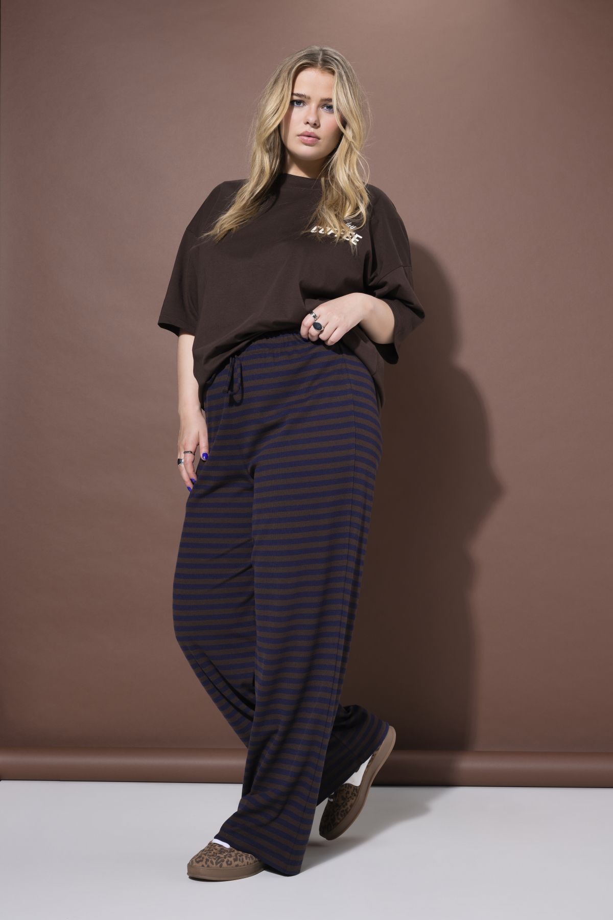 Рипсен трикотажен панталон с принт на райета. От мека, комфортна материя. С широки крачоли. С еластична талия и странични джобове