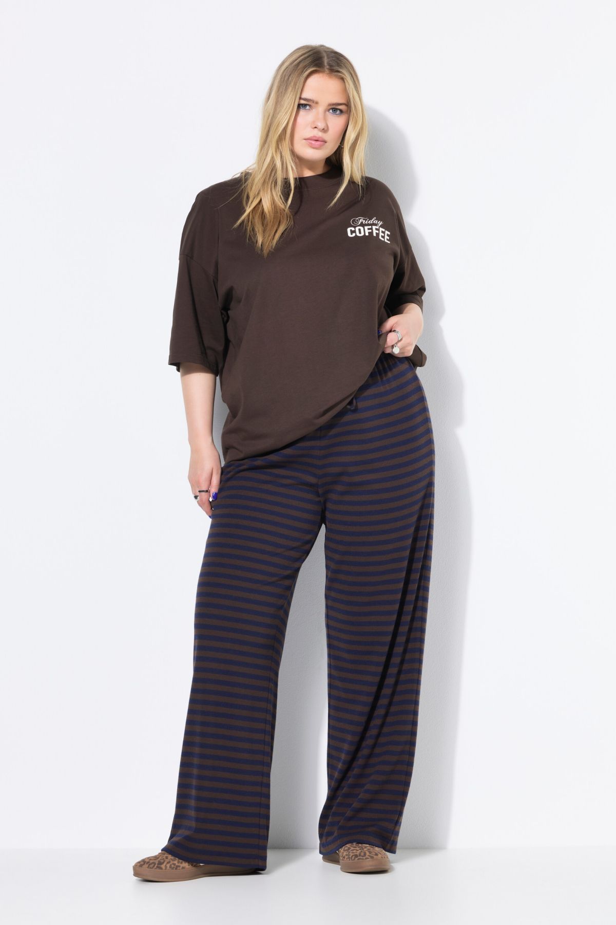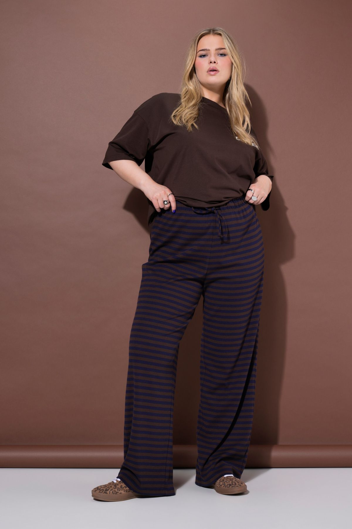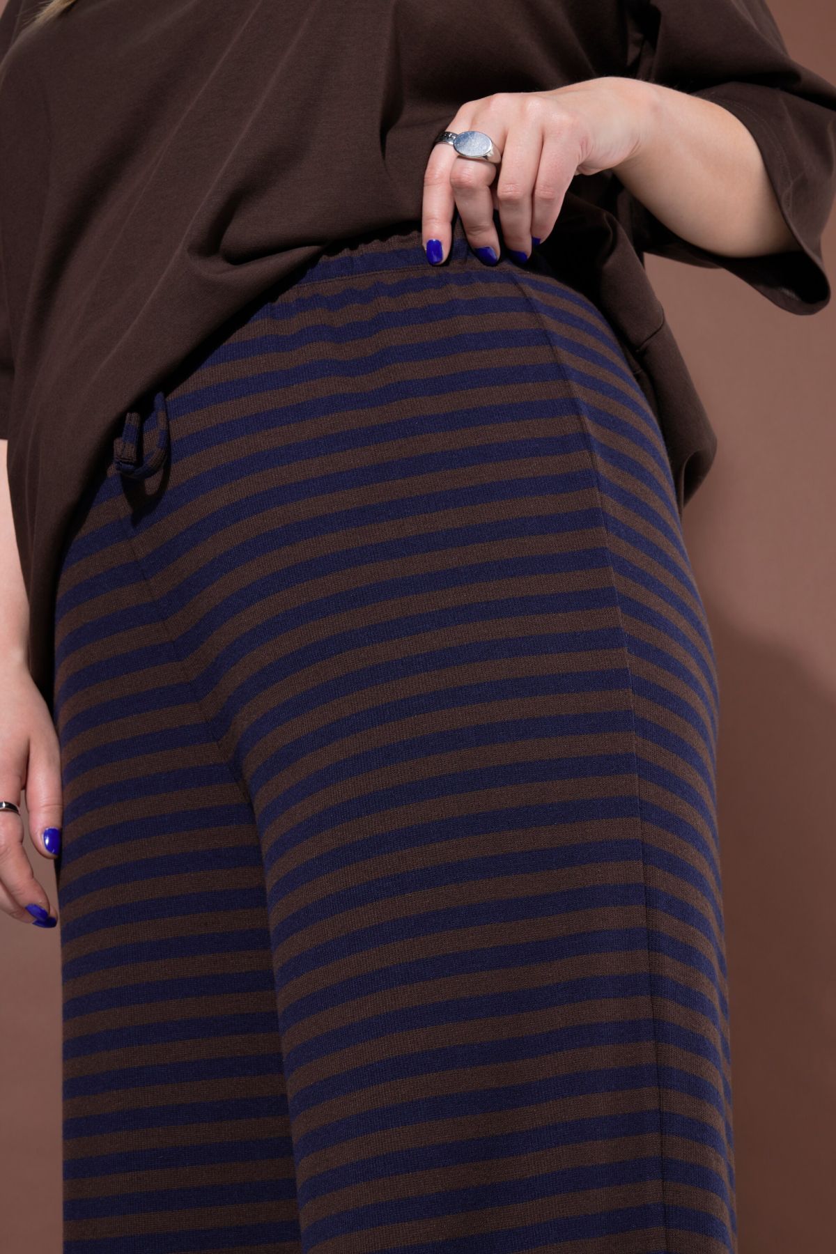 Рипсен трикотажен панталон с принт на райета. От мека, комфортна материя. С широки крачоли. С еластична талия и странични джобове