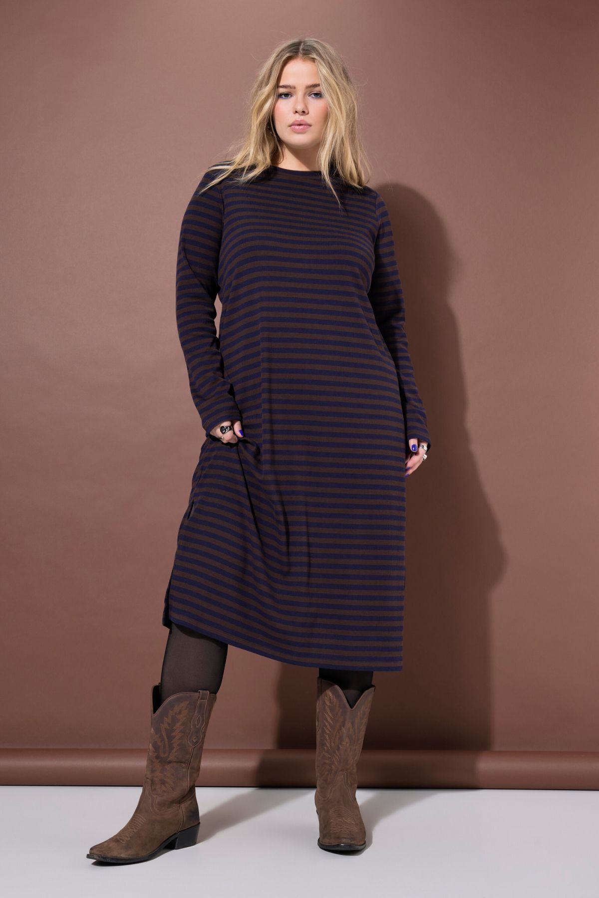 Рокля с раиран принт от рипсено трико. Комфортна еластична материя, перфектна за ежедневието. С кръгло деколте и дълги ръкави. С цепки на подгъва.