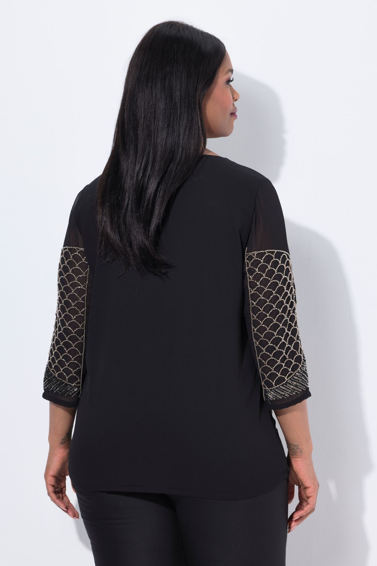 Блуза с шифон и пайетени перли. С V - образно деколте и 3/4 ръкави. От мека и удобна материя за ежедневието.