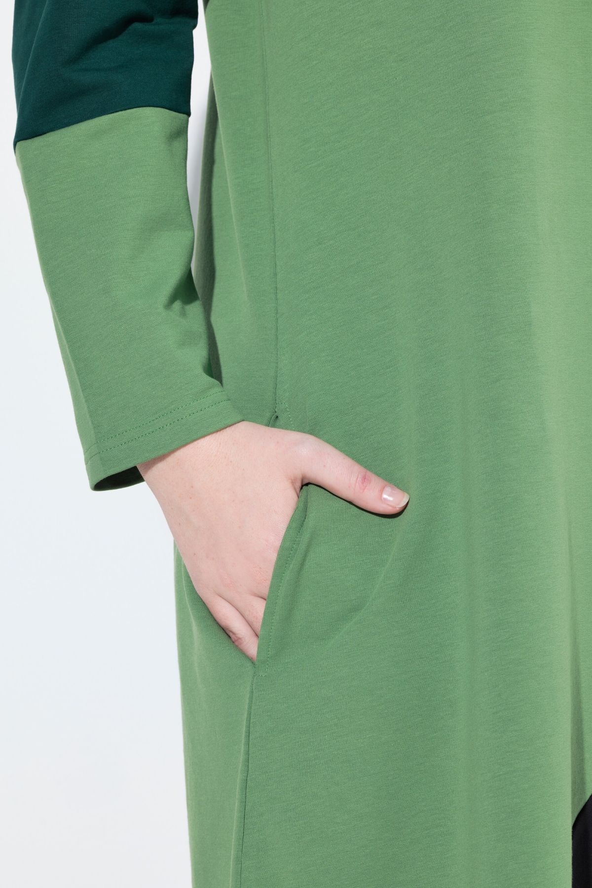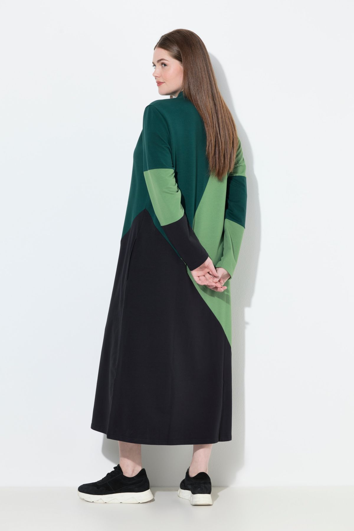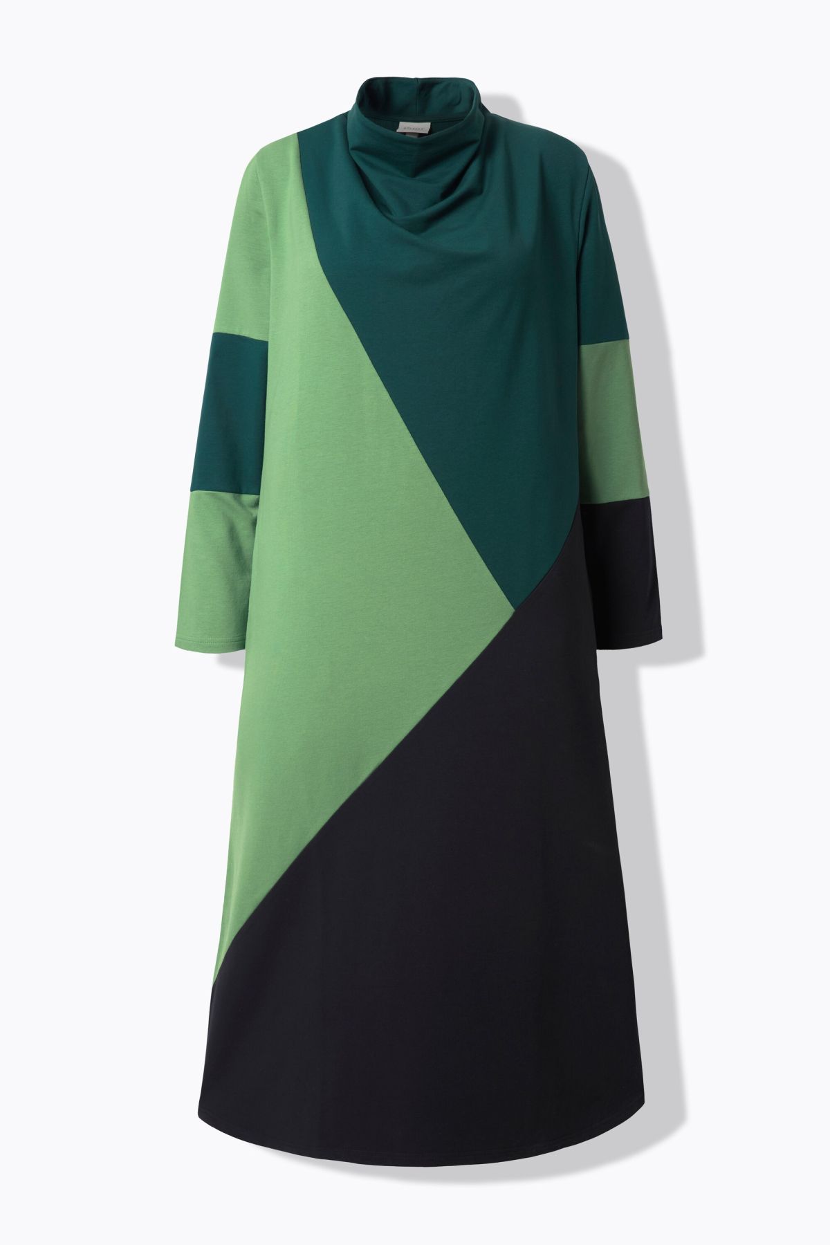 Рокля с цветни блокови детайли. С елегантна яка и модерна визия. С дълги ръкави и перфектна дължина за сезона. От мека, памучна материя.