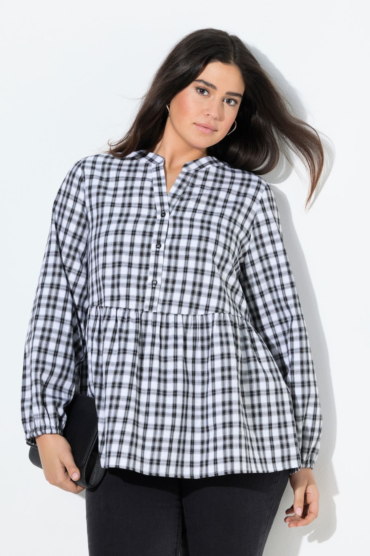Блуза с кариран принт в градски стил. С шевов акцент под талията, V - образно деколте с копчета и дълги ръкави с маншет с копче.