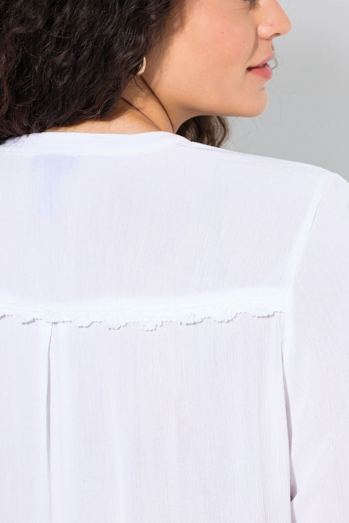 Блуза с деликатна флорална дантела на гърдите. С малка яка, копчета отпред, кръстосани шевови акценти с разкроен детайл. С дълги ръкави и стилна визия.