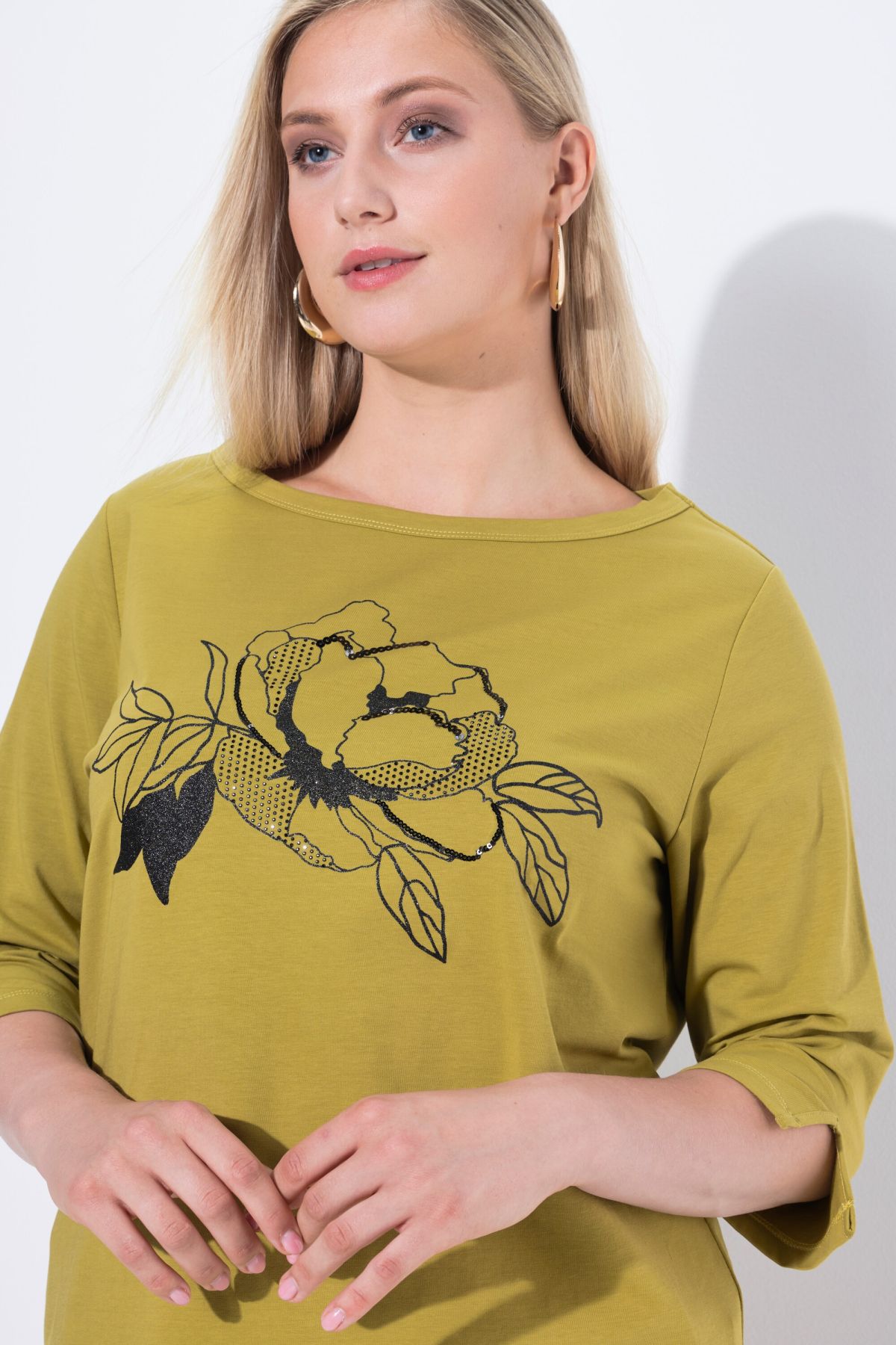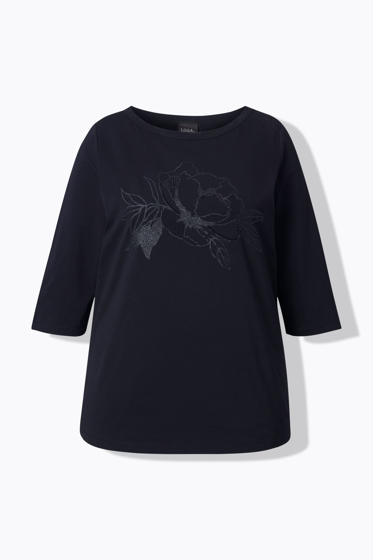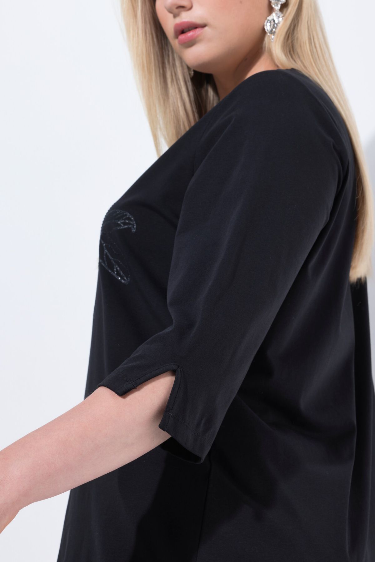 Голям флорален мотив с пайети и декоративни камъни, деколте тип „лодка“, удобна кройка, дълги ръкави с цепка, естествен памук с еластан, дължина, регулирана по размер, приблизително 68-76 см.
