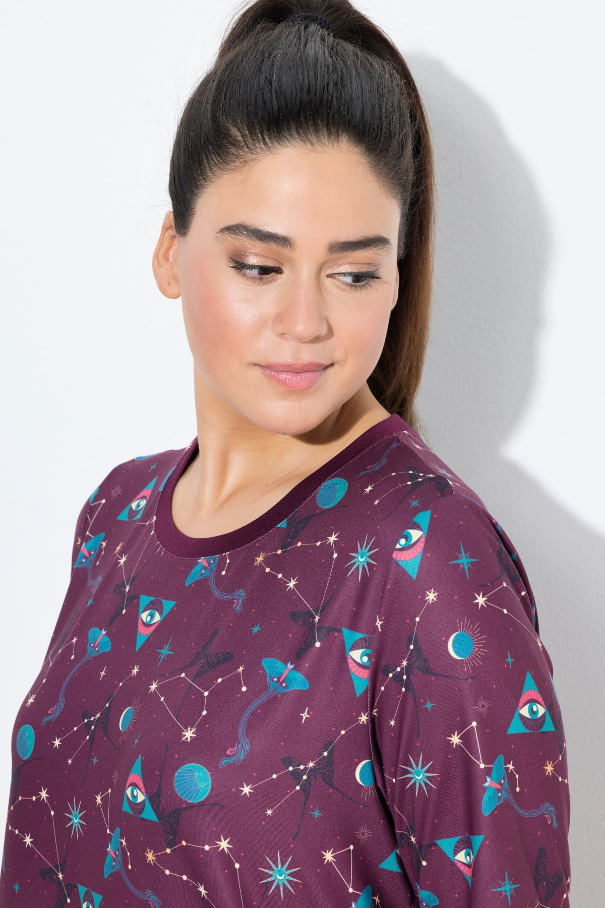 Тениска от мека, бързосъхнеща материя. С кръгло деколте и А - линия на силуета. С 3/4 ръкави.