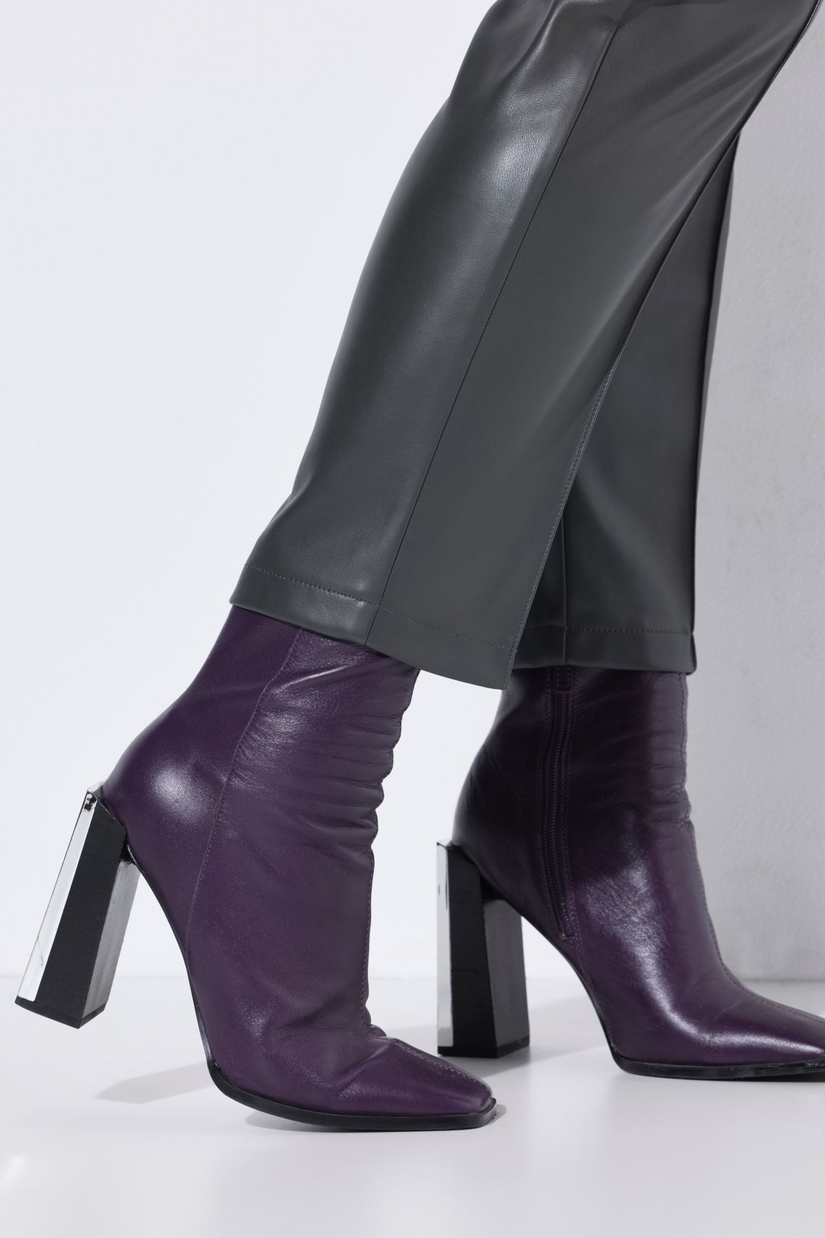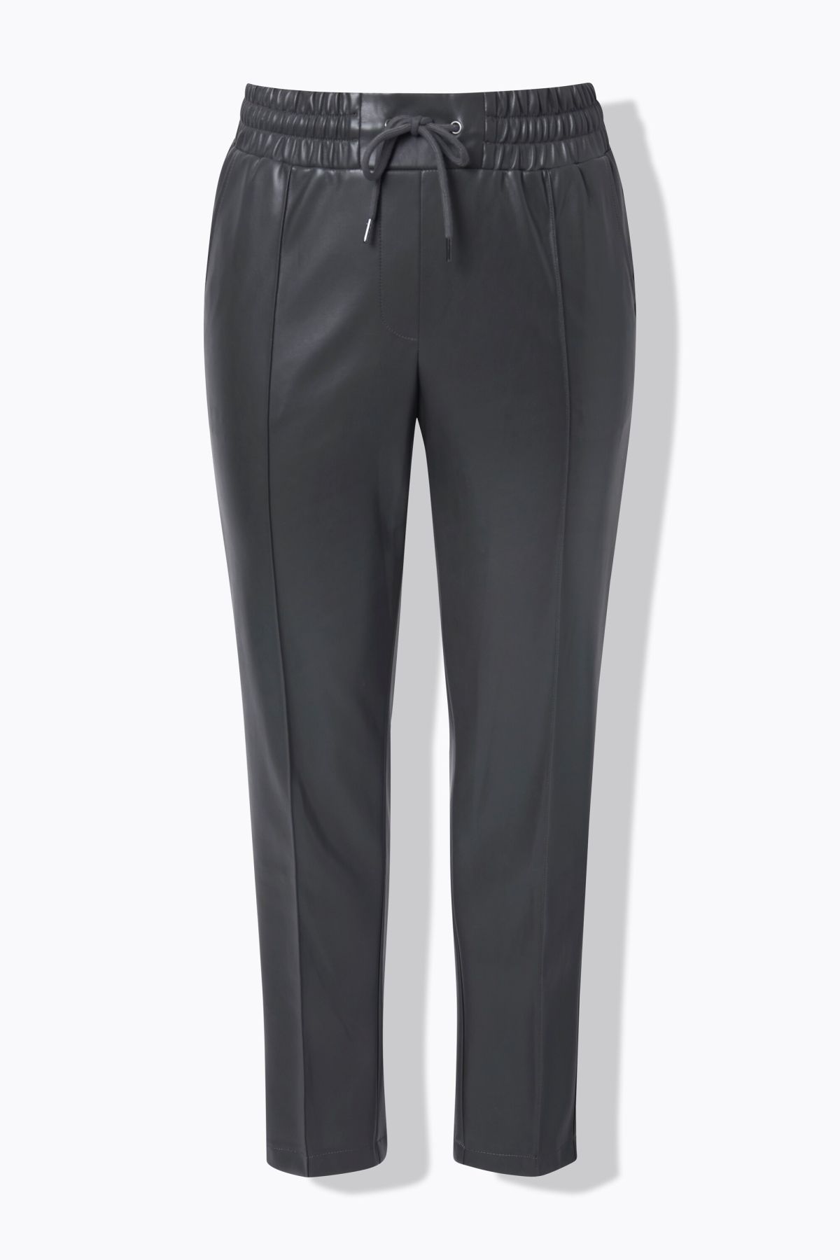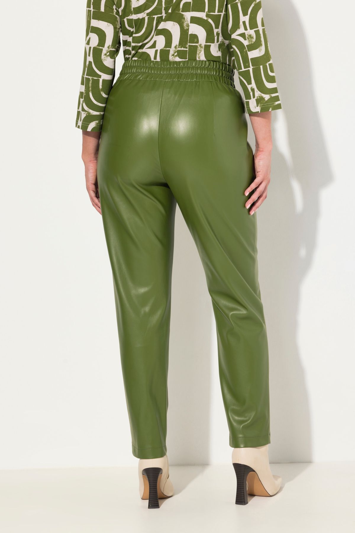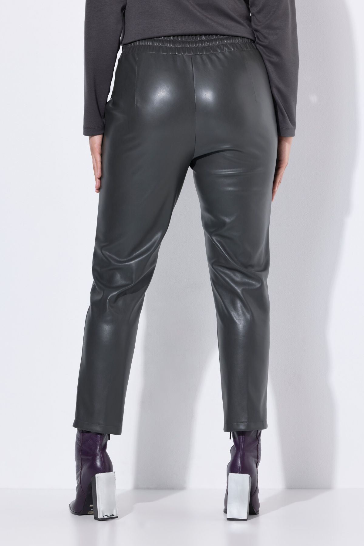 Елегантен панталон от изкуствена кожа - перфектен за всяко време. С плисе отпред с еластична талия допринасяща за комфорта.