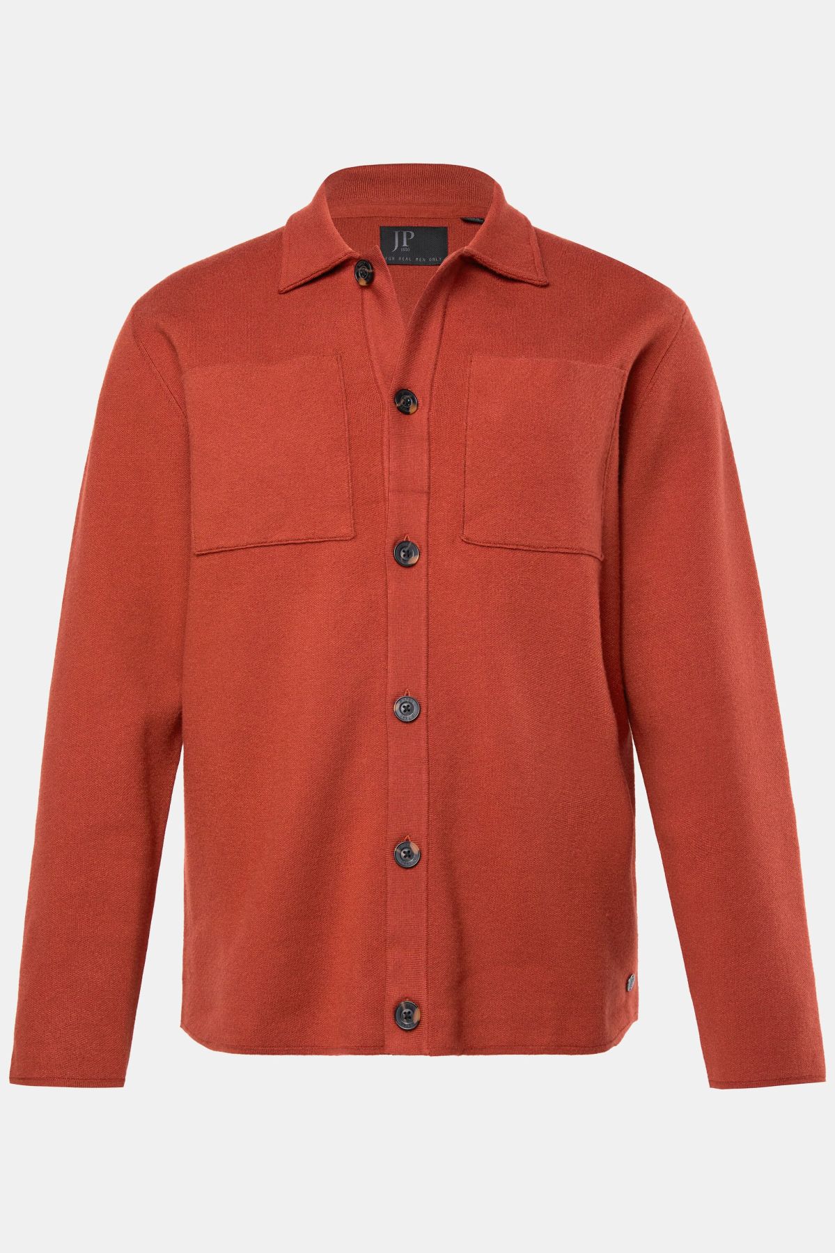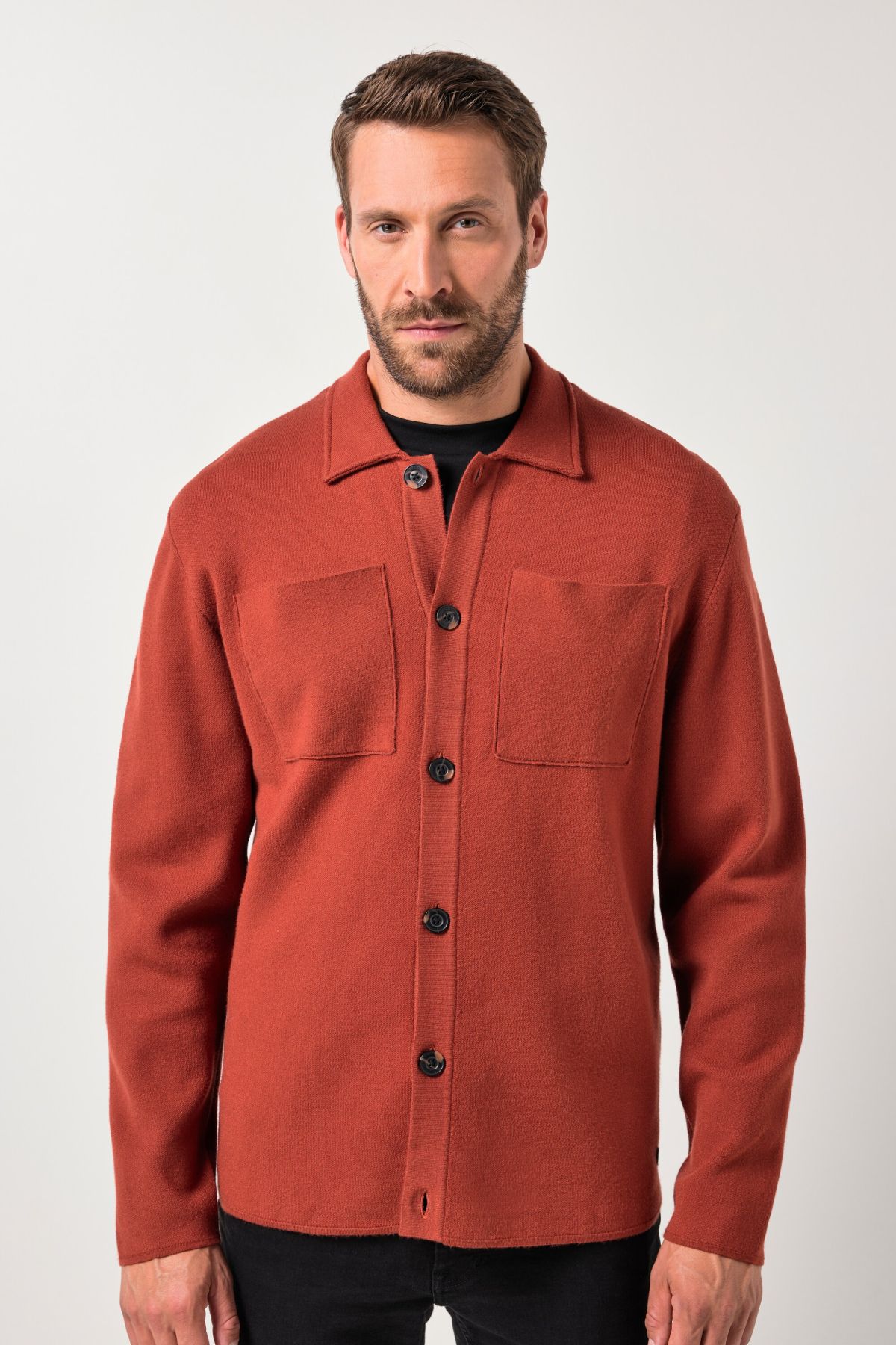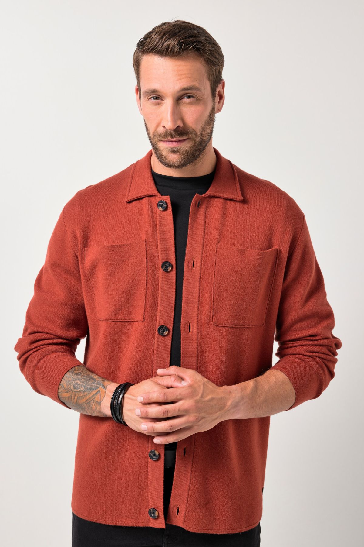 Плетена жилетка с копчета отпред. С яка на риза и джобове на гърдите. С дълги ръкави с маншет.