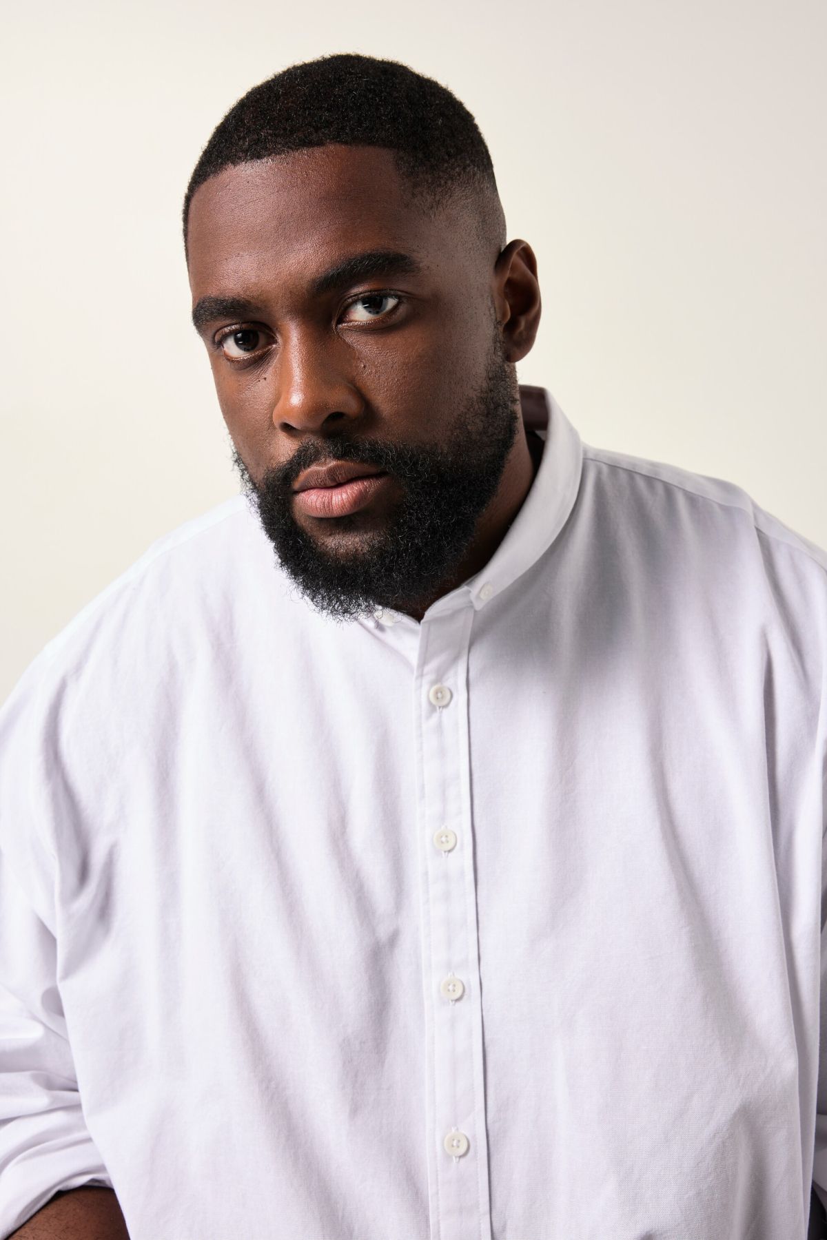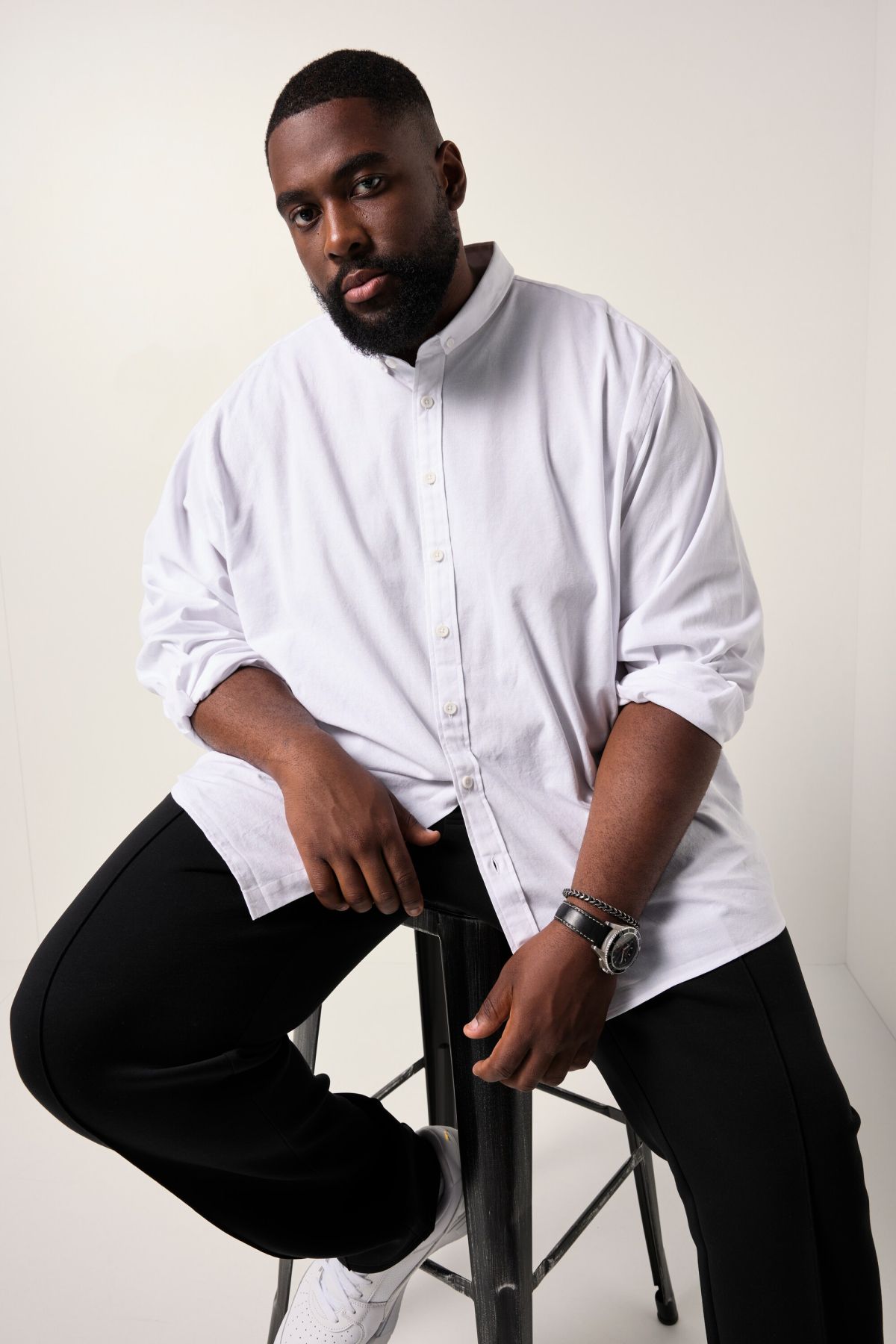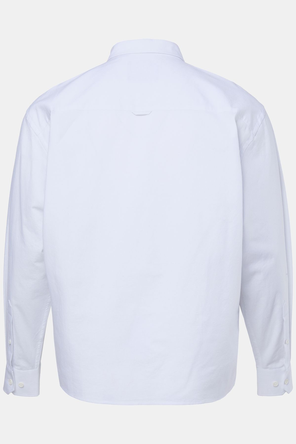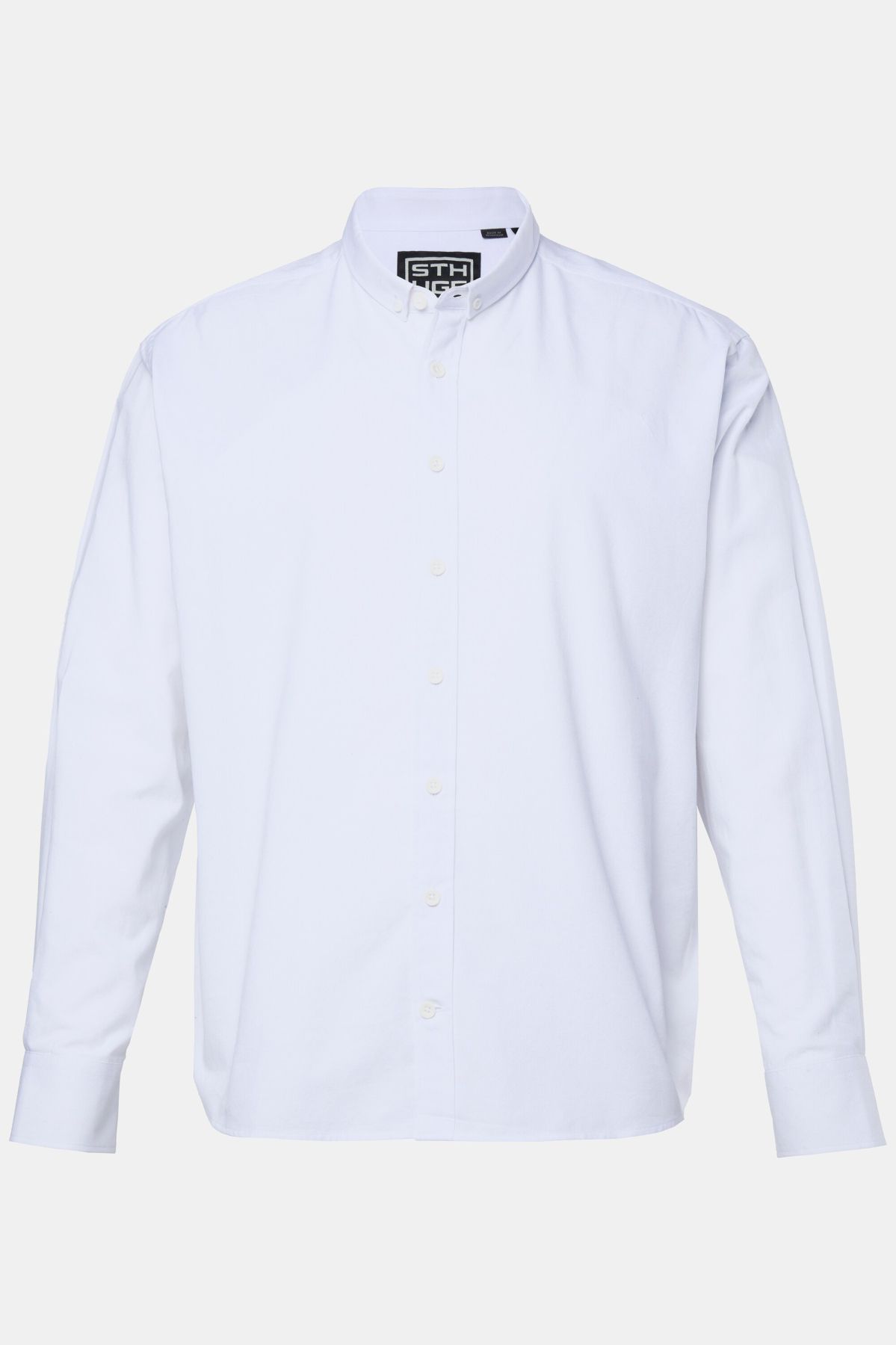 Риза STHUGE с малка изправена яка, копчета отпред и дълги ръкави с маншет с копче. С разкроен силует.