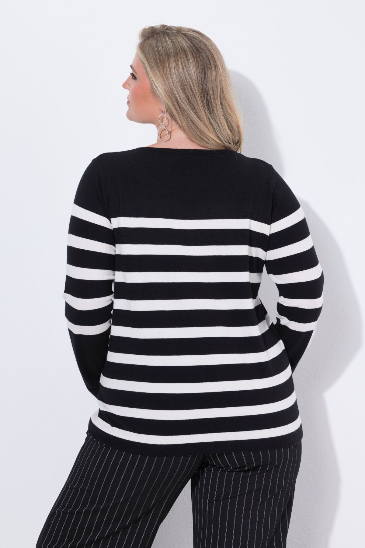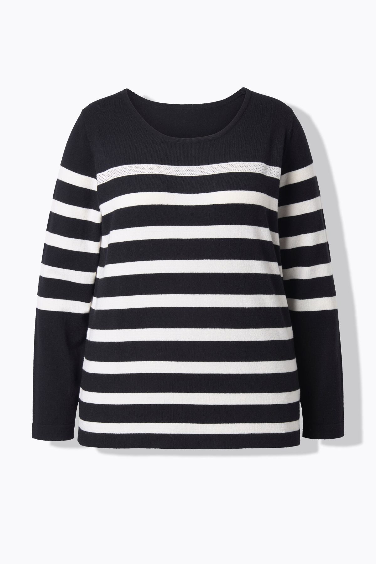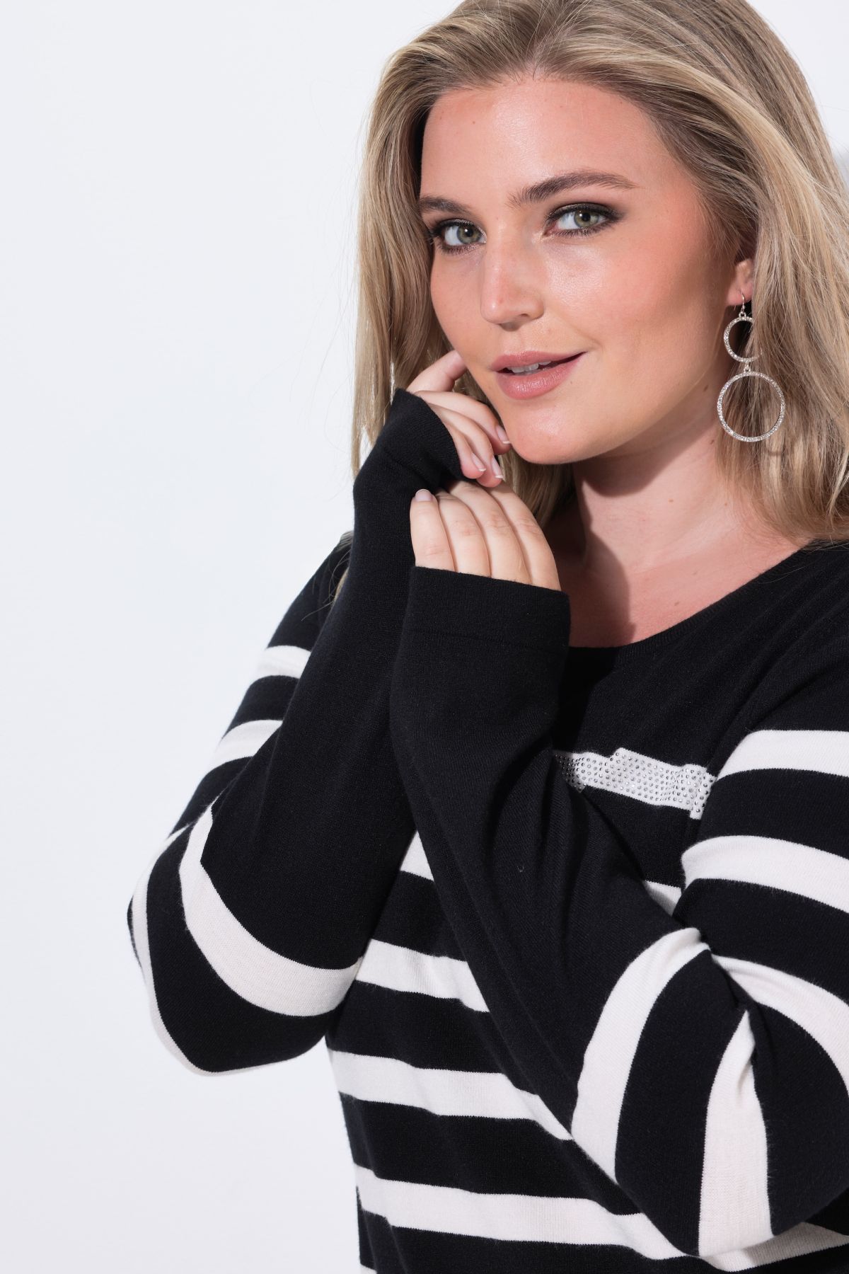 Раиран пуловер с класически дизайн с бляскави камъчета за акцент. С кръгло деколте и дълги ръкави. От мека, фина материя.
