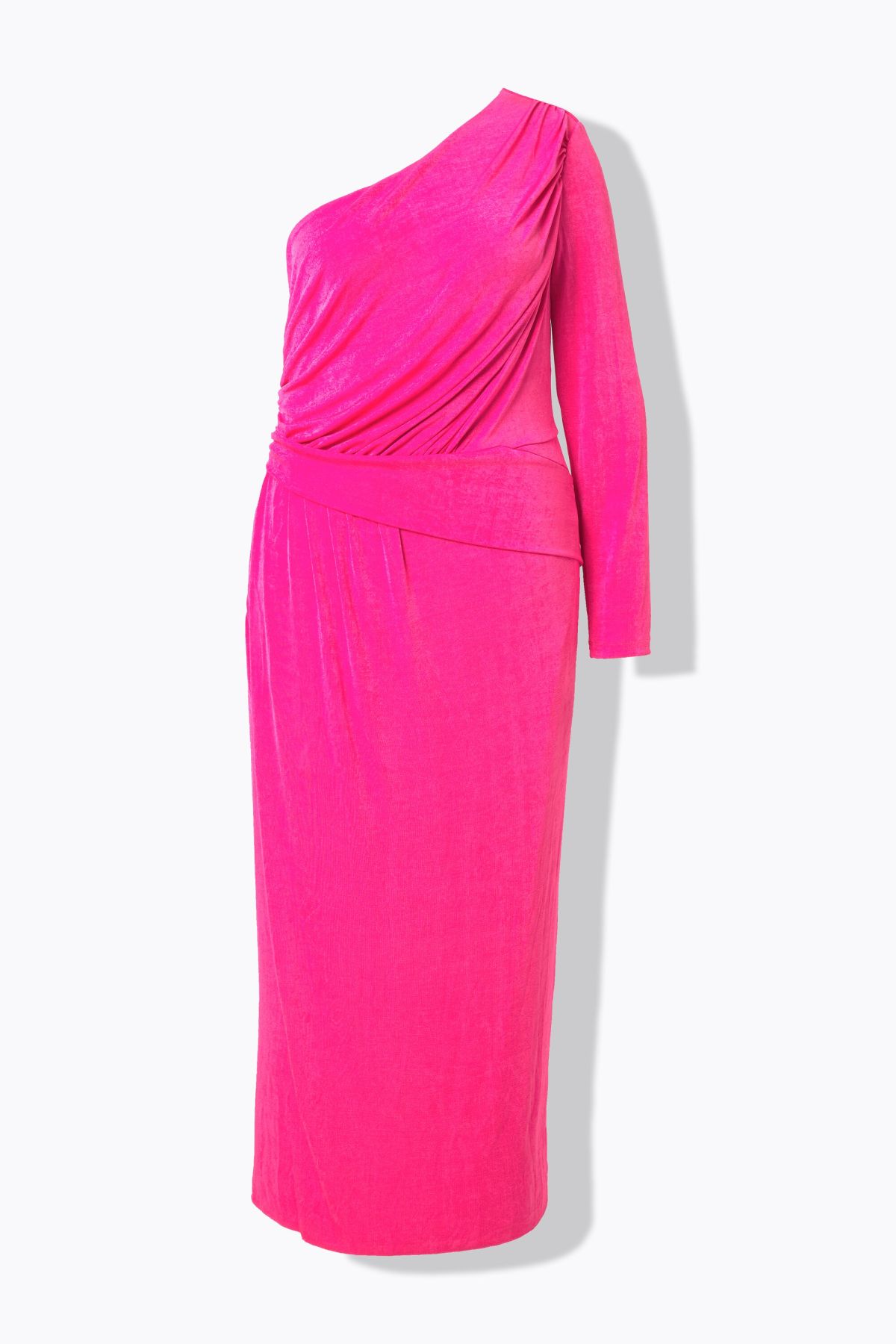 Женствена драпирана рокля в модерен цвят, с оголени рамене отдясно, с дълъг ръкав отляво, фин страничен цип, меко и еластично трико, изцяло подплатена, дължина приблизително 139 см.