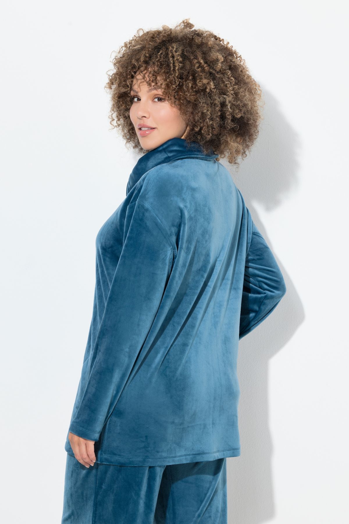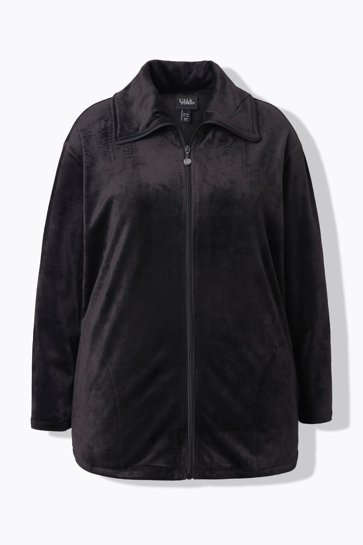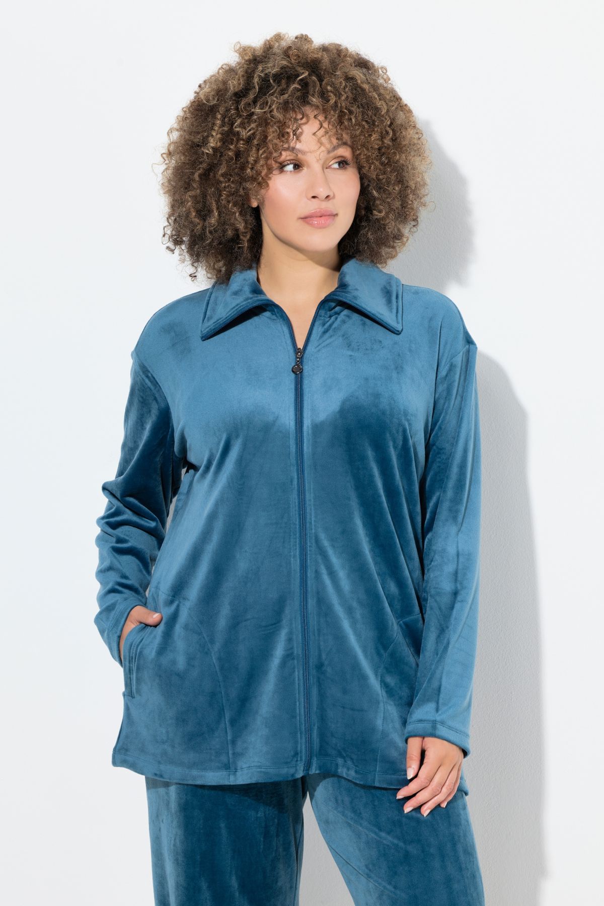 Велурен суитчър с комфортна кройка и модерна визия. С изправена яка, цип отпред, странични шевови джобове и дълги ръкави.