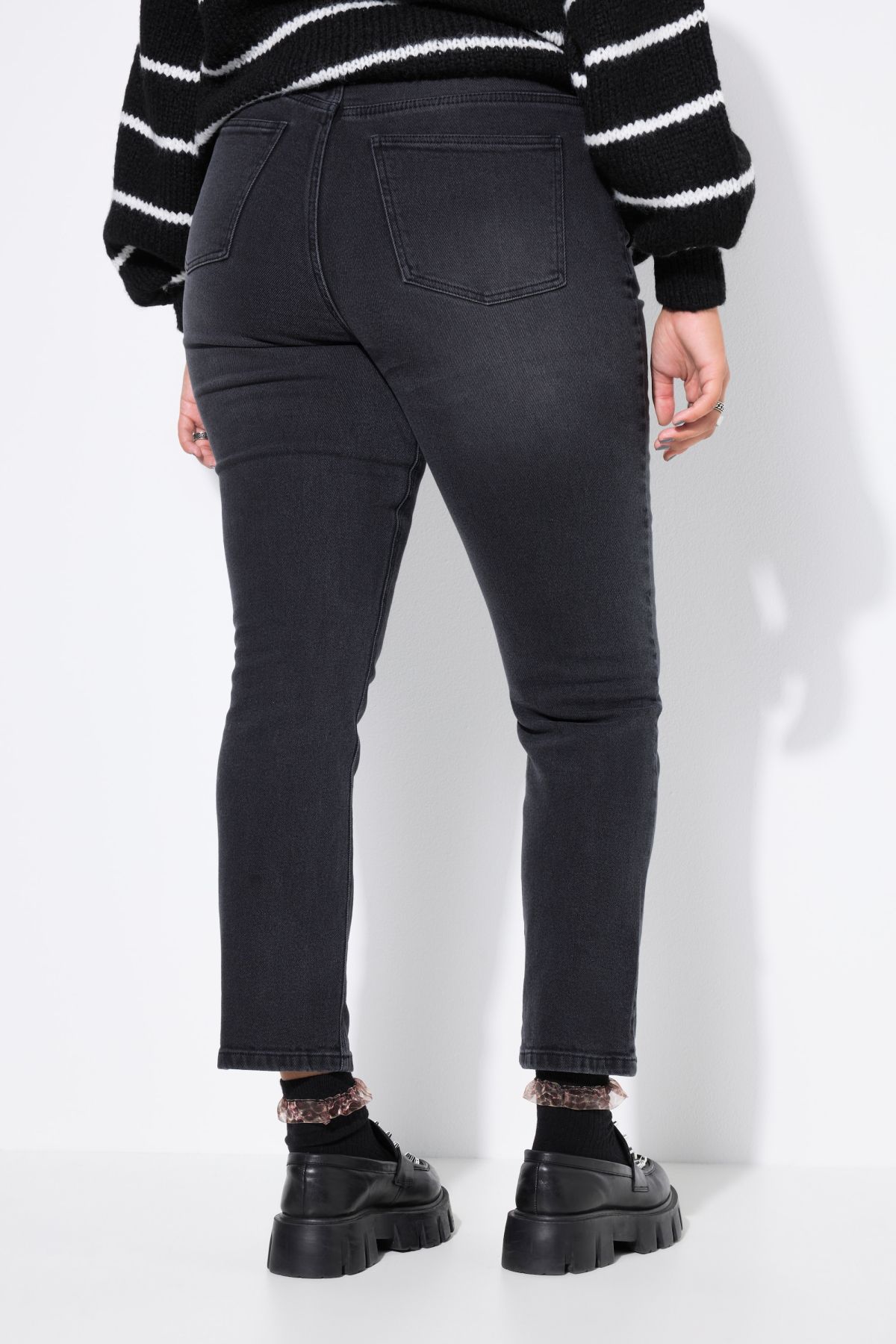 Дънки тип Mom еластични с класическа кройка и комфорт за дългото ежедневие. С фиксирана талия с гайки за колан, копче и цип отпред и джобове.