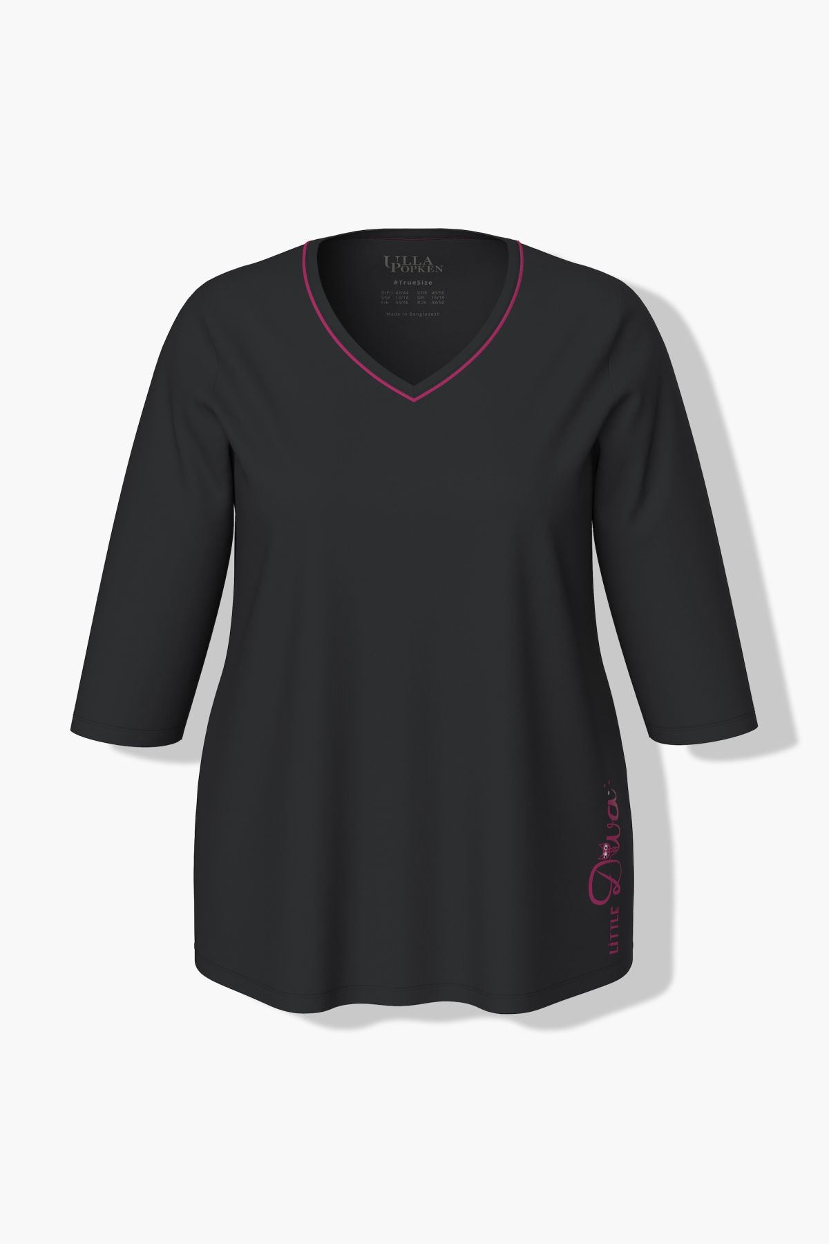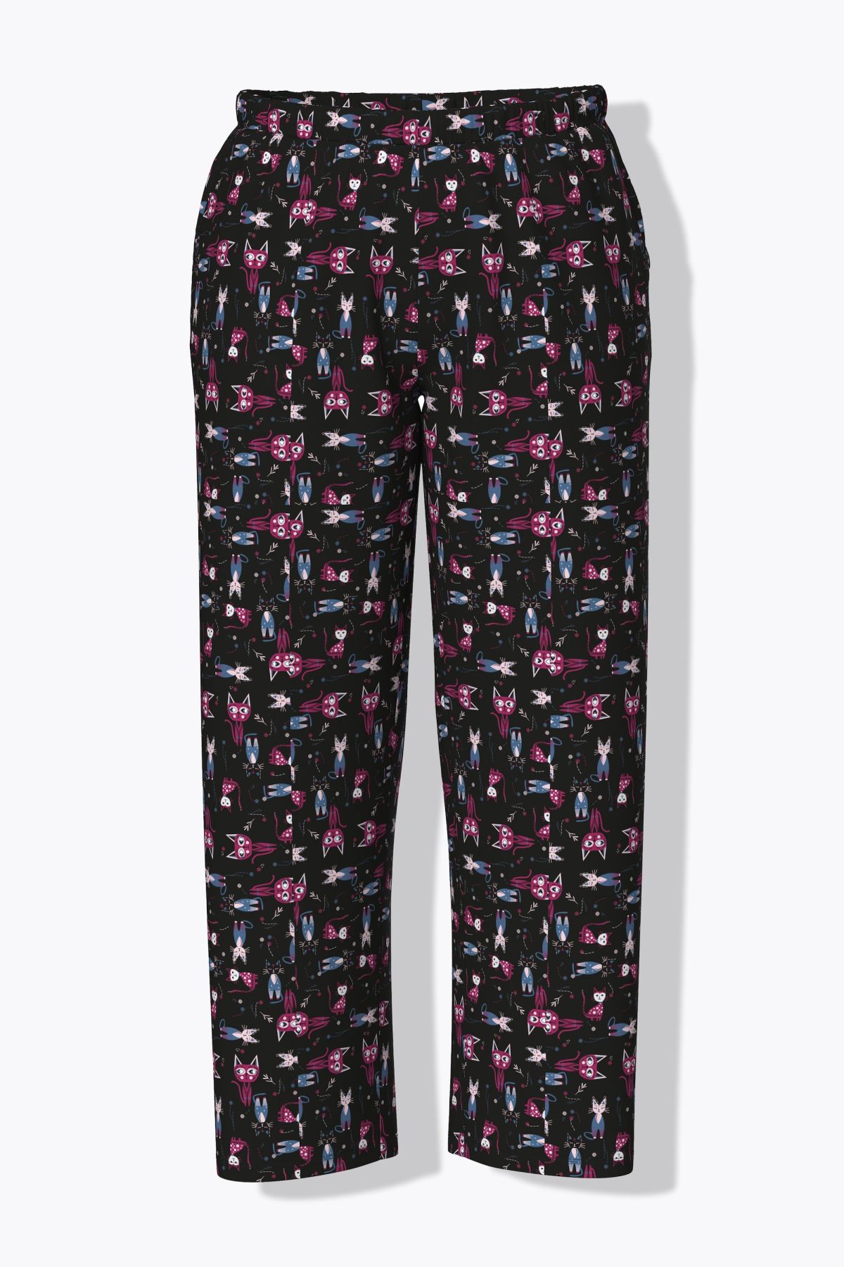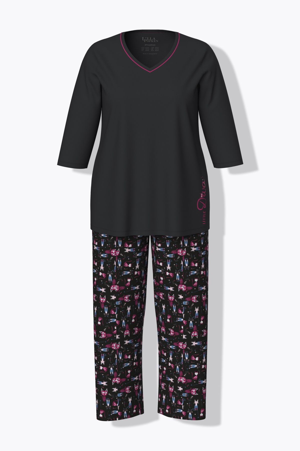 Пижама с принт на котки с цветни акценти. Перфектна за добрия сън. С едноцветно горнище с 3/4 ръкави и долнище с принт и еластична талия.