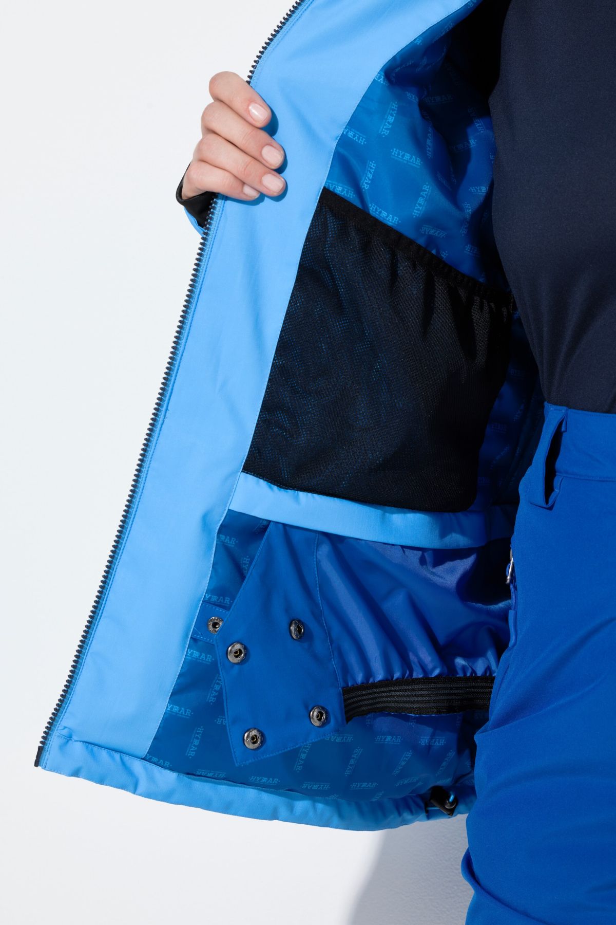Яке HYPRAR за ски с цветен блоков принт. Останете топли и защитени през дните за спорт през зимата. Водонепромокаемо, ветроустойчиво и дишащо. С дълги ръкави, изправена яка и качулка.
