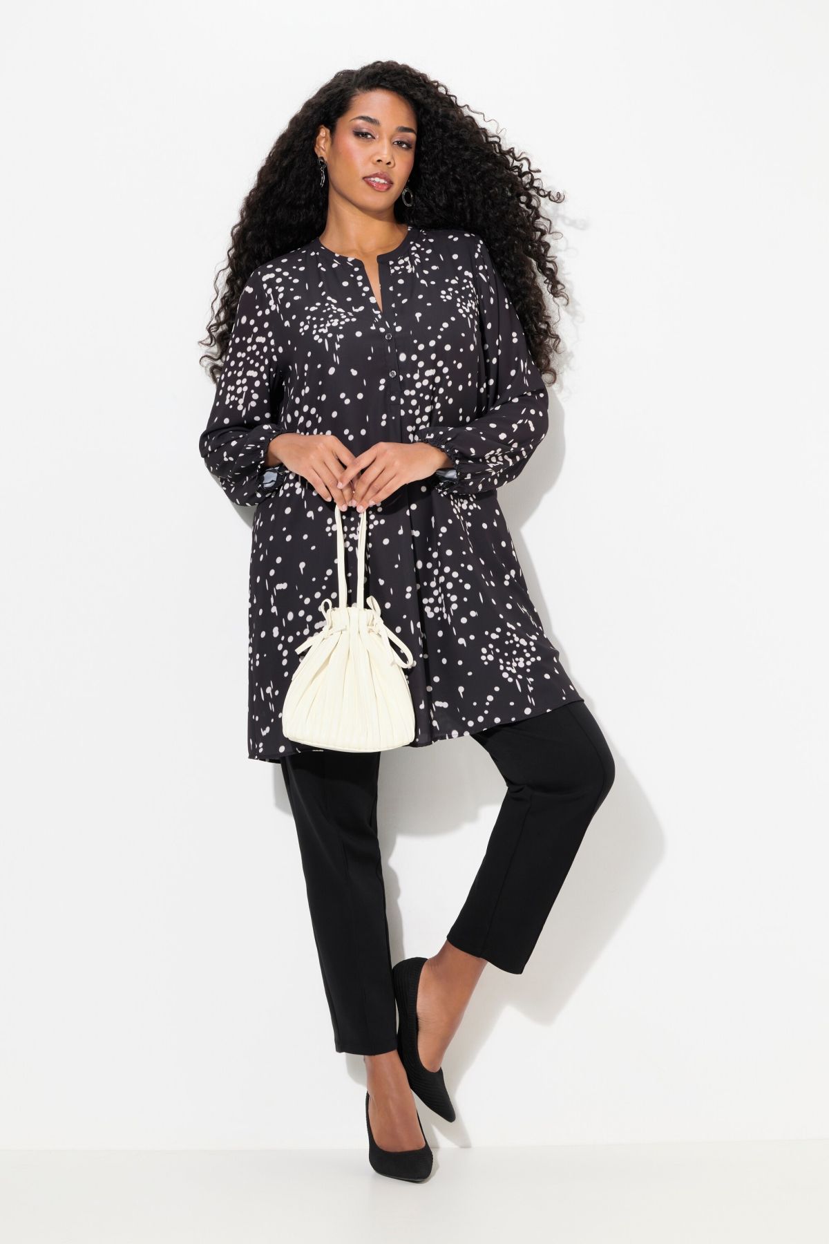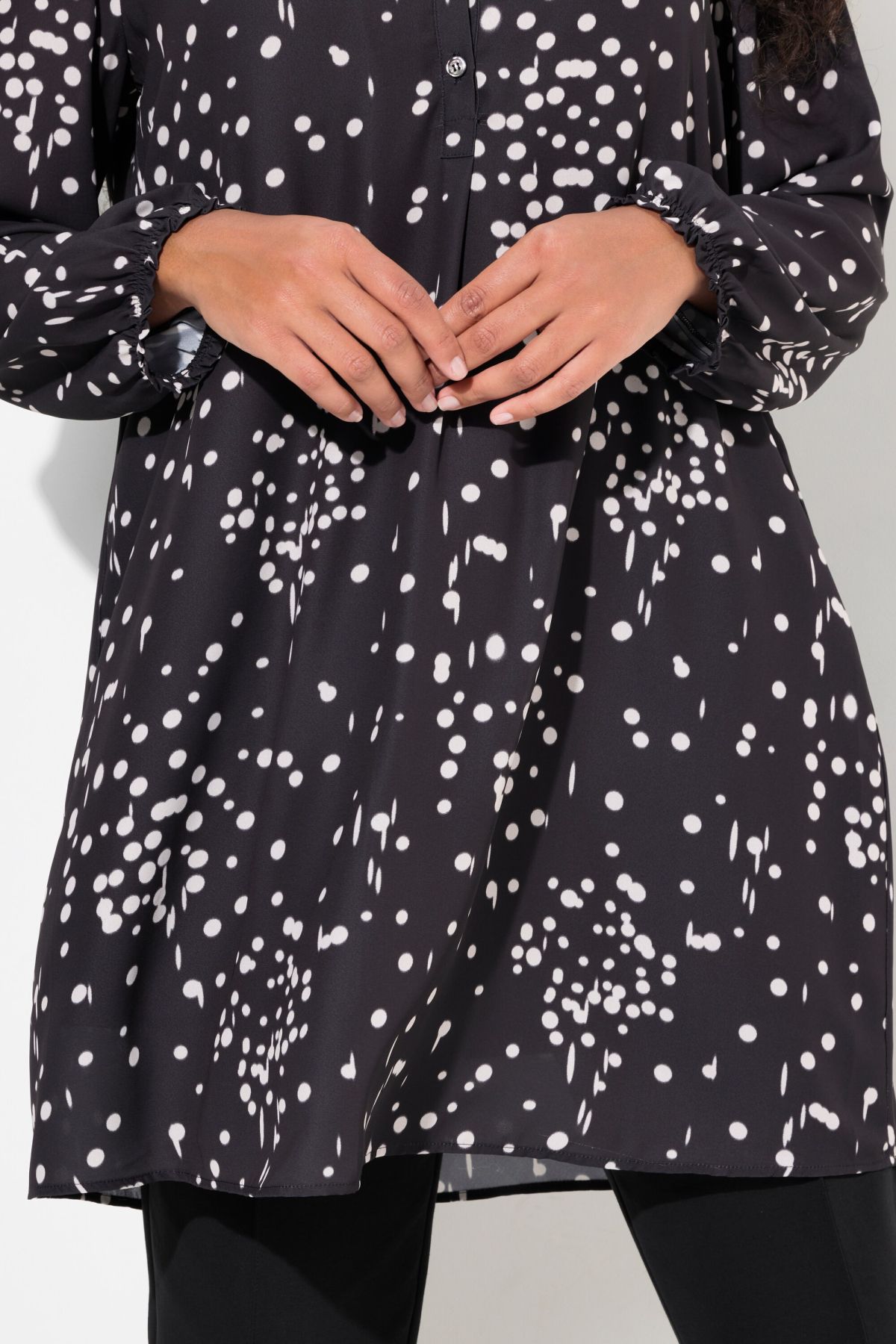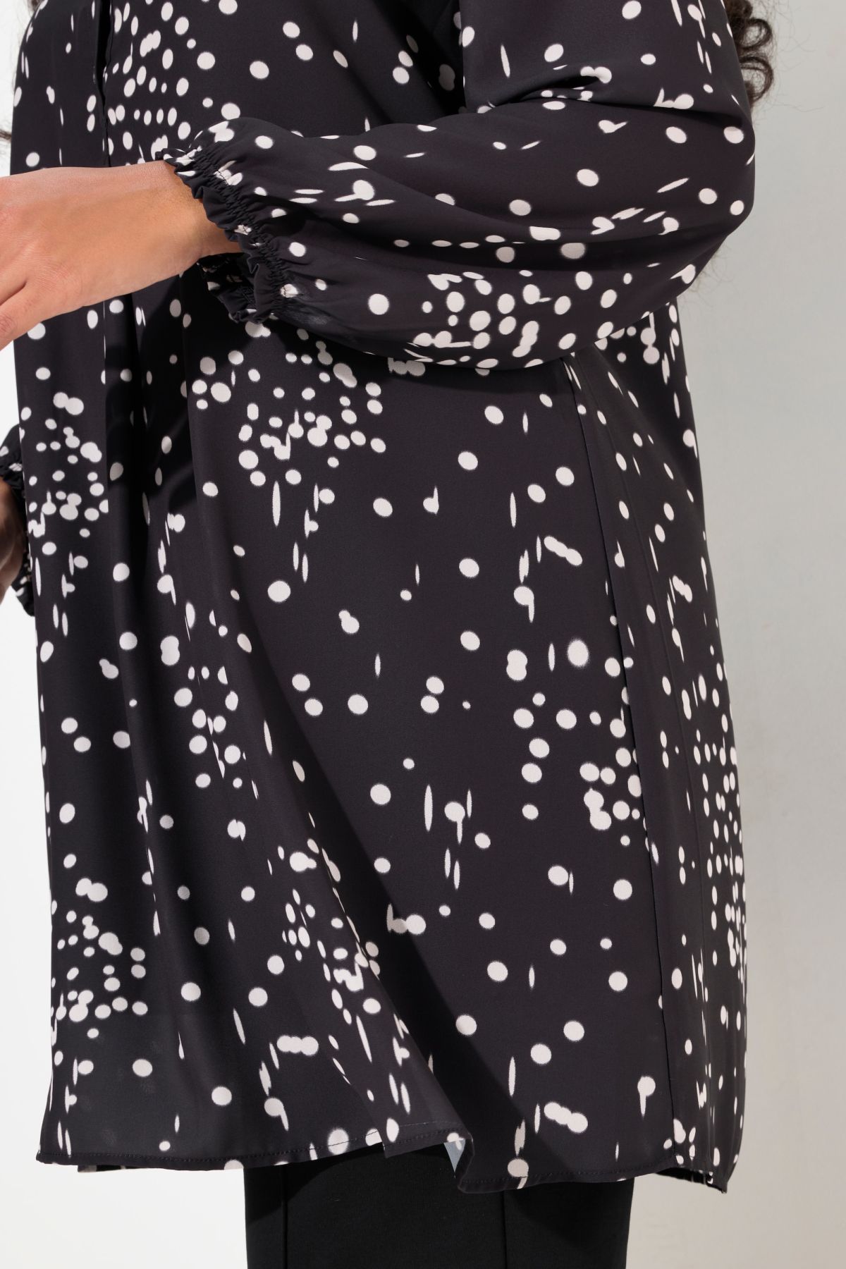 Туника с принт на точки с асиметрични акценти. С издължен силует, кръгло деколте с цепка и дълги ръкави.