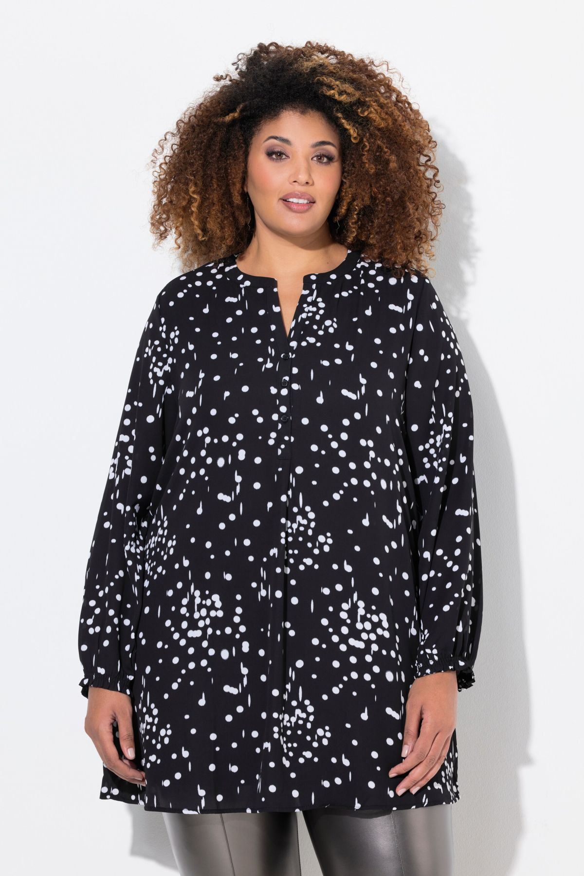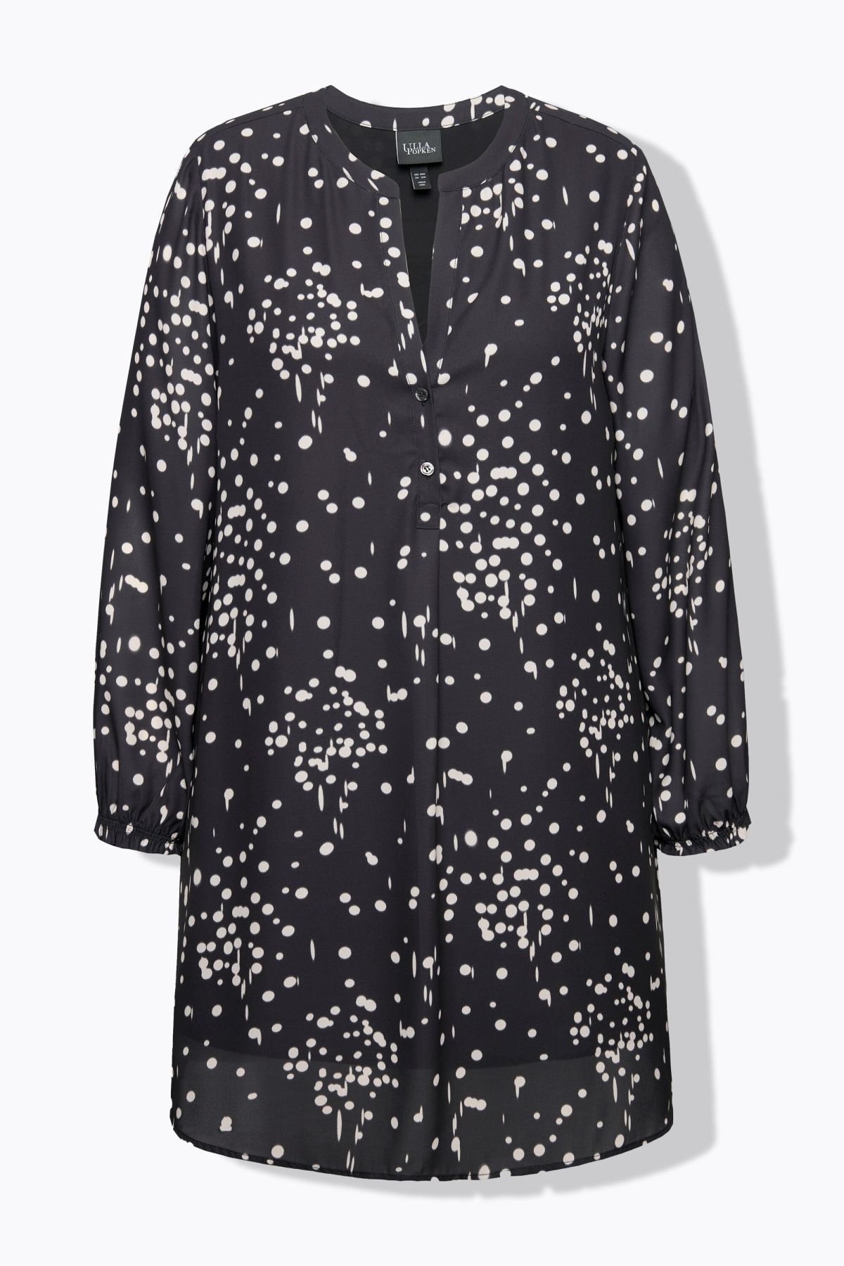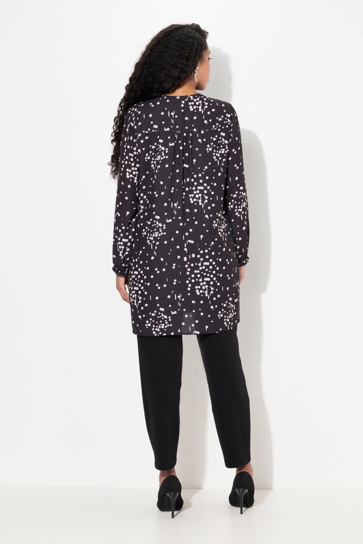 Туника с принт на точки с асиметрични акценти. С издължен силует, кръгло деколте с цепка и дълги ръкави.