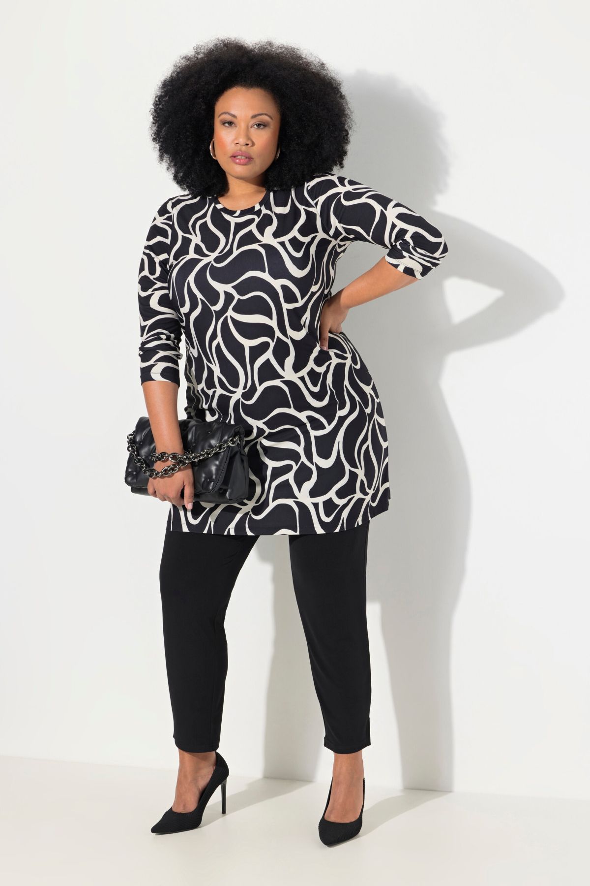 Туника с геометричен принт от еластична, трикотажна материя с А - линия на силуета. С кръгло деколте и 3/4 ръкави.