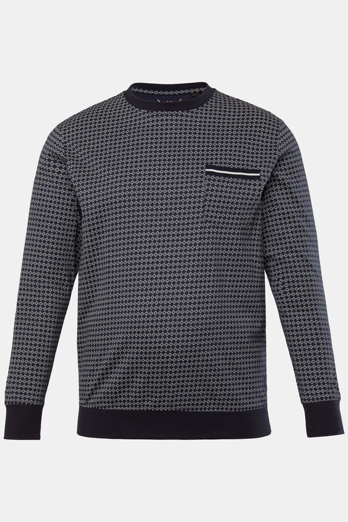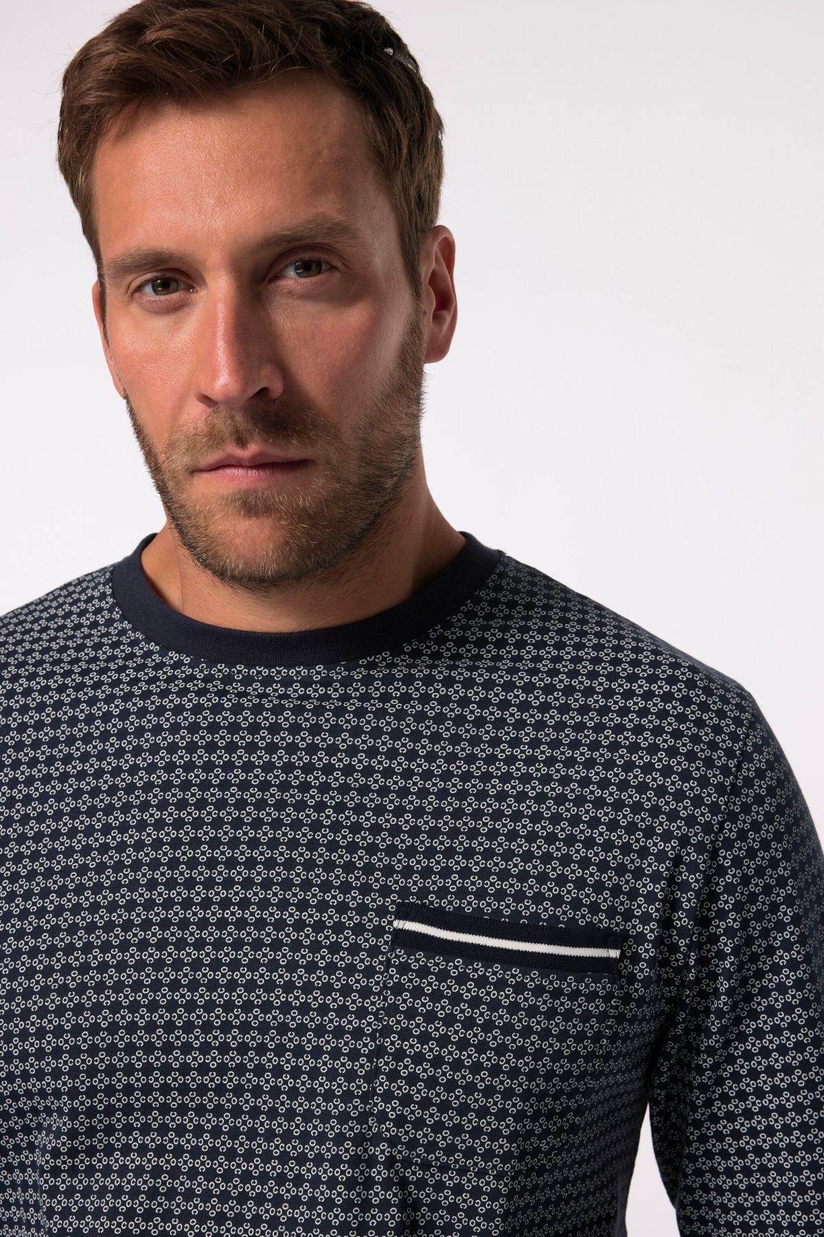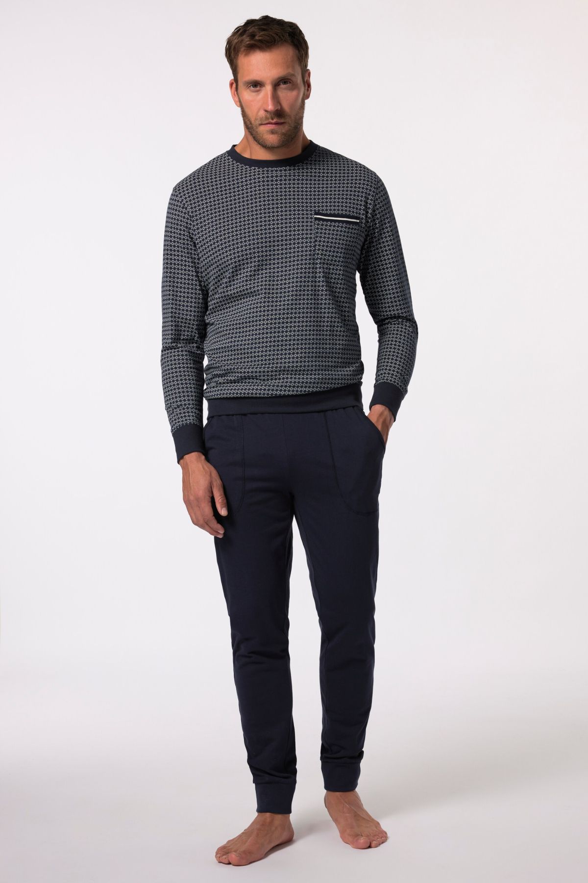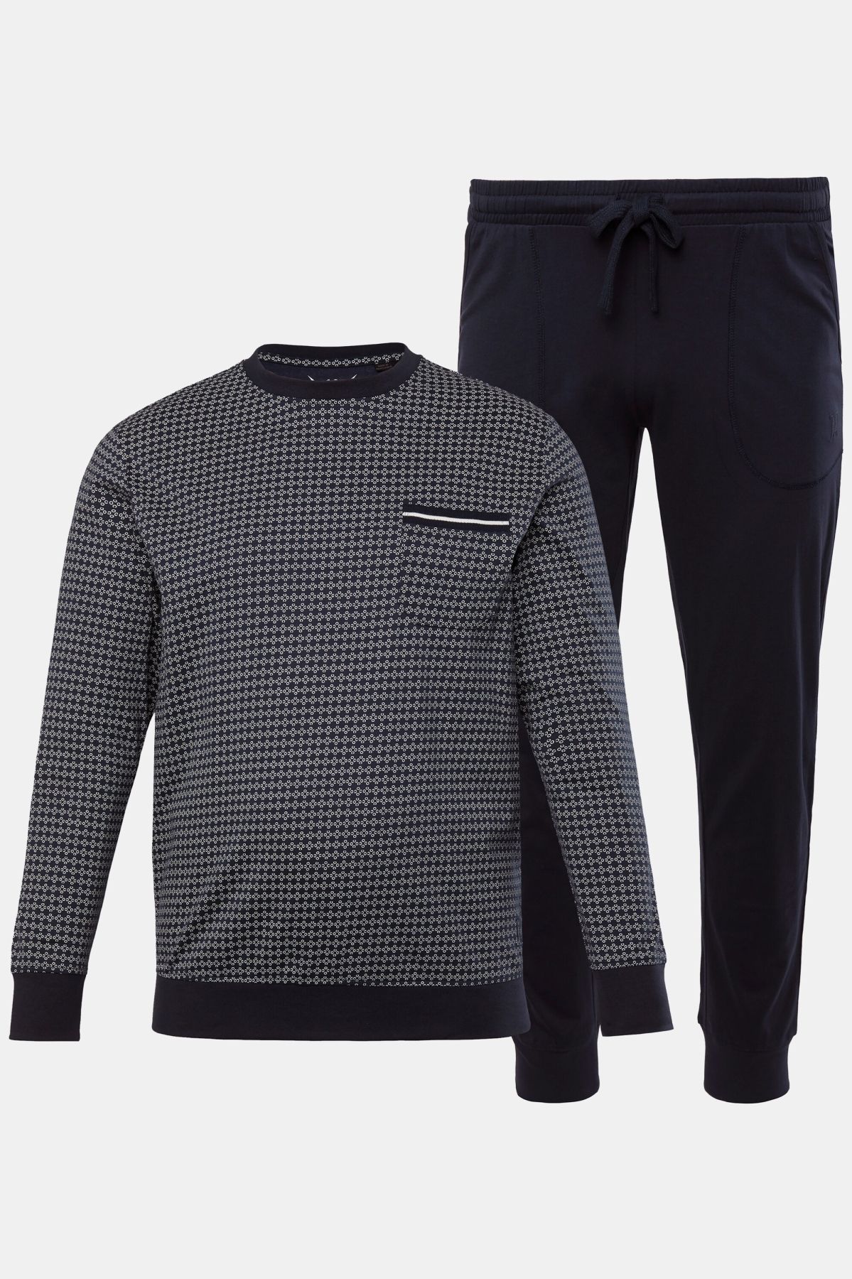 Пижама от две части с модерен акцент. С горнище с принт с кръгло деколте с контрастни акценти и дълги ръкави и долнище с дълги крачоли, еластична талия и странични джобове.