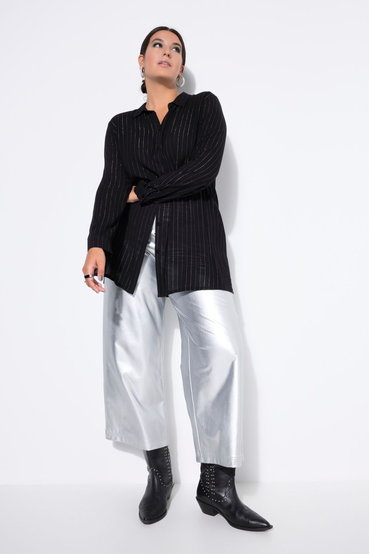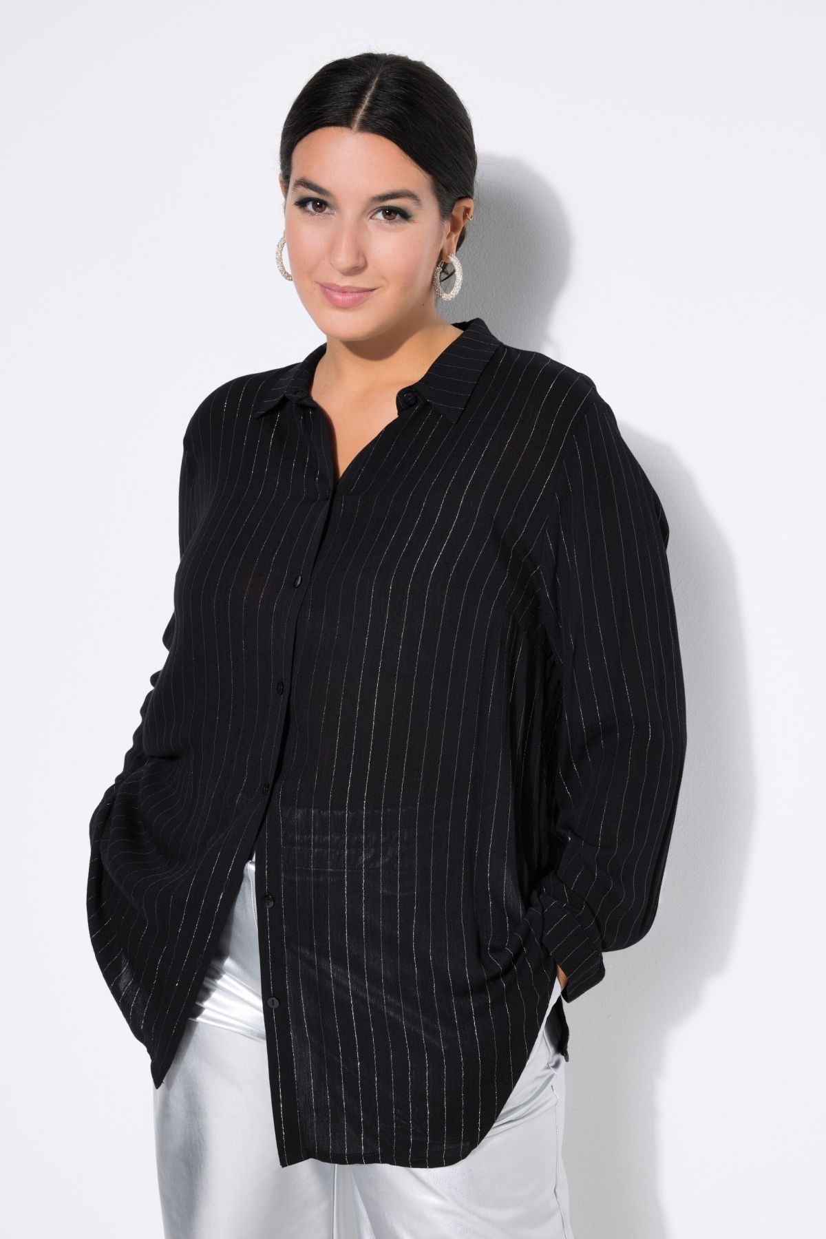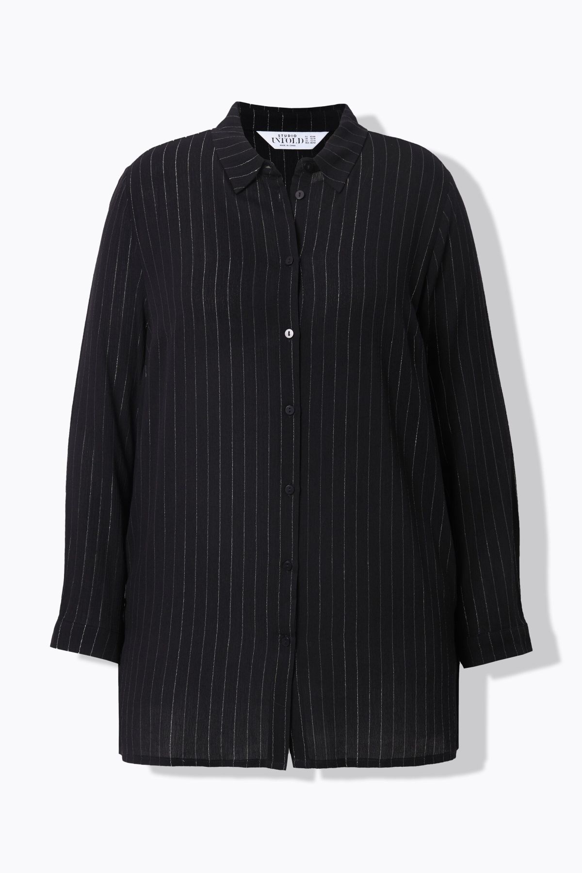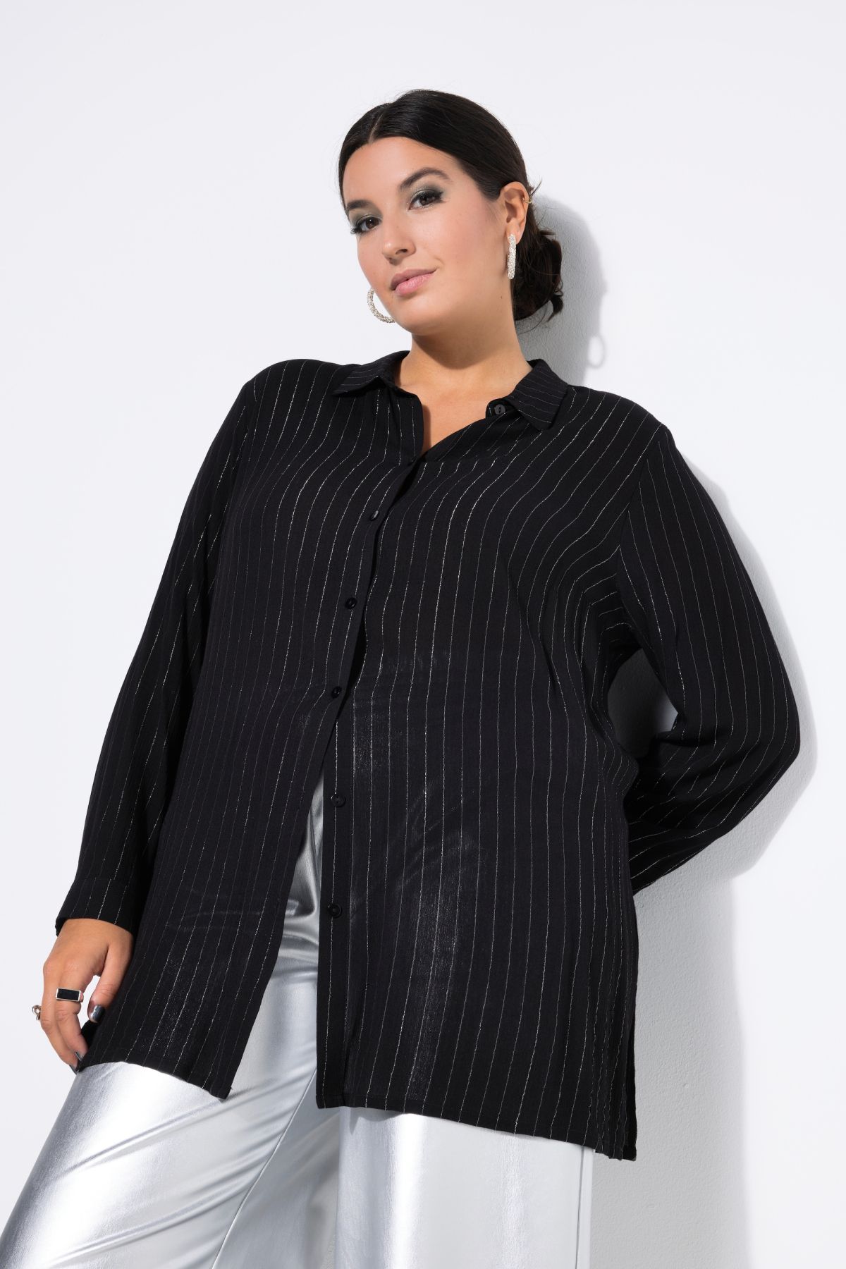 Риза с бляскави райета и прав силует. С яка, дълги ръкави с маншет и странични цепки.