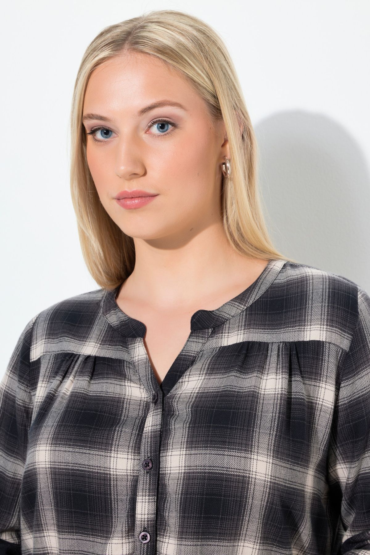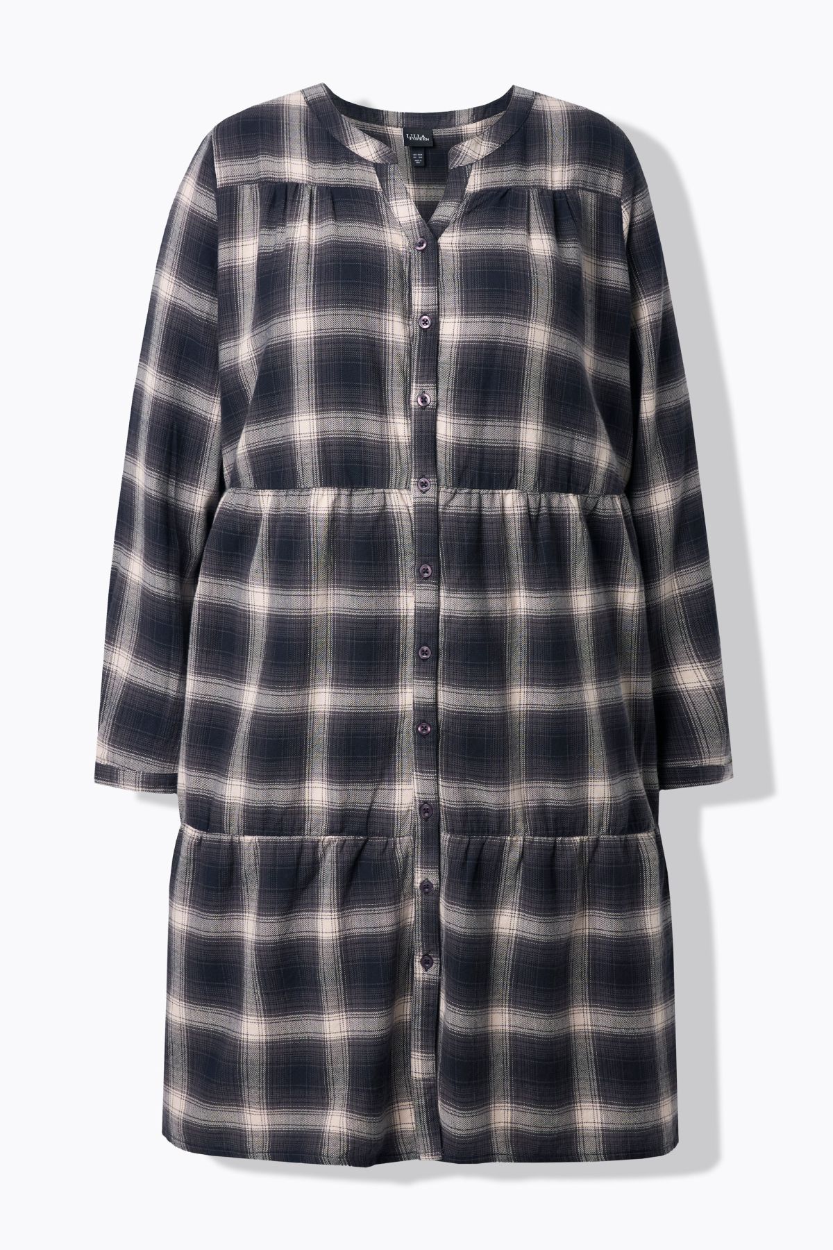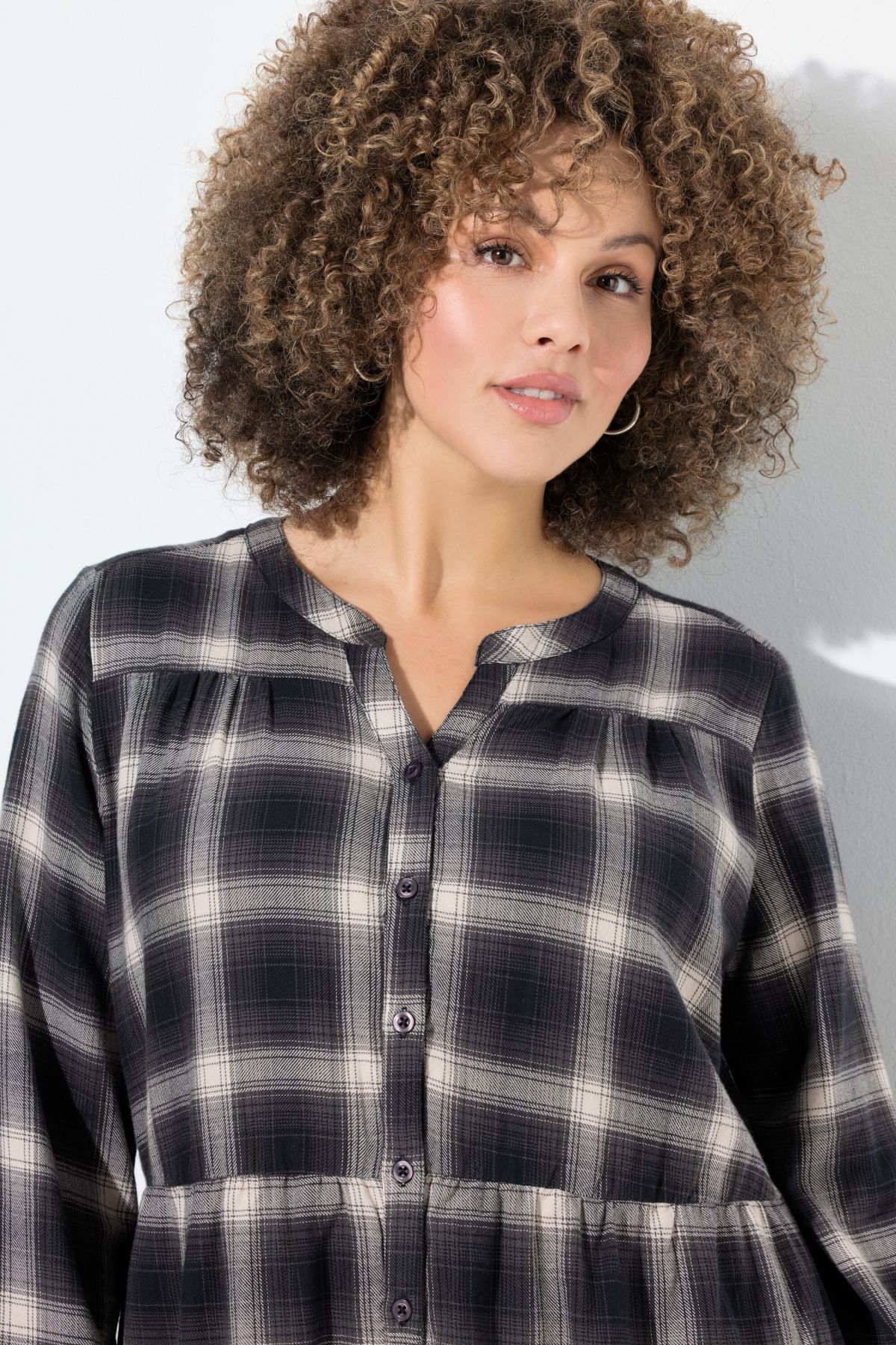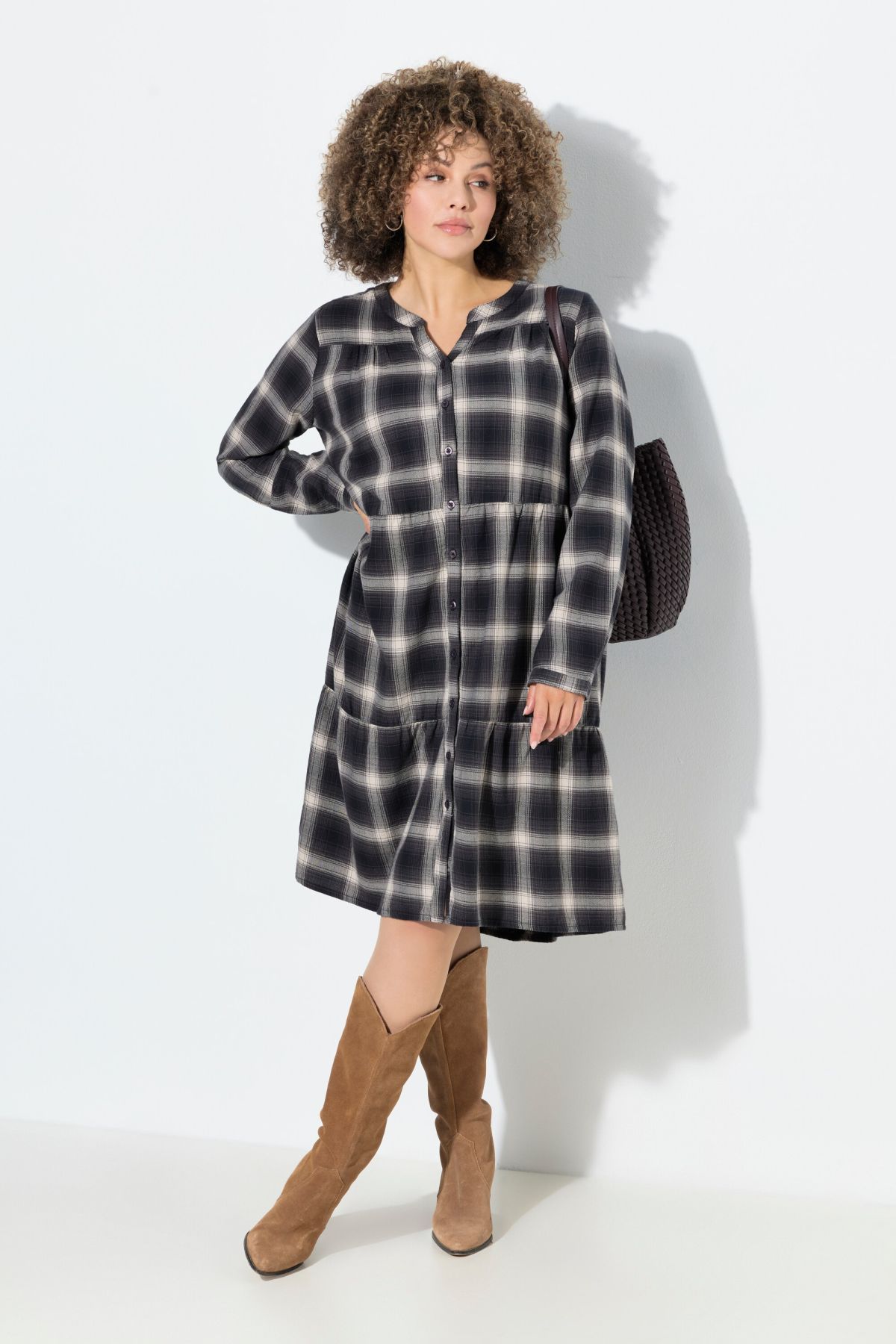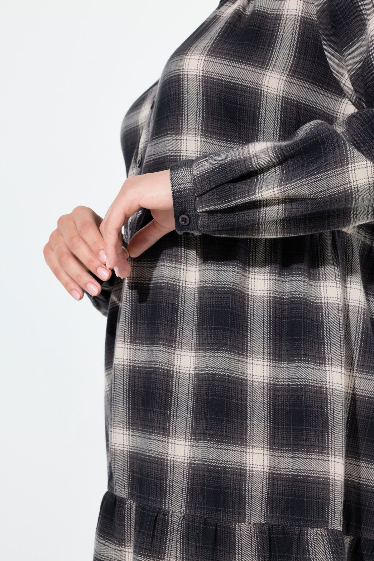Рокля с кариран принт - фаворитът на сезона. С кръгло деколте с цепка и копчета отпред. С разкроени акценти и дълги ръкави с маншет с копче.