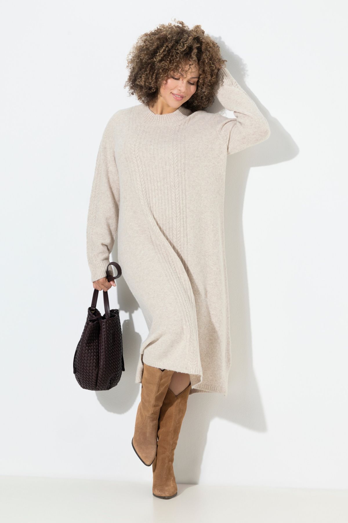 Рокля с модерна кабелна плетка. С кръгло деколте по врата и дълги ръкави. Мека и топла за зимните дни