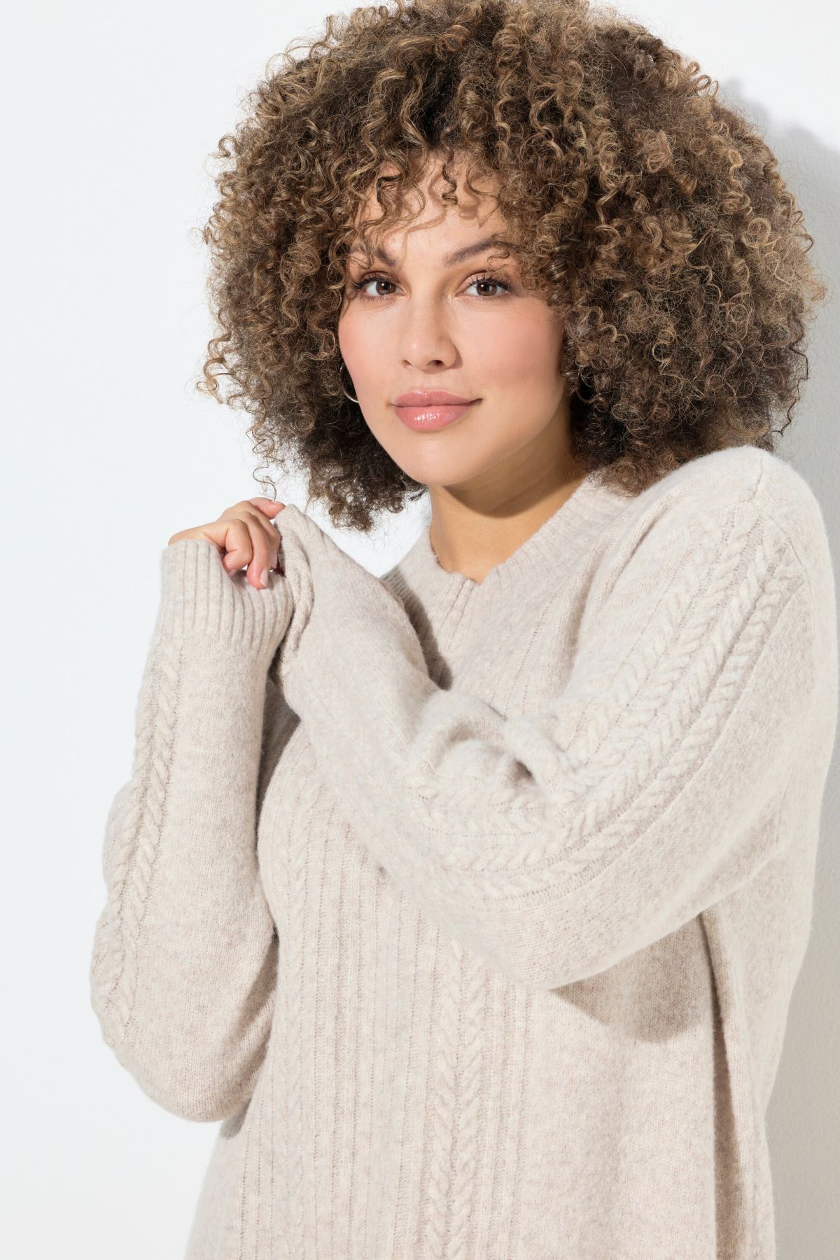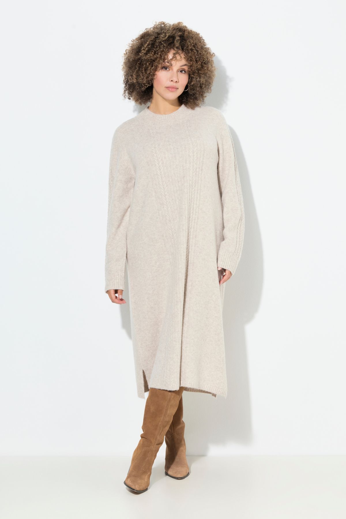 Рокля с модерна кабелна плетка. С кръгло деколте по врата и дълги ръкави. Мека и топла за зимните дни