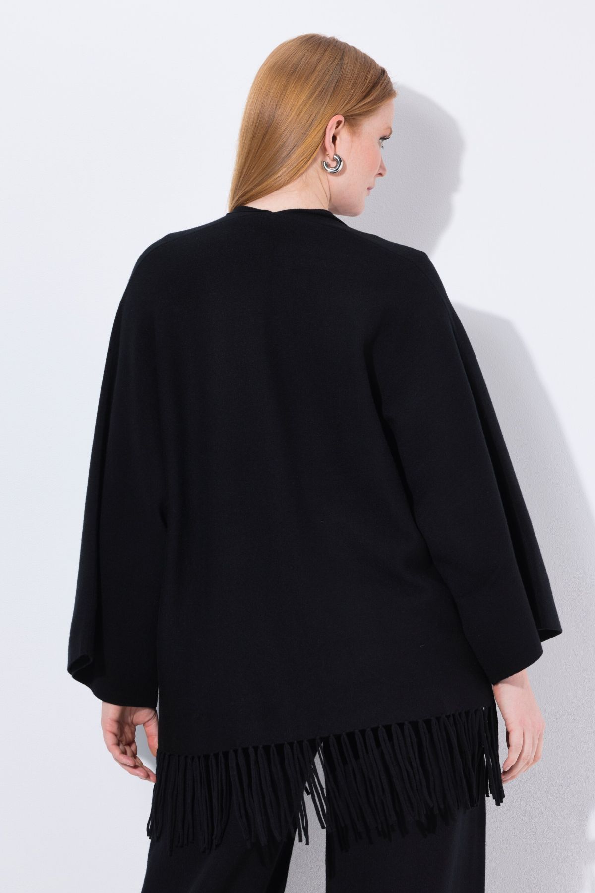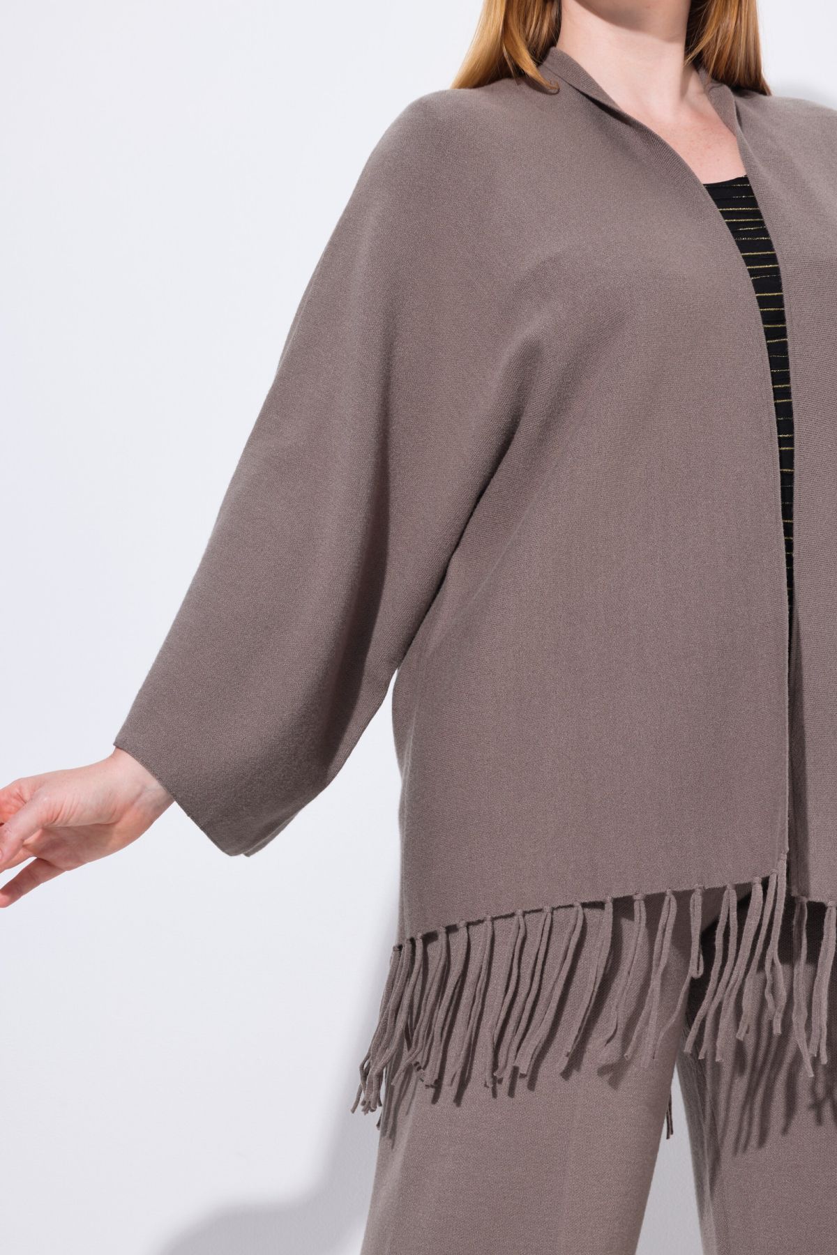 Плетена жилетка с модерни ресни на подгъва в бохо стил. С шал яка, отворена отпред и с дълги, широки ръкави.