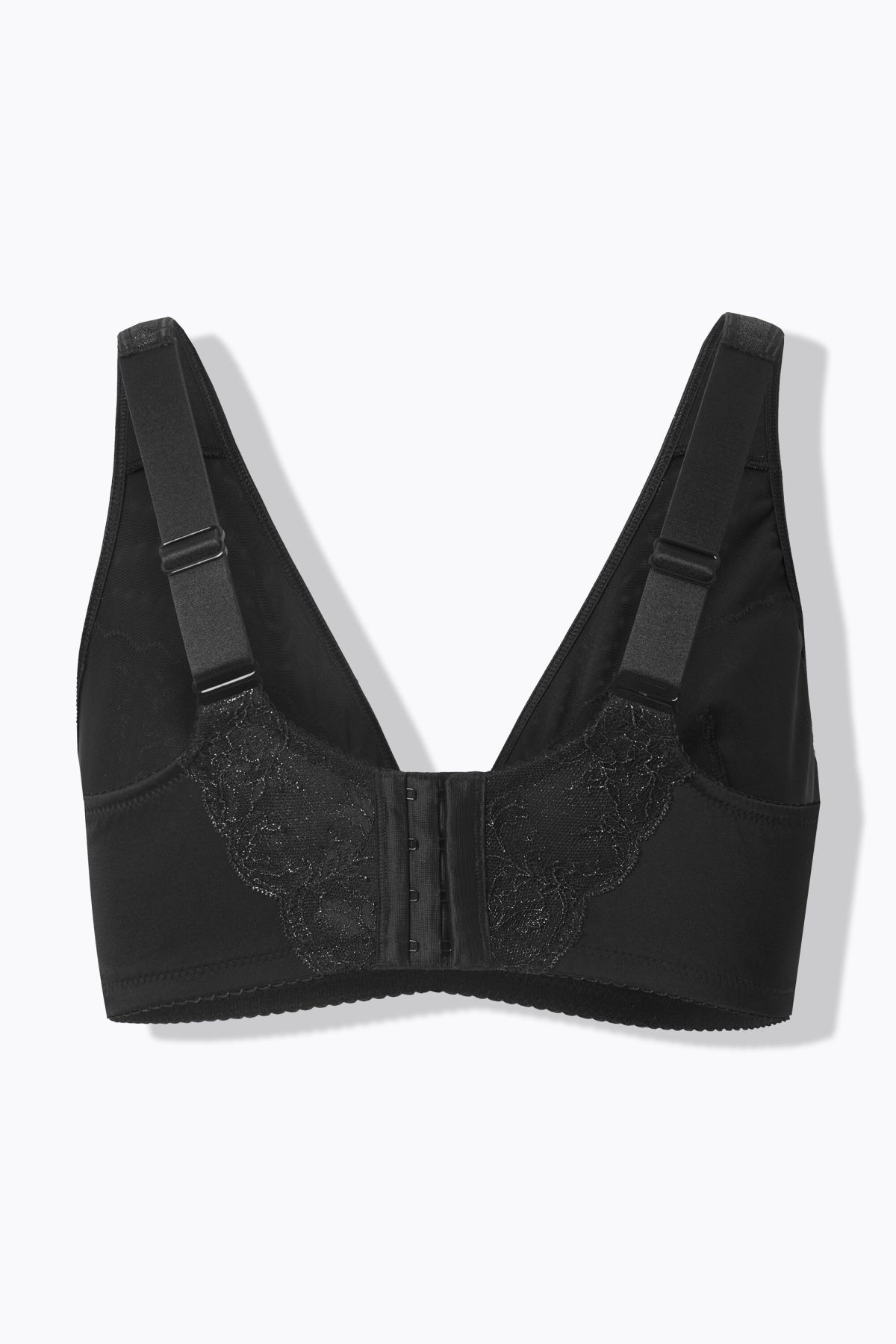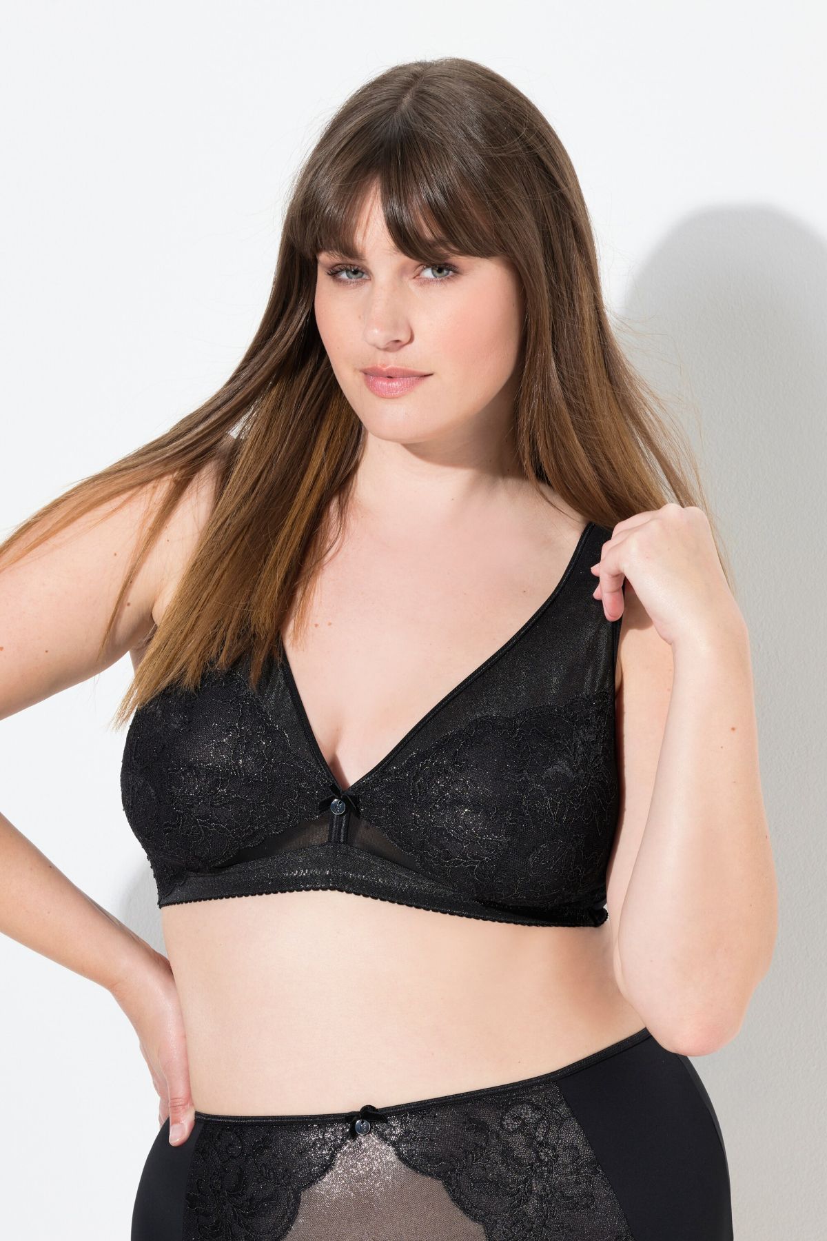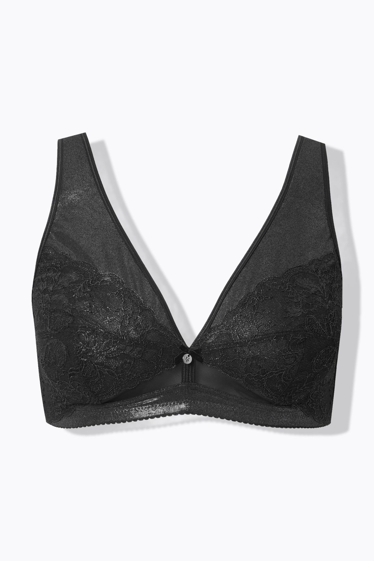 Сутиен с дантела и метални акценти. За допълнителен комфорт е без банели. С V - образно деколте. С широки, комфортни презрамки и задно закопчаване с метални кукички.