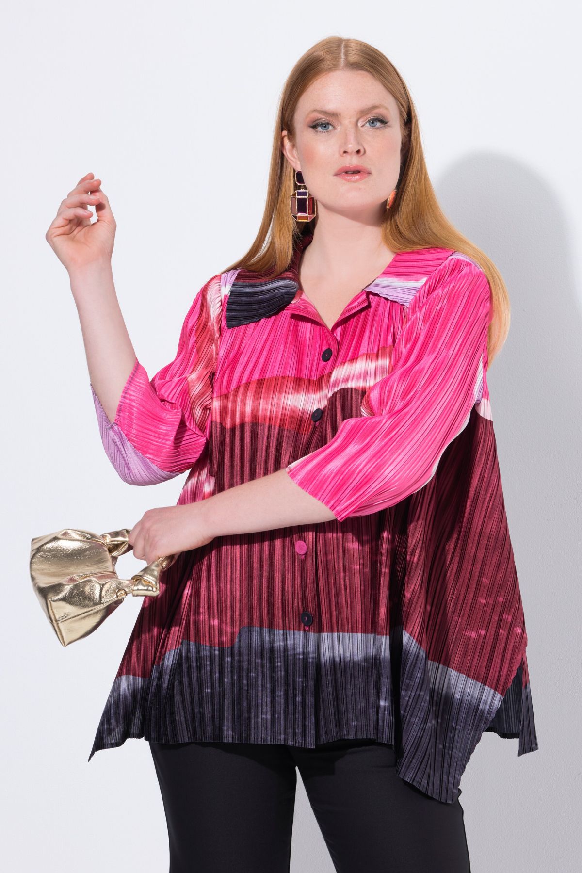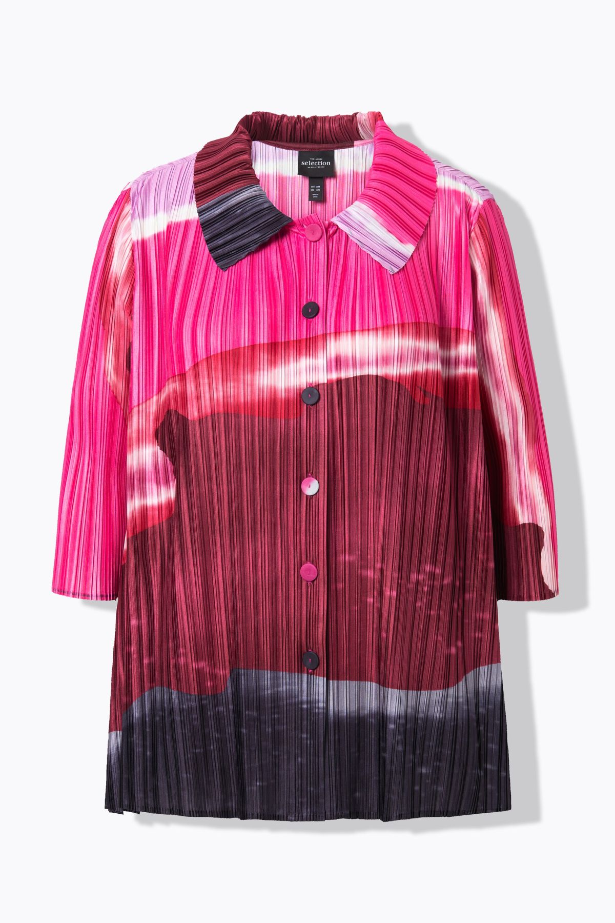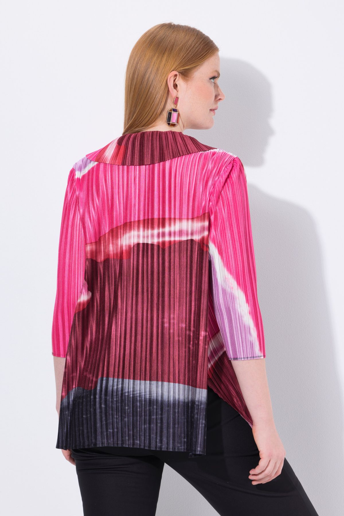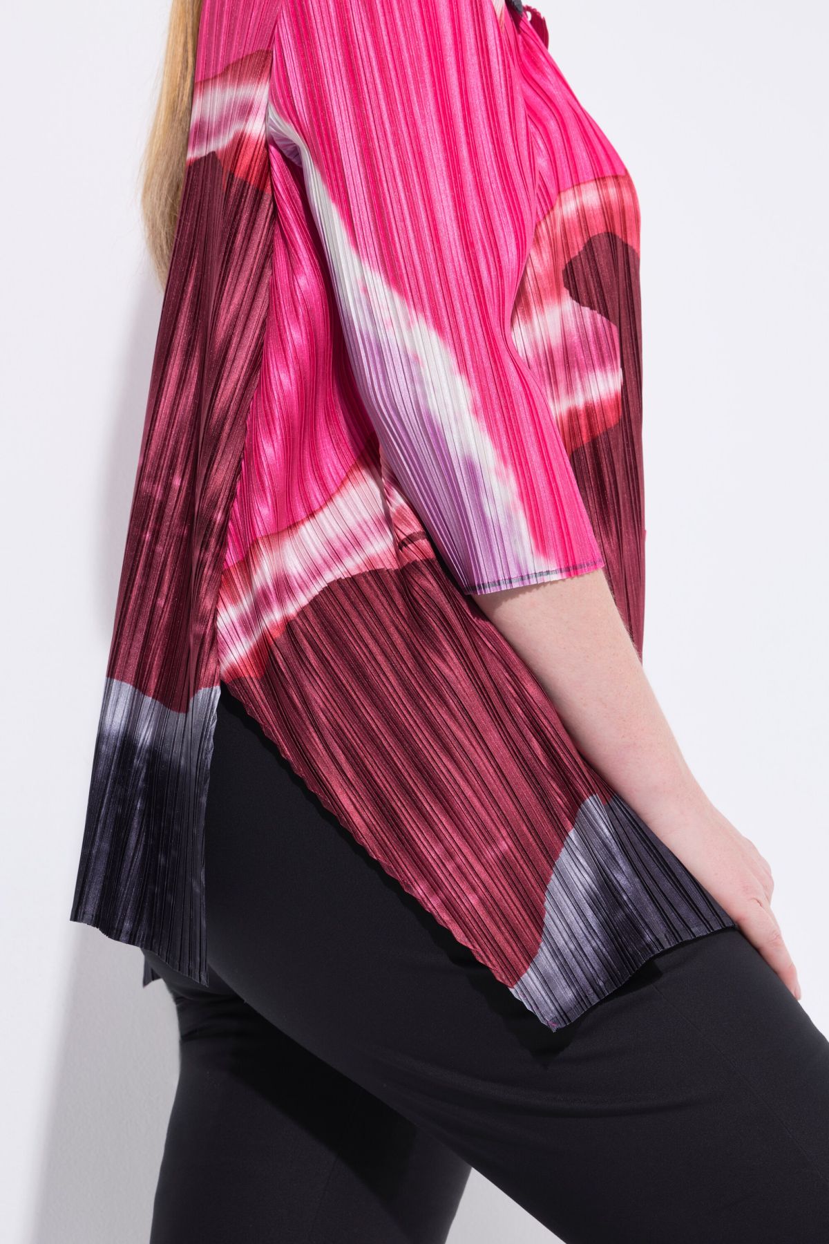 Риза с плисирана визия с акварелни райета. Дизайн с яка, копчета отпред и 3/4 ръкави и разкроен прилеп силует.