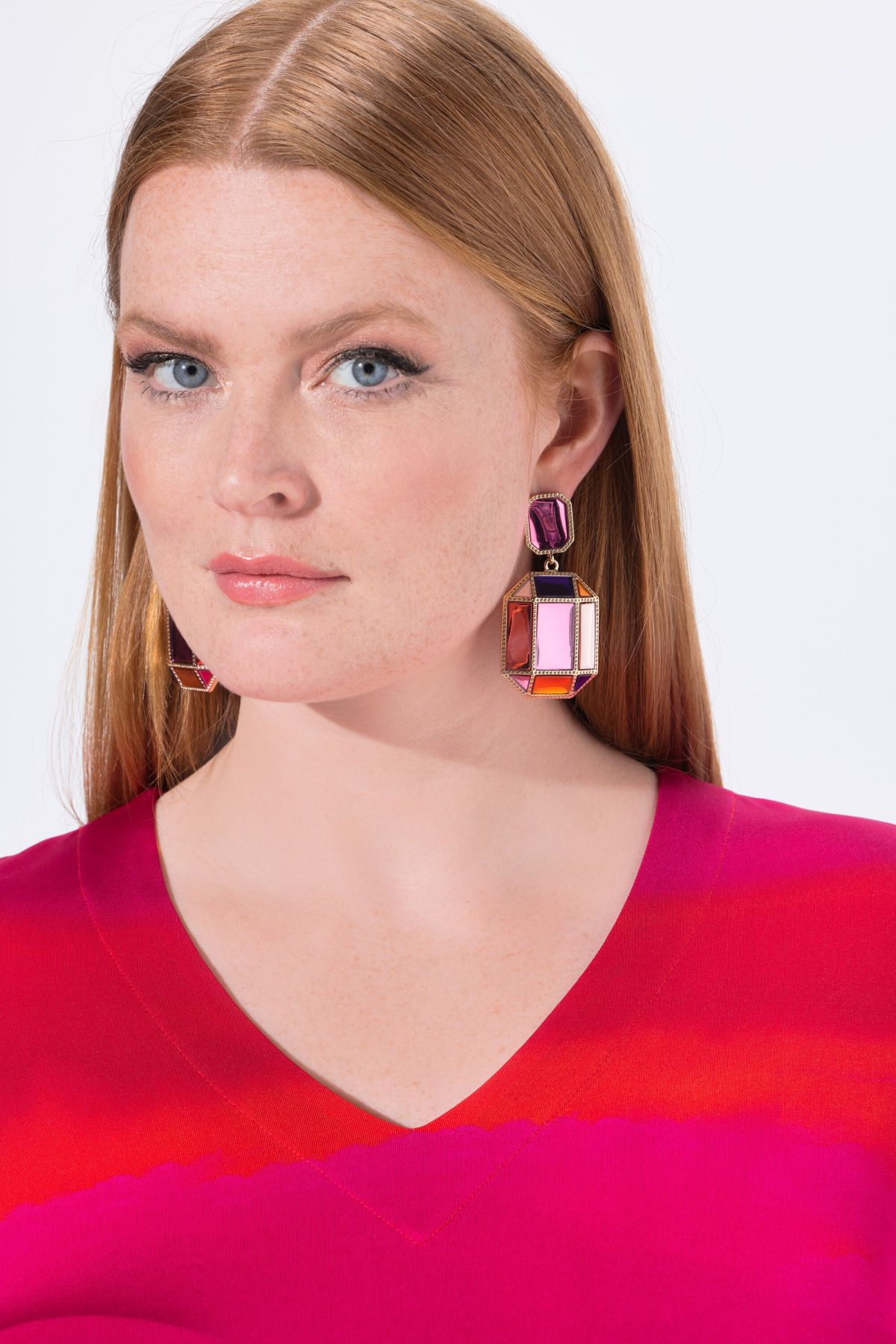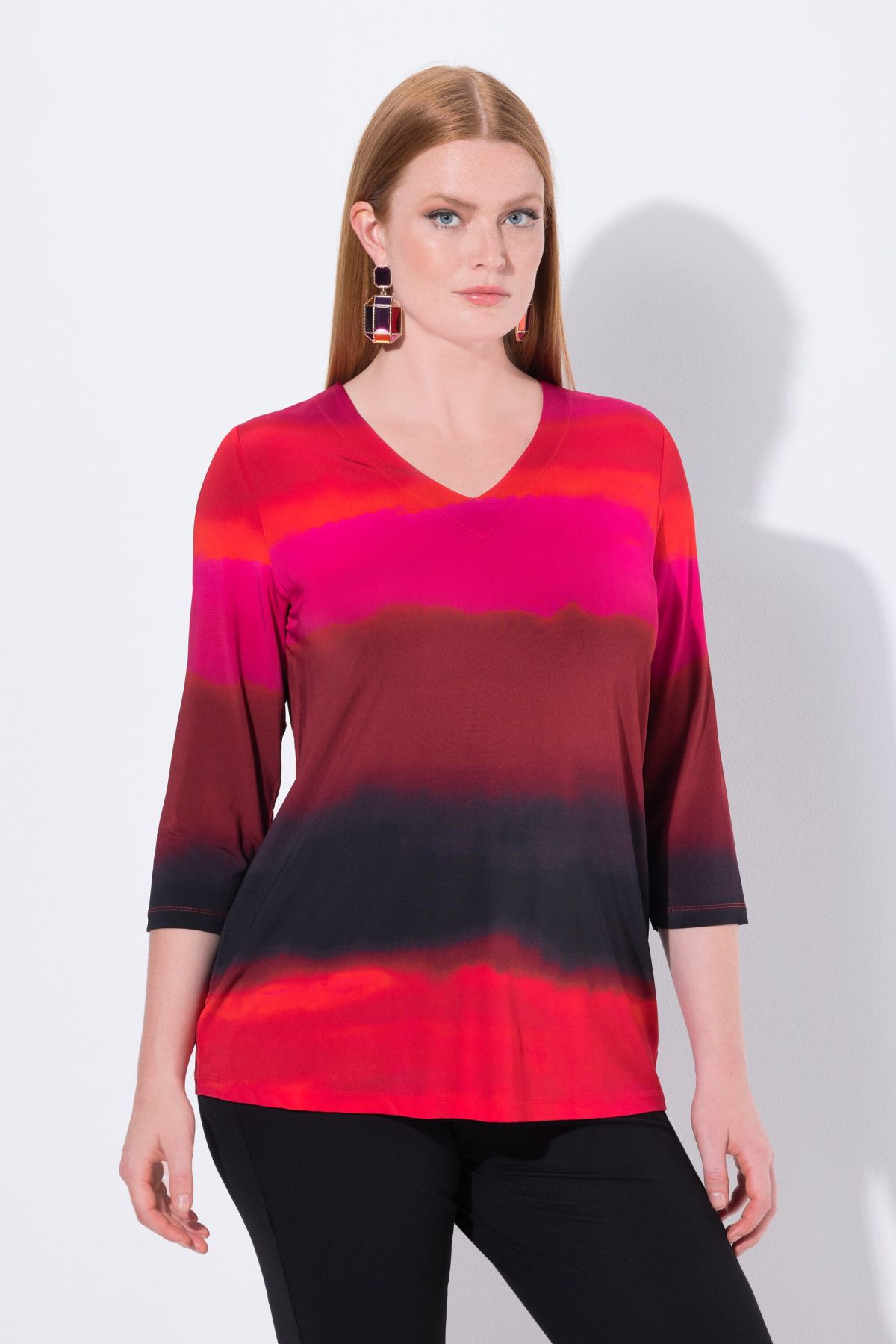 Тениска с принт на акварелни райета. С V - образно деколте и 3/4 ръкави. От висококачествена еластична материя.