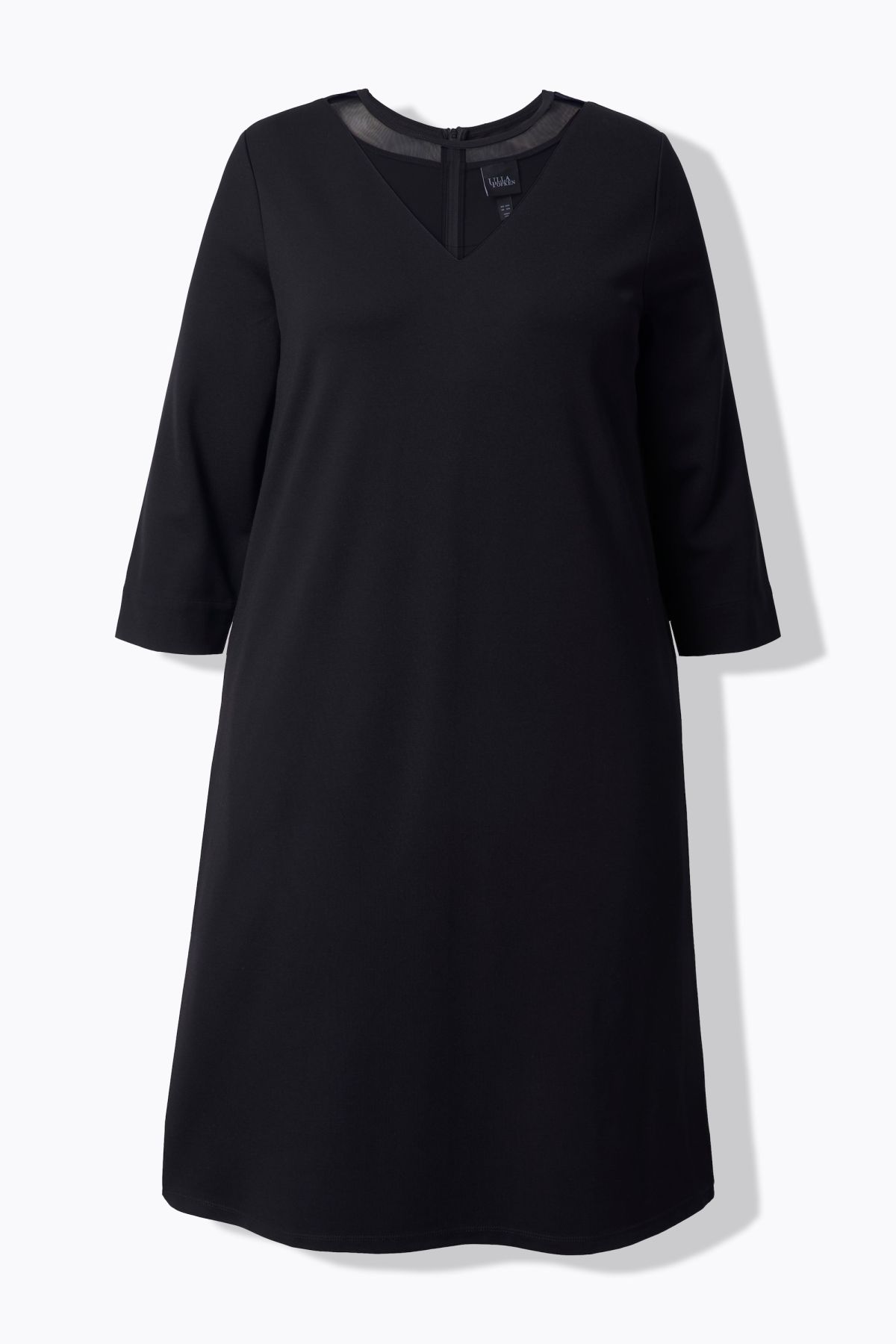Рокля с мрежести акценти на кръглото деколте. С 3/4 ръкави и разкроена пола. Стилна и комфортна за ежедневието