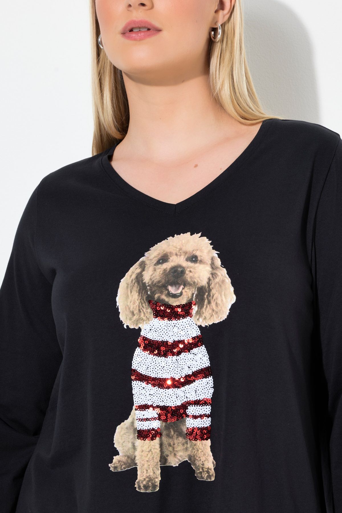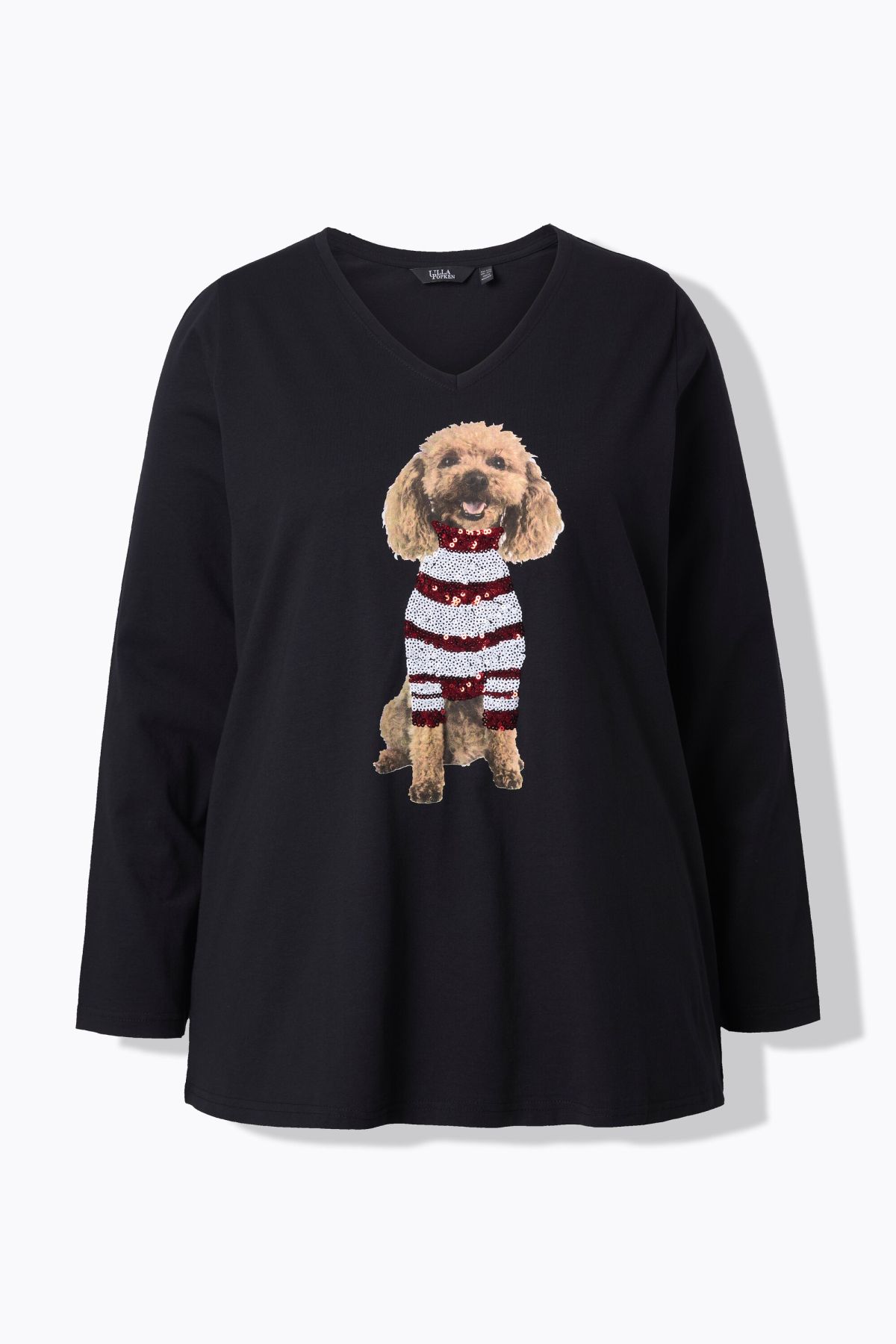 Блуза с коледен принт на куче с пайетени акценти. Твоят фаворит на сезона. С V - образно деколте и дълги ръкави. От мека, памучна материя.