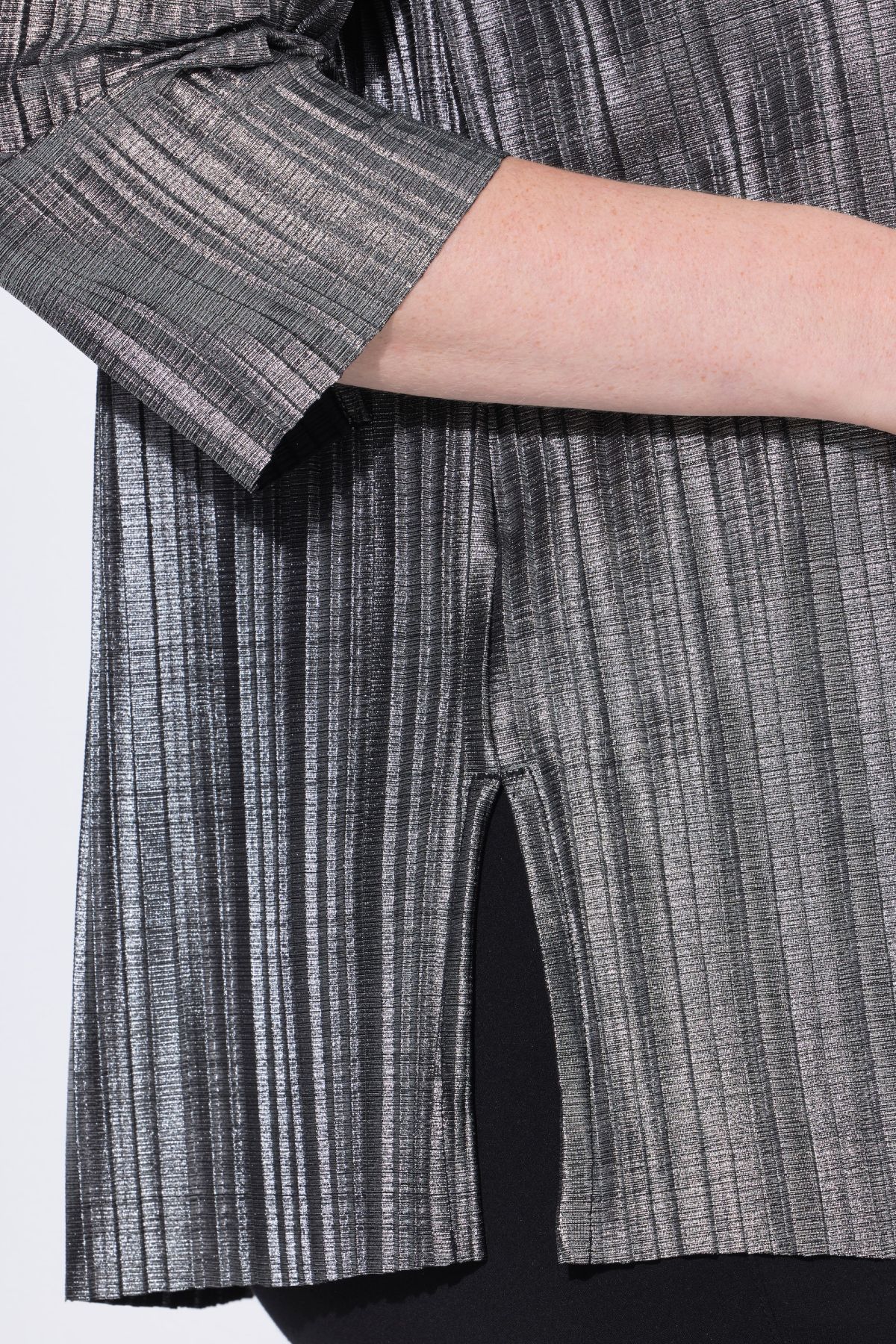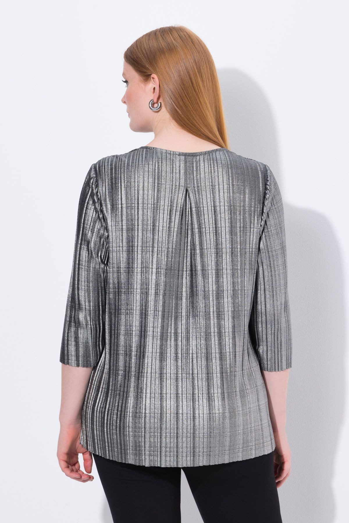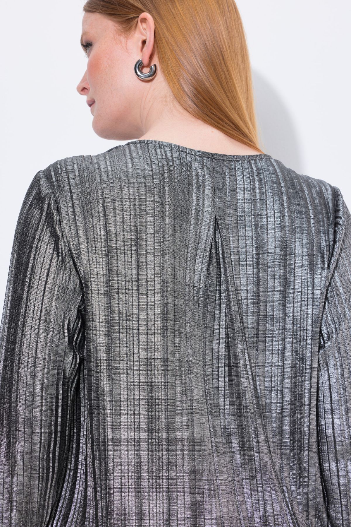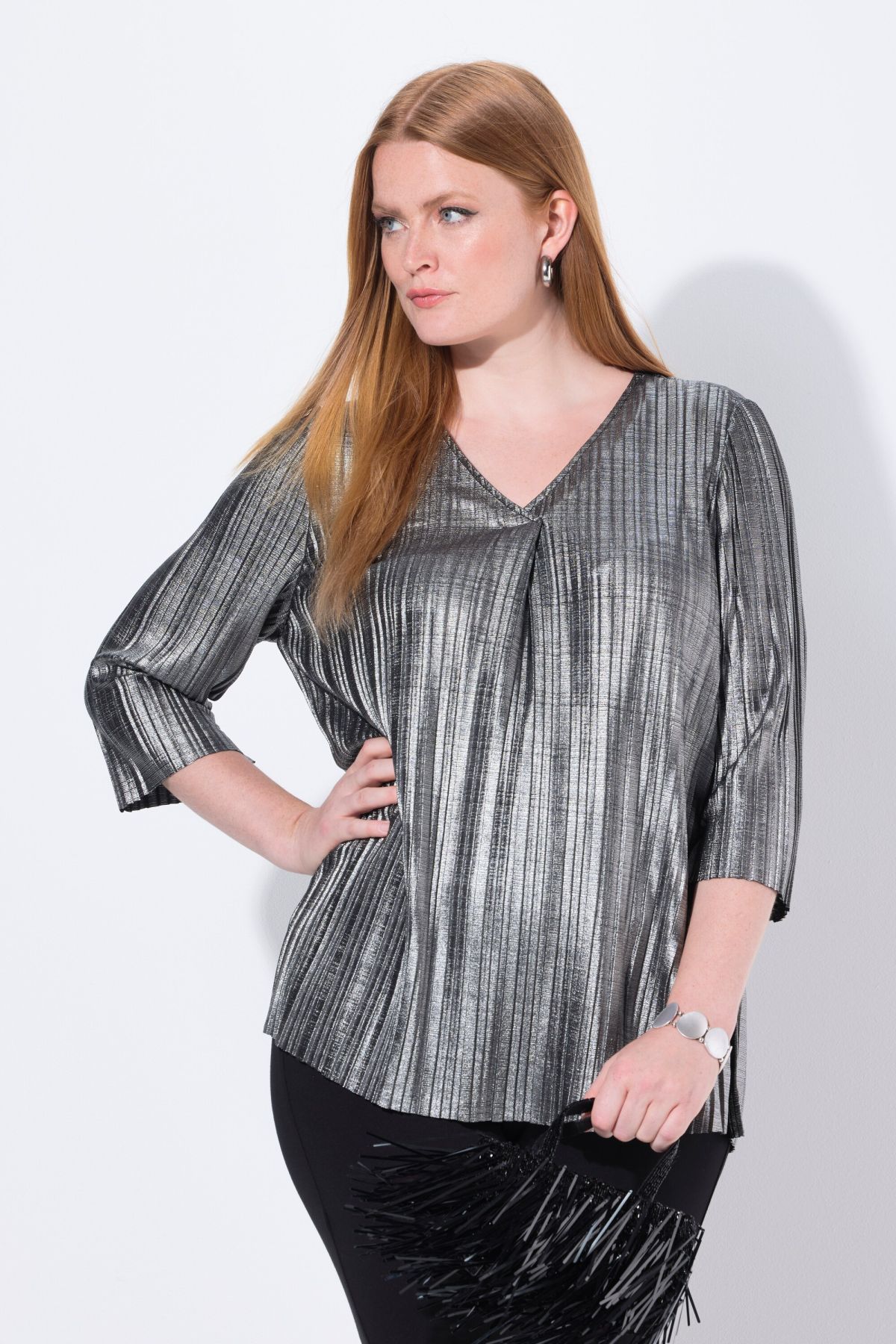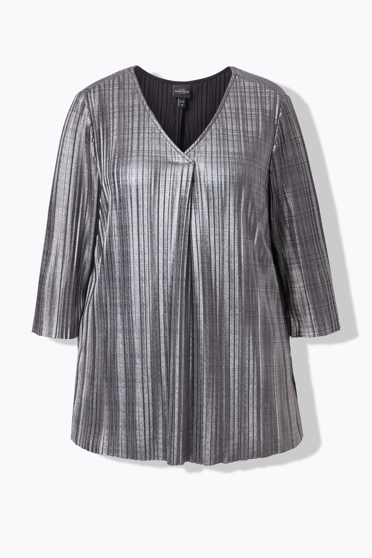 Фини, сребристи плисета, V-образно деколте с декоративна плисе, удобна А-силует със странични цепки, 3/4 ръкави, меко падащо качество, дължина, регулирана по размер, приблизително 72-76 см.