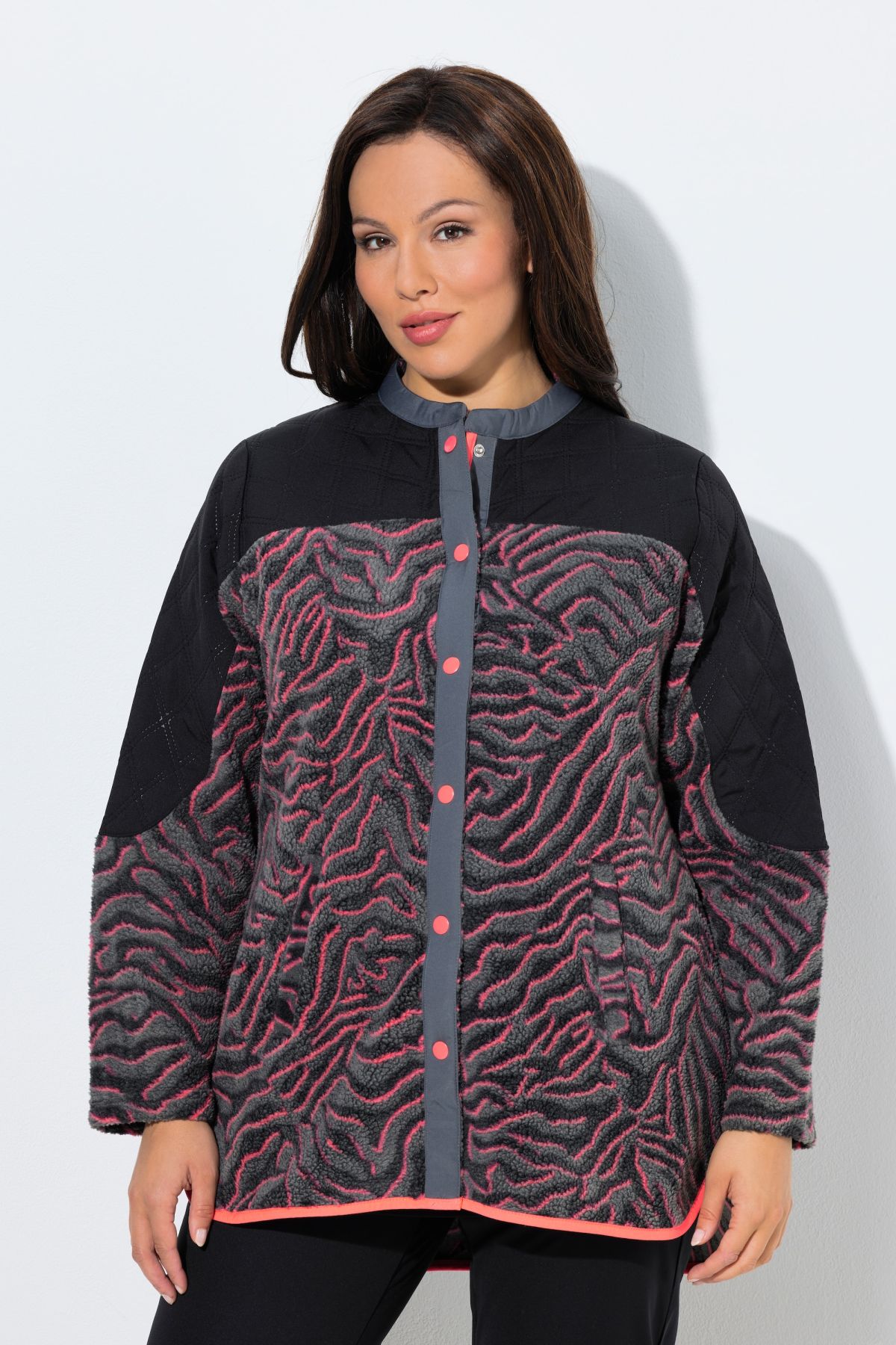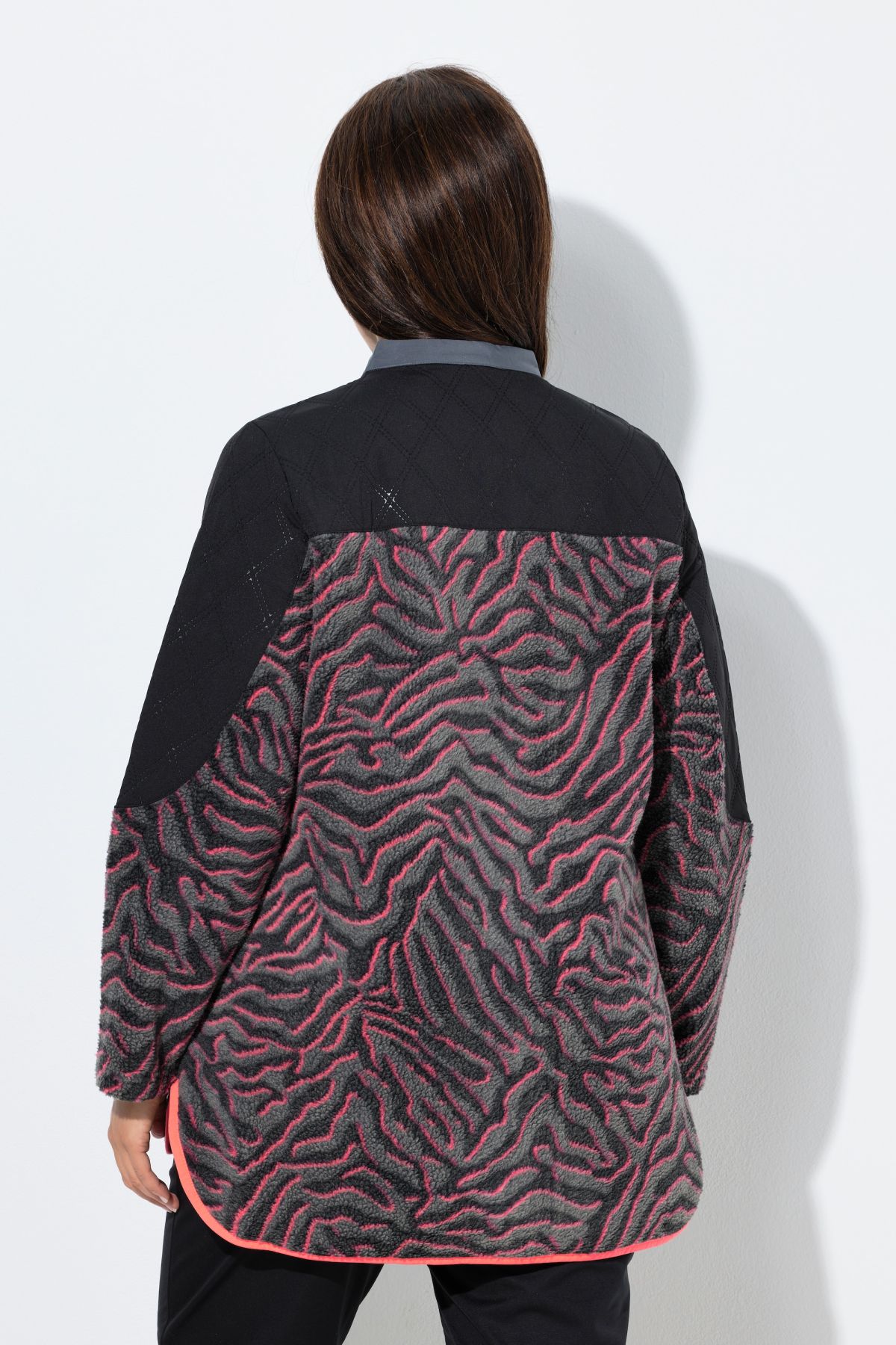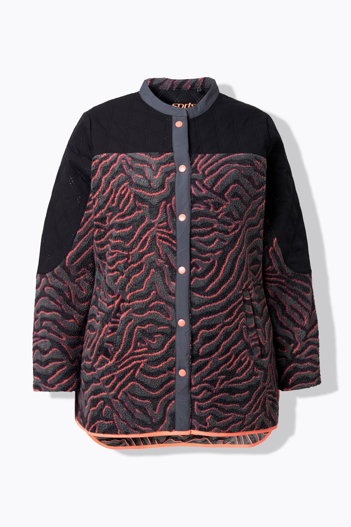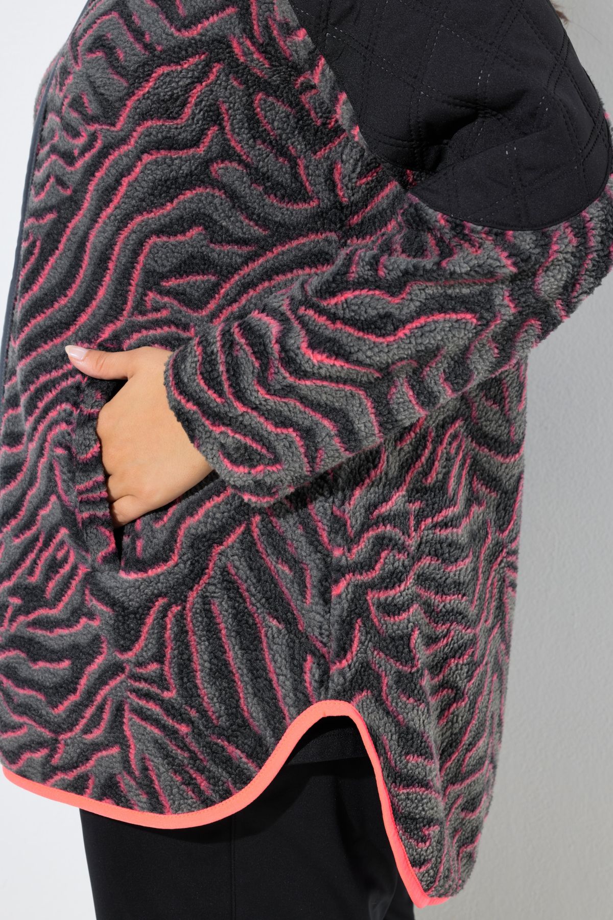 Яке с неонови райета в тигров стил. От мек, топъл полар с копчета отпред и малка изправена яка. Със странични джобове и дълги ръкави.