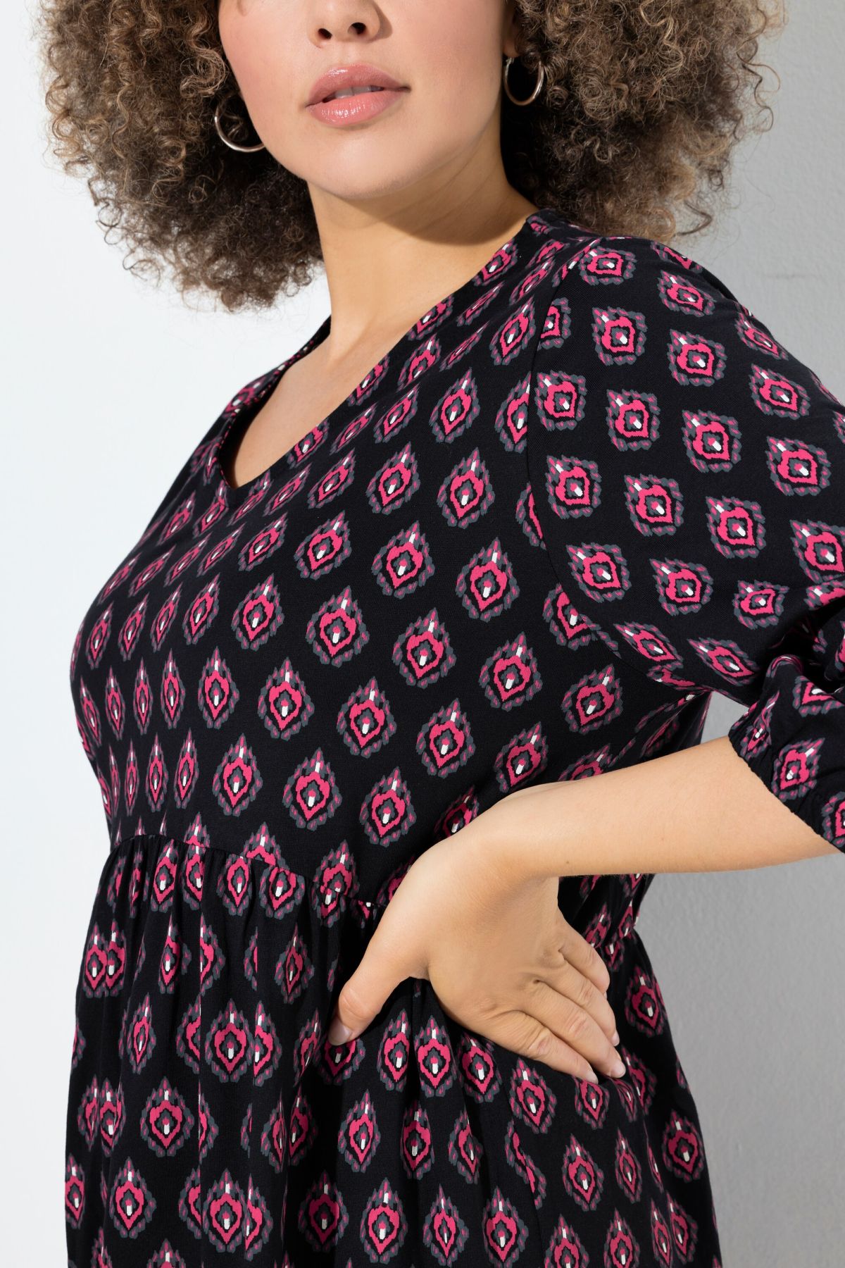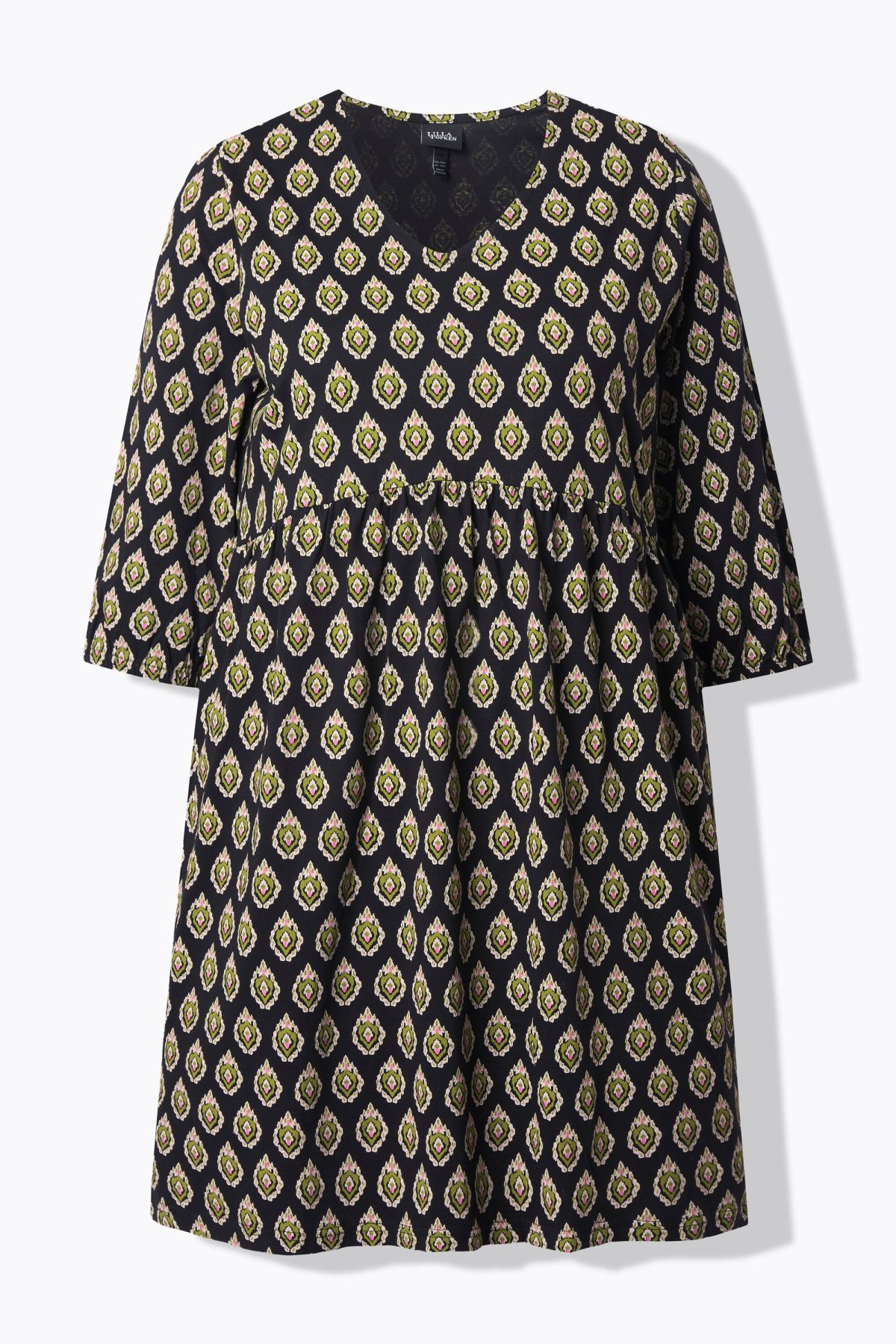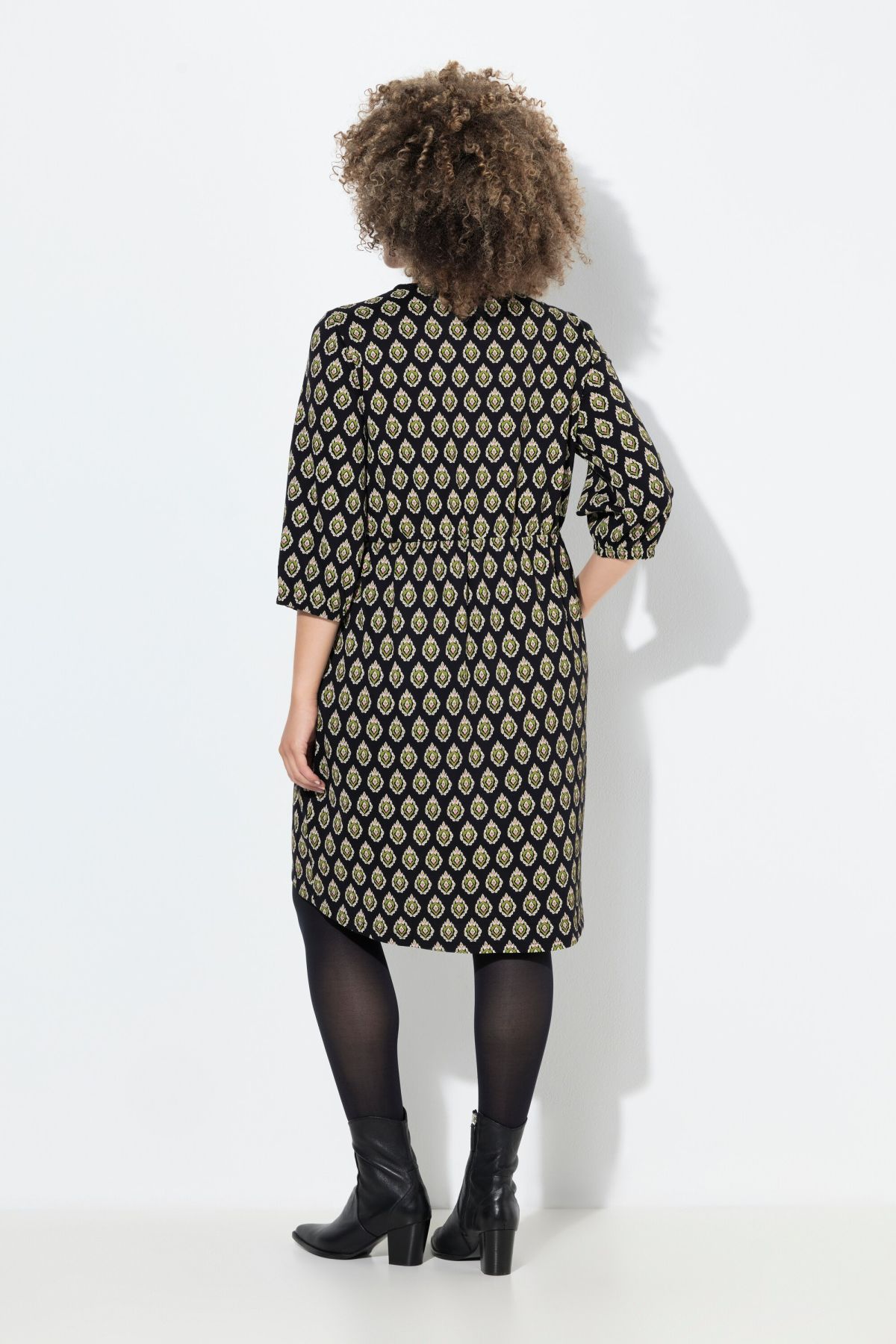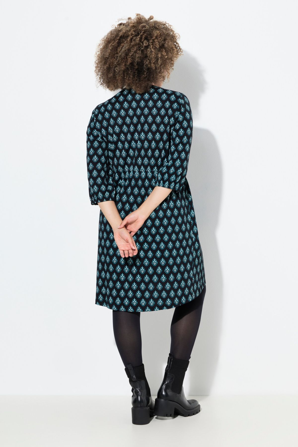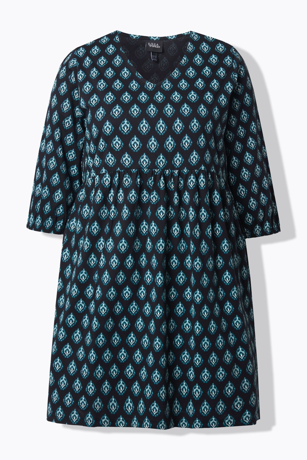 Трикотажна рокля с модерен принт. С комфортна А - линия на силуета. С кръгло деколте, шевов акцент на талията и перфектна дължина.
