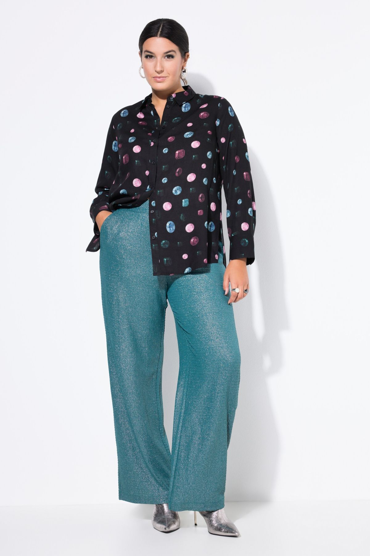 Панталон с широки крачоли с бляскави акценти - вдъхновени от 70те години. С фиксирана талия с гайки за колан, копче и цип отпред и странични джобове.