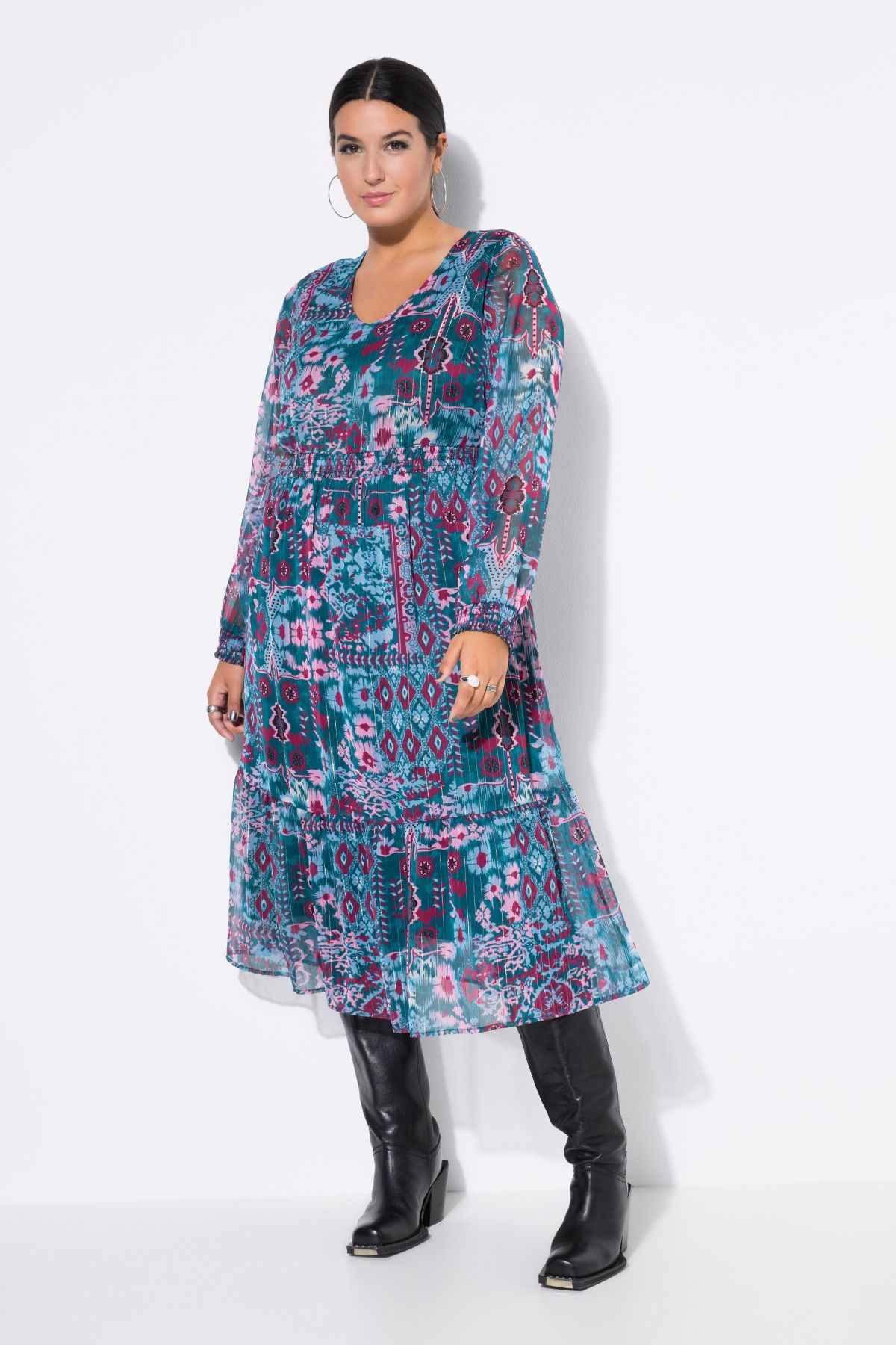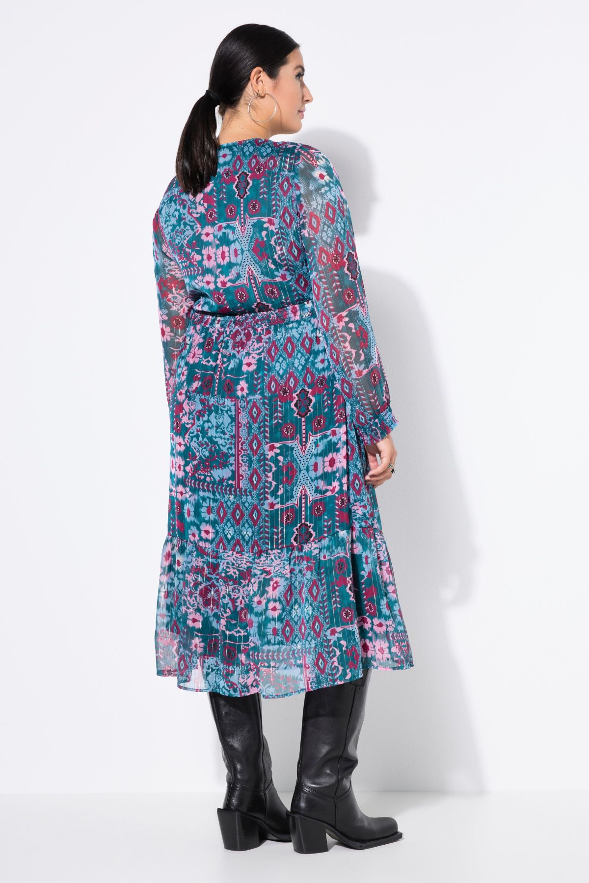 Рокля с бляскав пач принт с класическа визия. С шевов акцент на талията с разкроения, непрозрачна памучна подплата и прозрачни дълги ръкави с маншет с копче. С кръгло деколте.