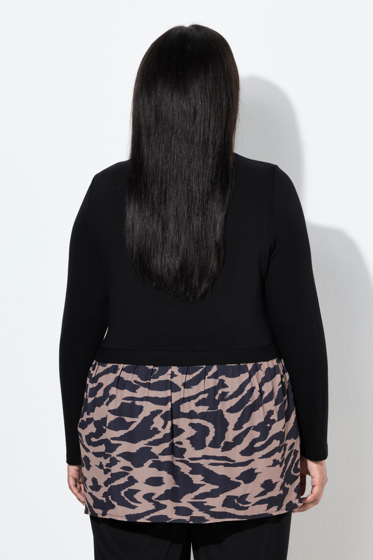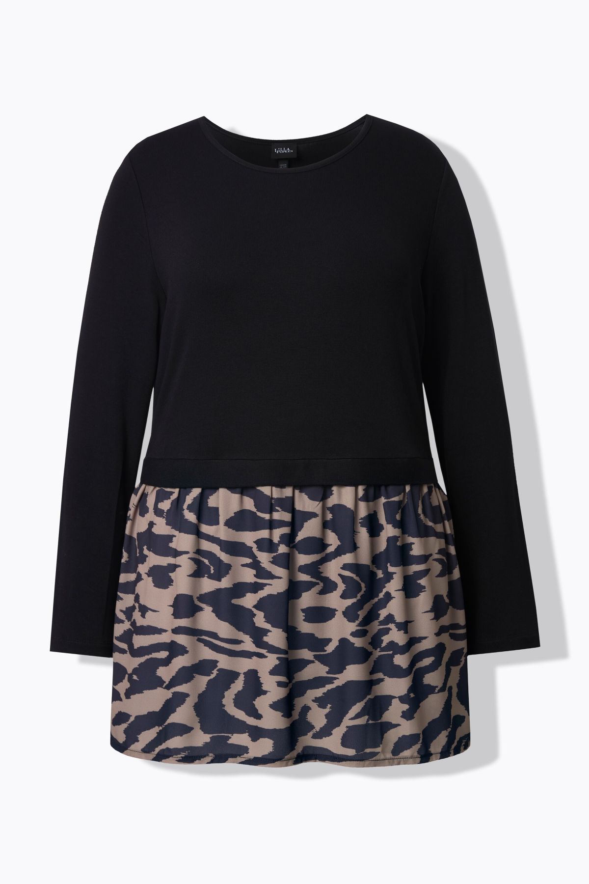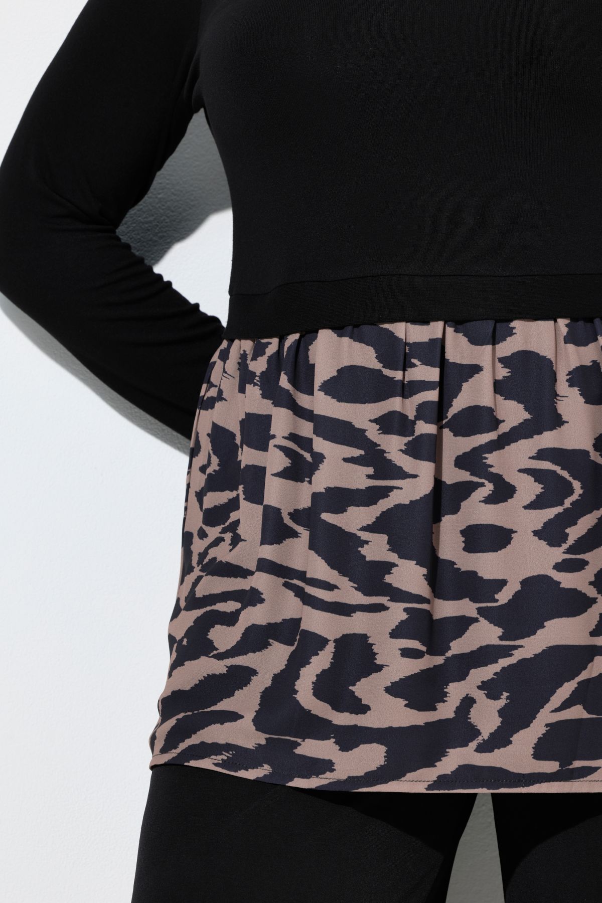 Туника с животински принт с А - линия на силуета.. С разкроен подгъв. С кръгло деколте с цепка и дълги ръкави. Перфектна за комбиниране с клин или панталон