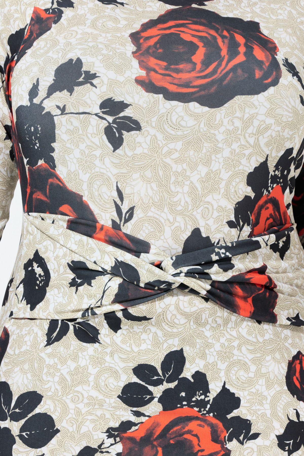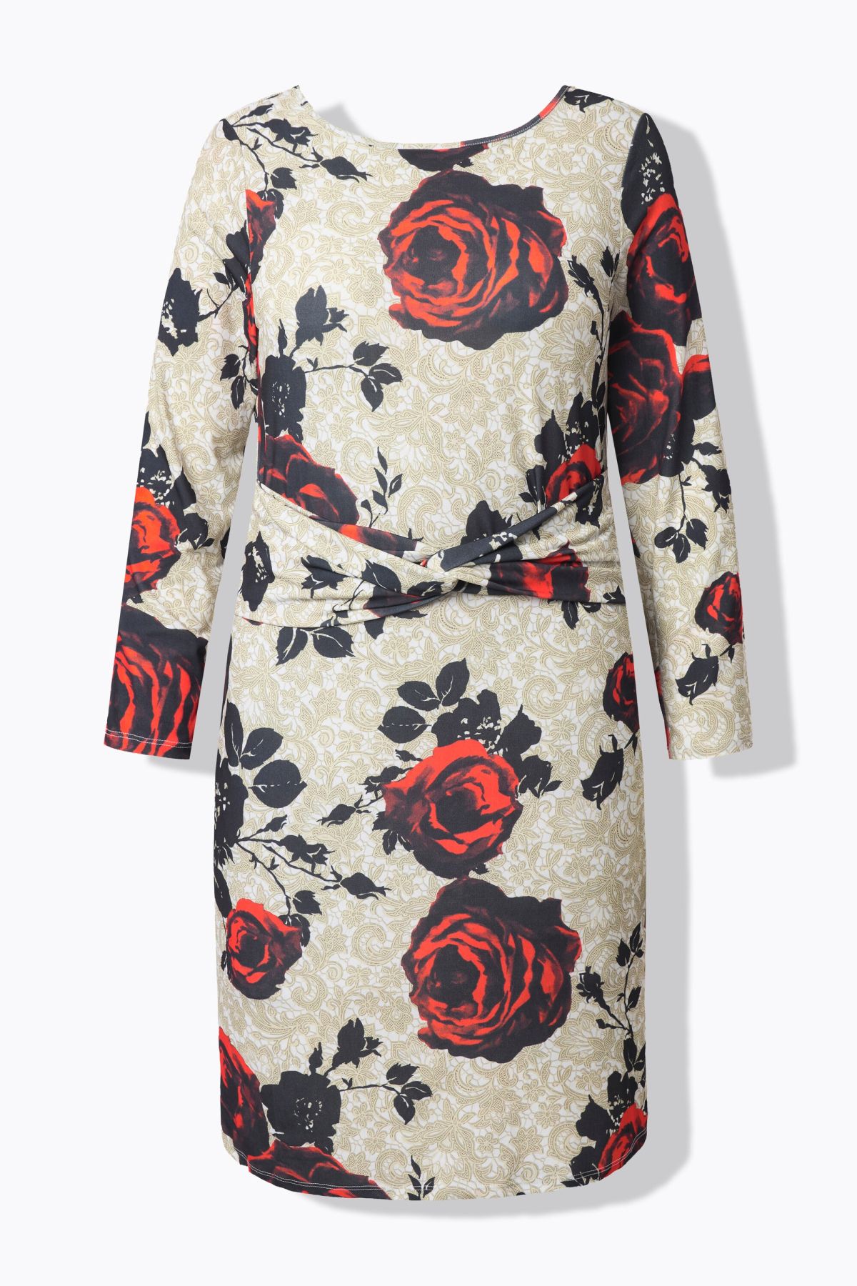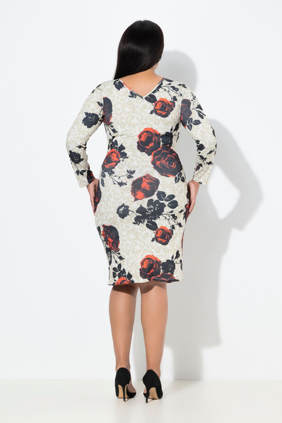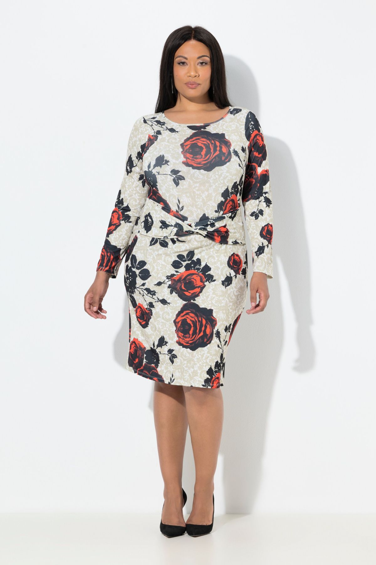 Рокля с принт на рози с романтична визия. С кръгло деколте, дълги ръкави, шевов акцент на талията и перфектна дължина. Готови ли сте за парти?