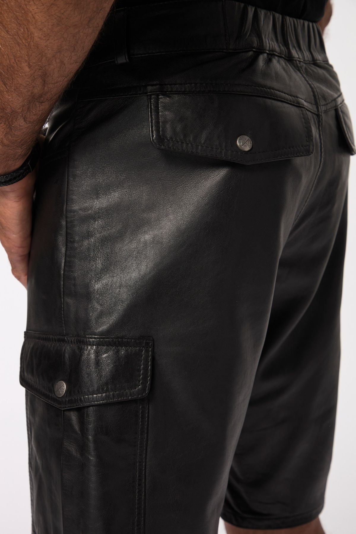 Бермуди от мека агнешка кожа. Комфортен, прав силует с еластична талия и връзка. С карго джобове с капаци и копчета. С цип и комфортна подплата.