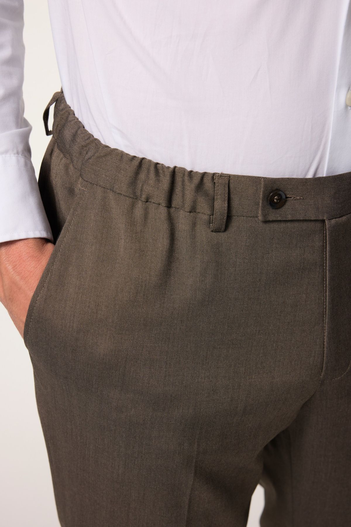 Елегантен панталон JP 1880 тип Amalfi от еластична материя. С фиксирана талия с еластични акценти, гайки за колан, копче и цип отпред. С 2 странични джоба. Перфектно се комбинира със сако 836721331