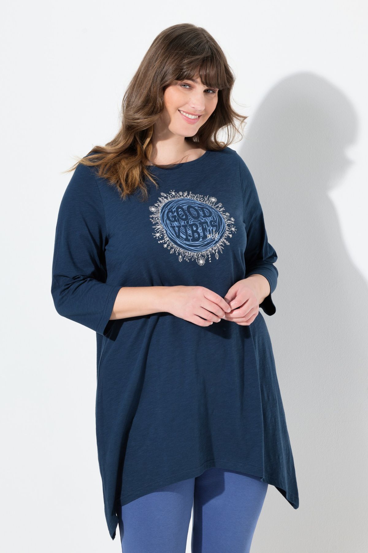 Тениска с графичен принт с асиметричен подгъв. С издължена кройка тип туника, деколте тип лодка и дълги ръкави. От мека, памучна материя.