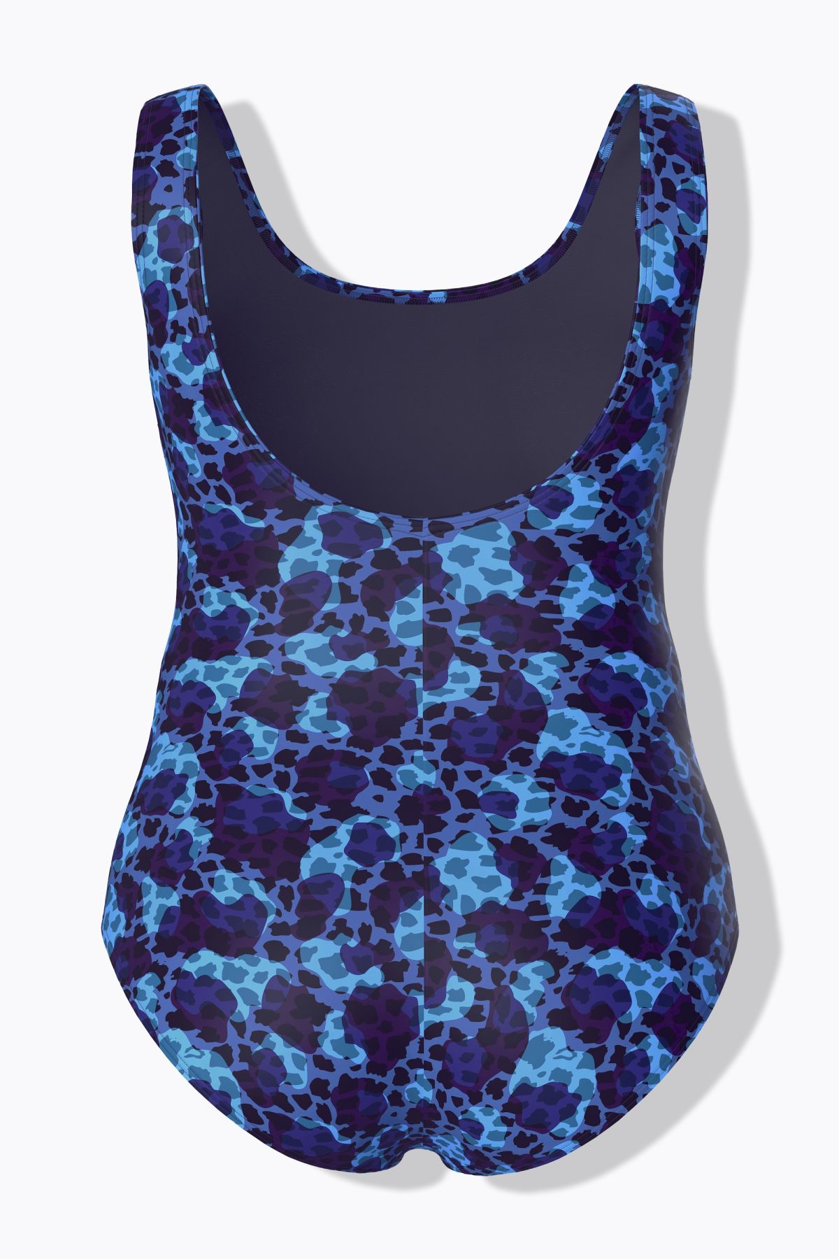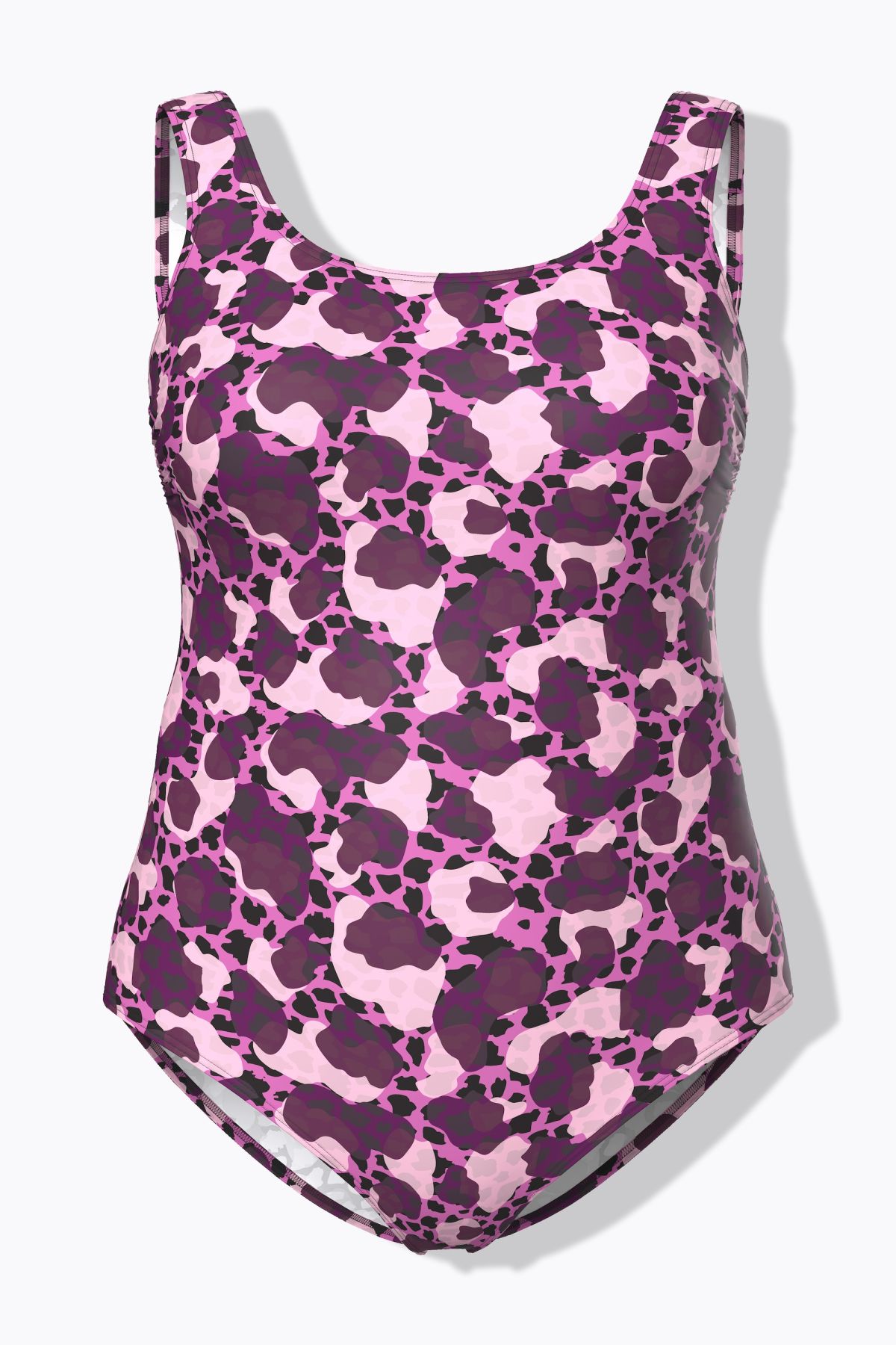Бански с камуфлажен принт. В спортен силует, без оформени чашки, еластична лента под бюста, кръгло деколте и широки, комфортни презрамки.
